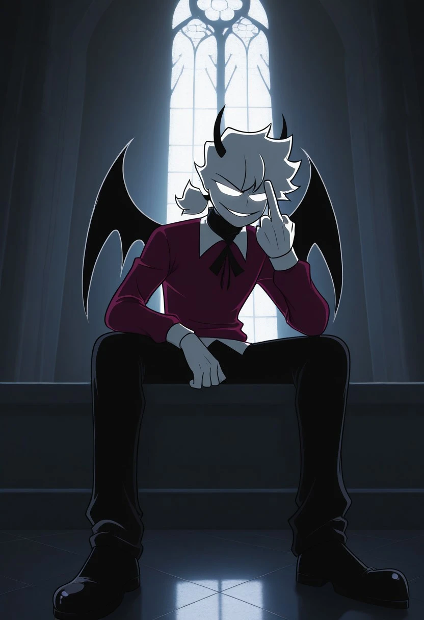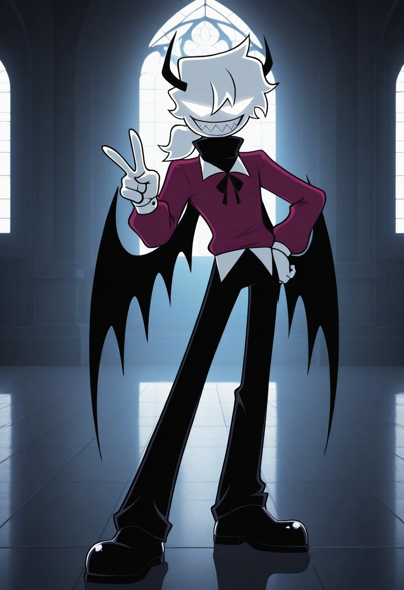 Selever, white skin, short white hair, solid white eyes, ponytail, black horns, black demon wings, maroon shirt, white collar, black pants