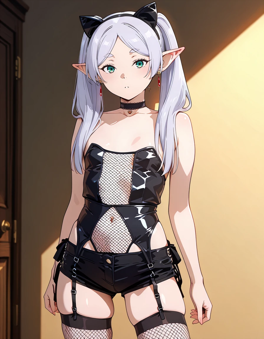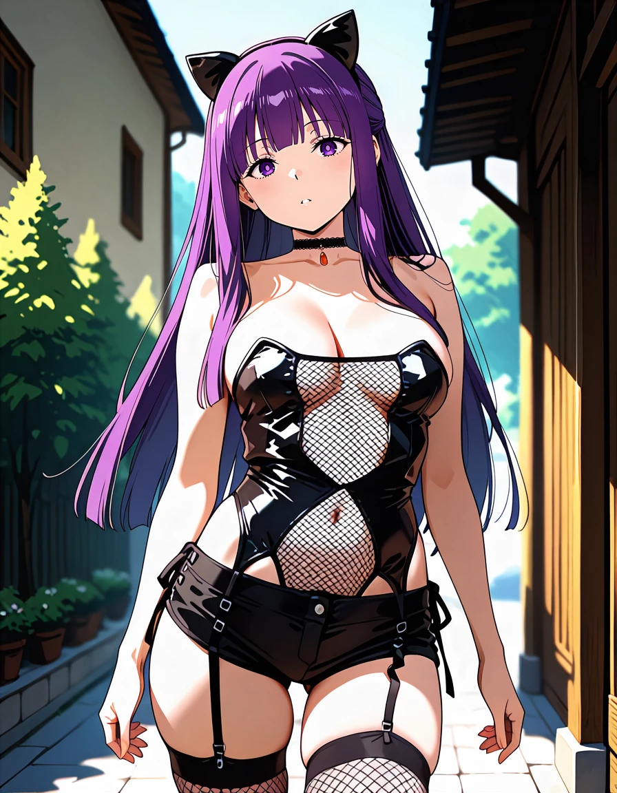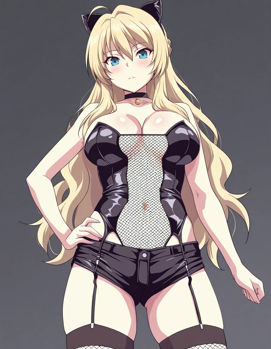 mai_fishnet_leotard,black_choker,garter_straps,thighhighs,black_shorts,fake_cat_ears,navel