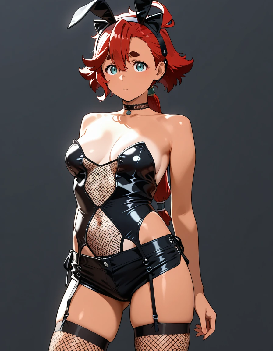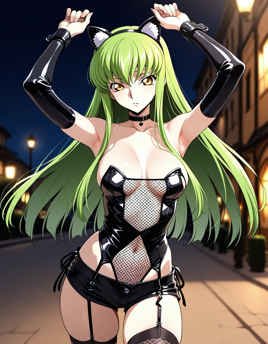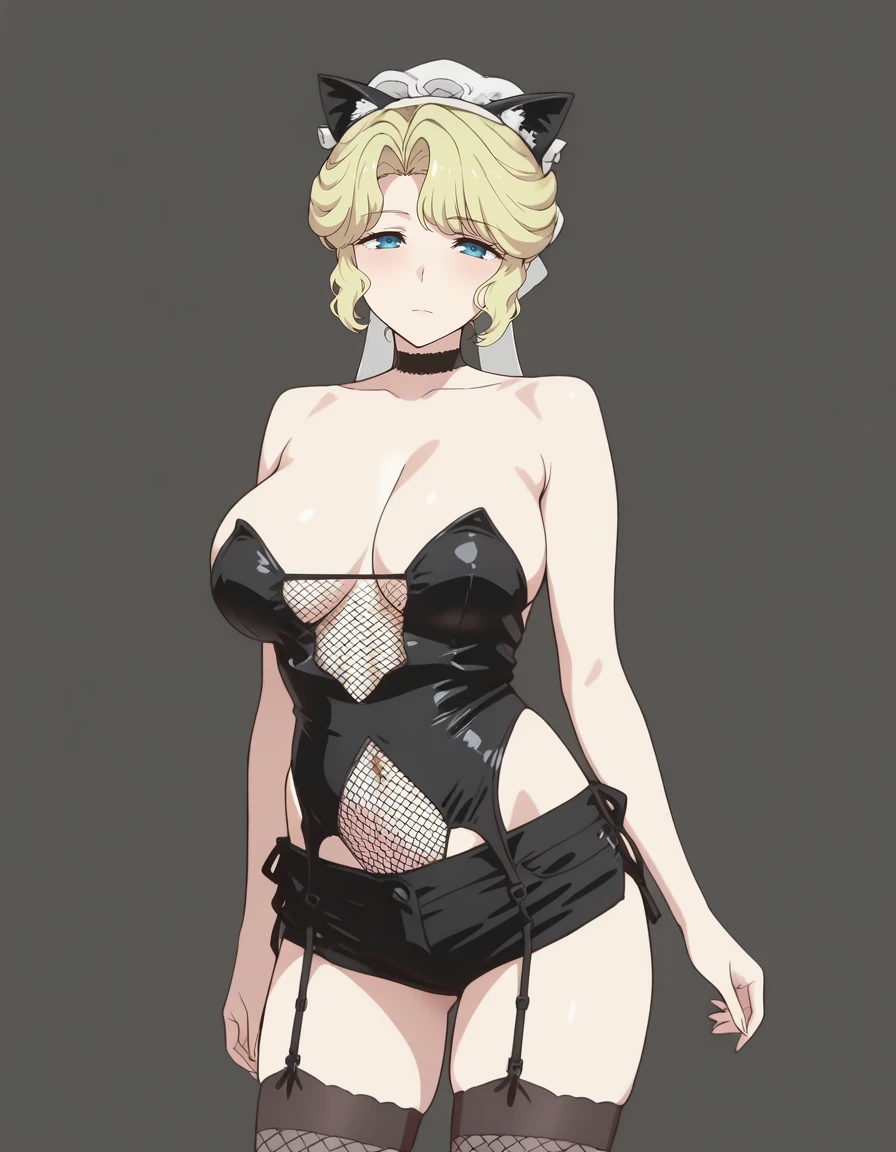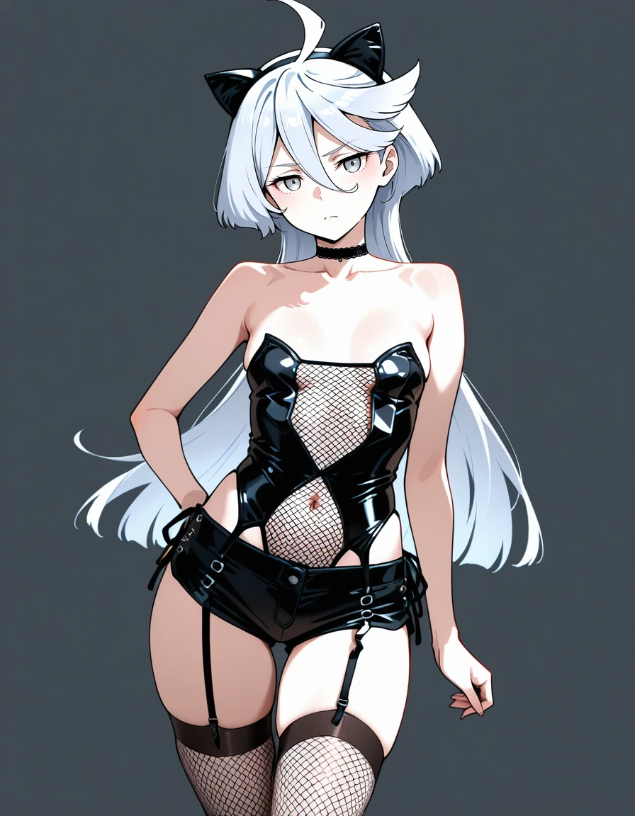 mai_fishnet_leotard,black_choker,garter_straps,thighhighs,black_shorts,fake_cat_ears,navel