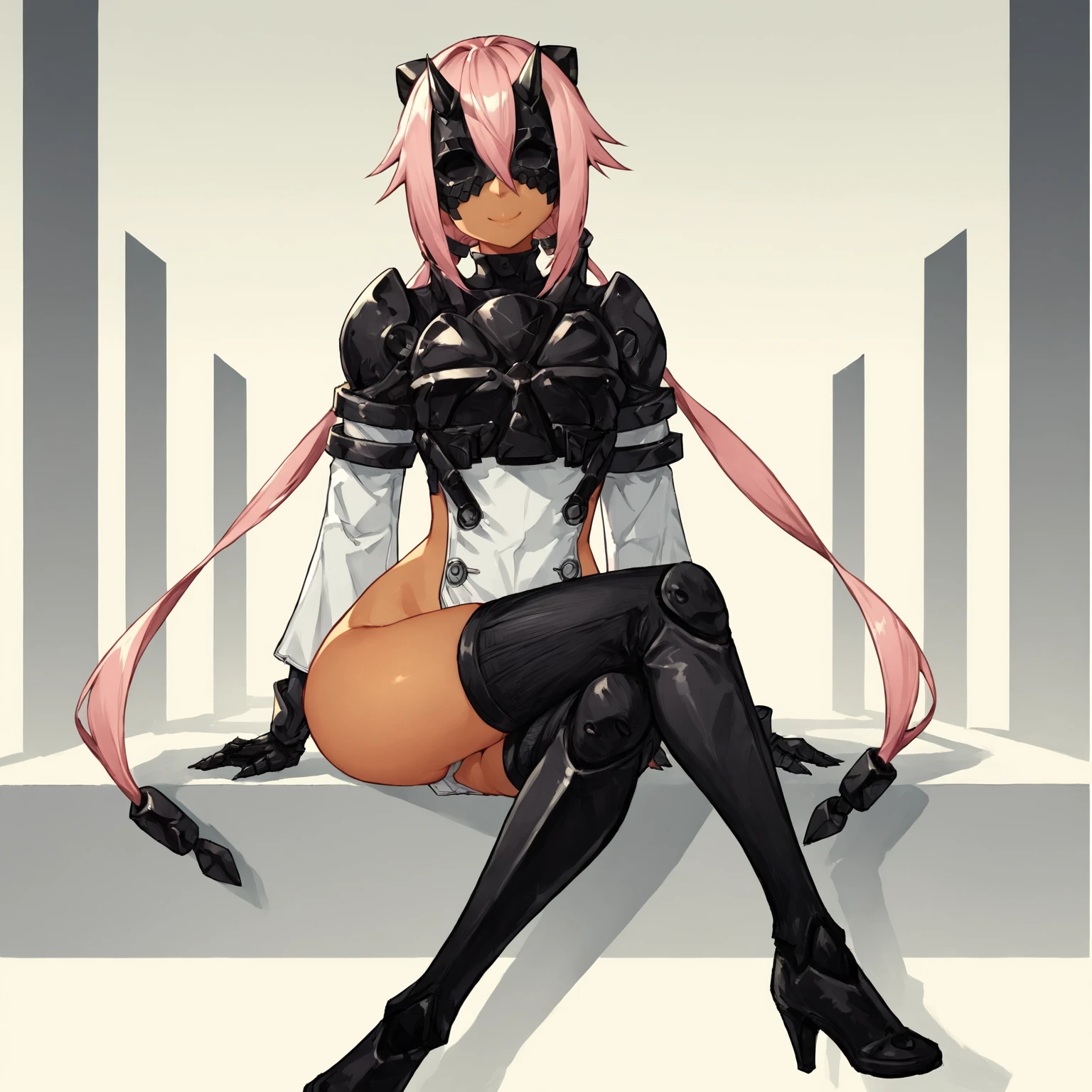 reisheartgear, pink hair, dark-skinned female, long hair, low twintails, mask, pelvic curtain, armor, hair between eyes, no panties, horns, wide sleeves, black thighhighs, thighs, long sleeves, breastplate, gauntlets, gloves, thigh boots