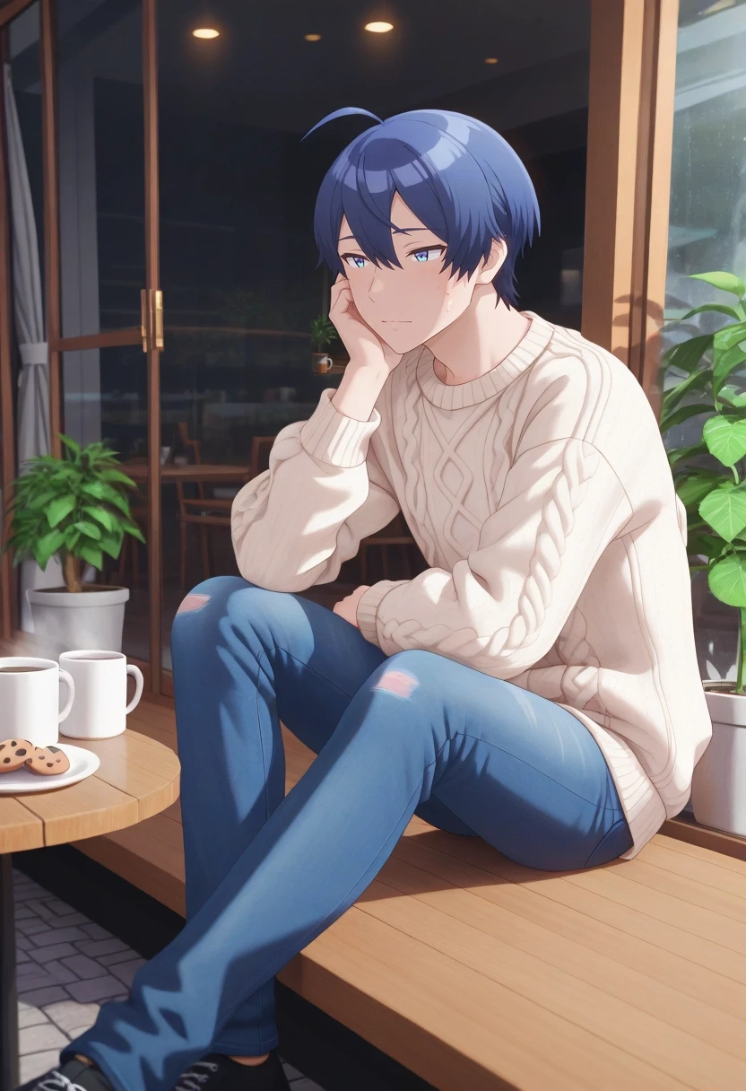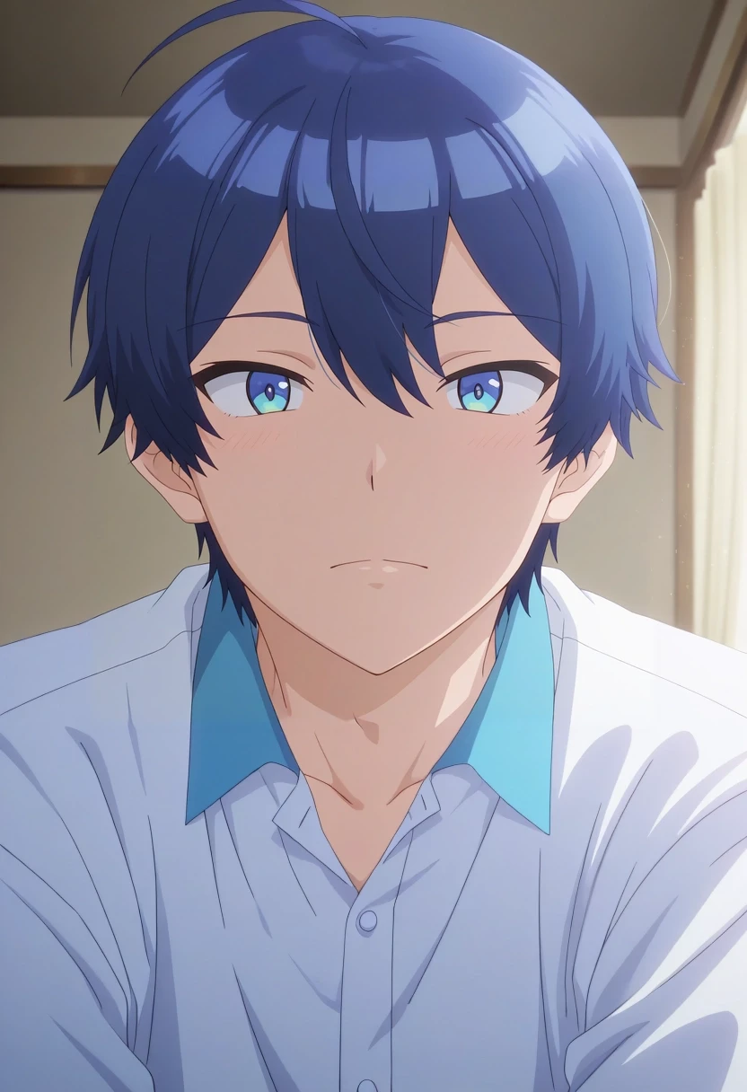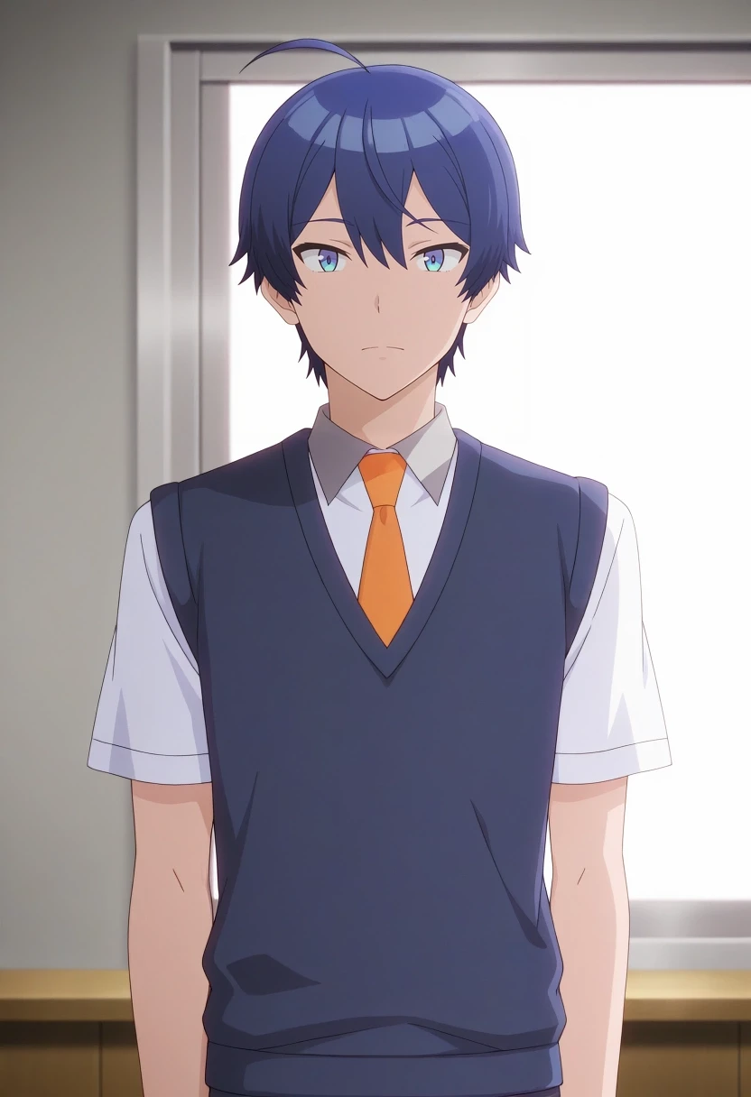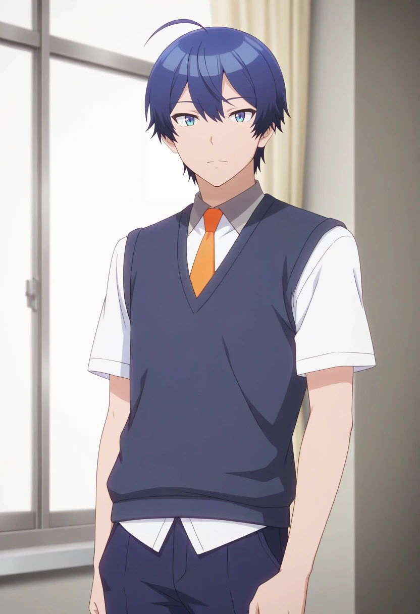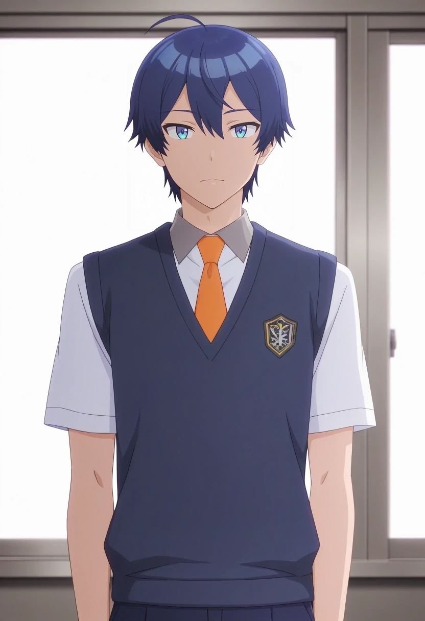 sueharu_maru, blue hair, blue eyes, short hair, ahoge, bangs, {white collared shirt, short sleeves, dark blue v-neck sweater vest, orange necktie||}
