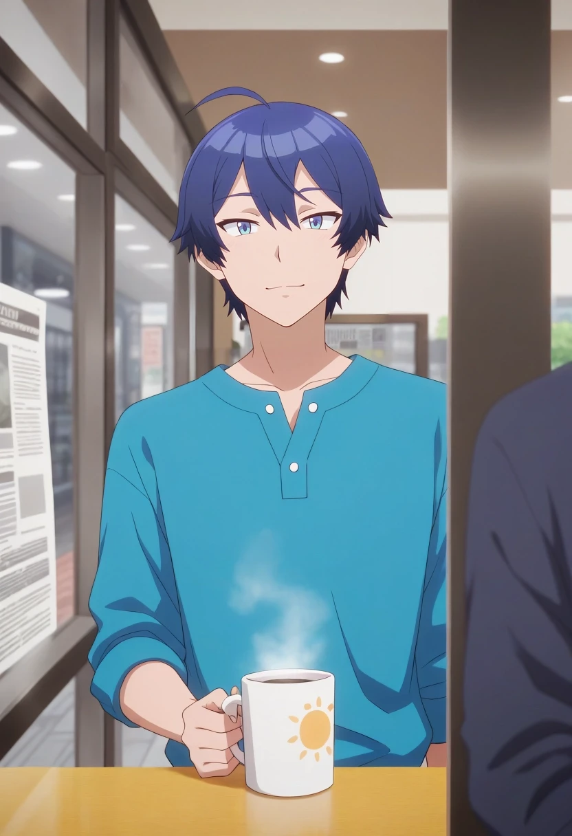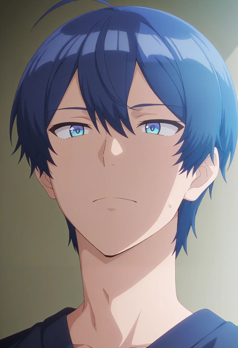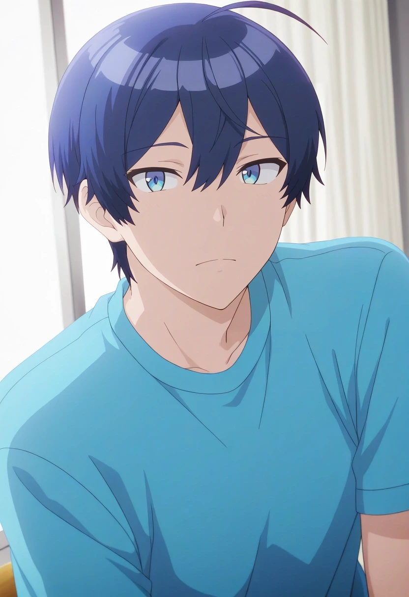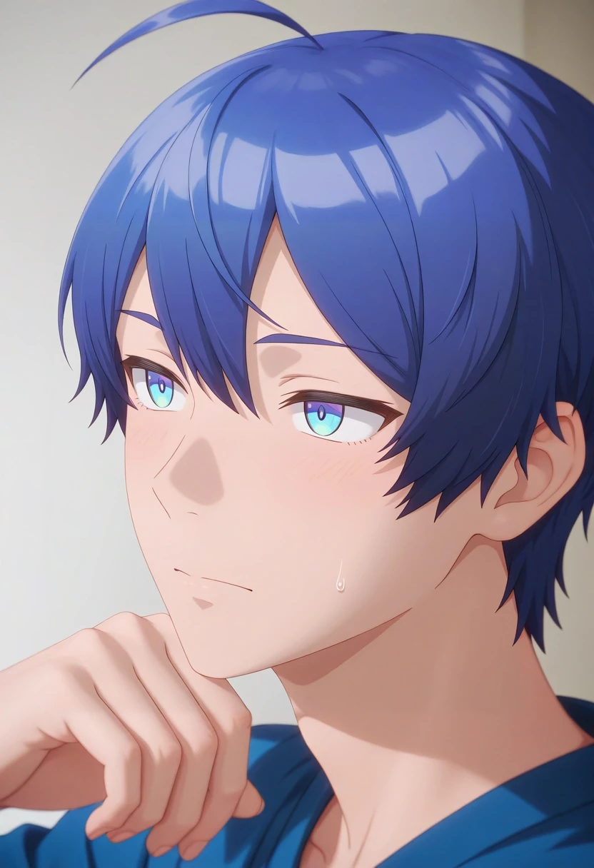 sueharu_maru, blue hair, blue eyes, short hair, ahoge, bangs