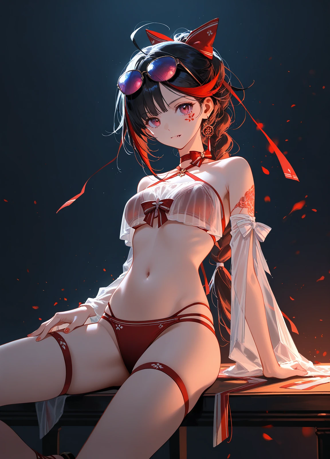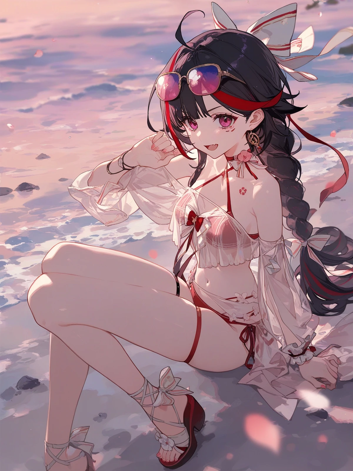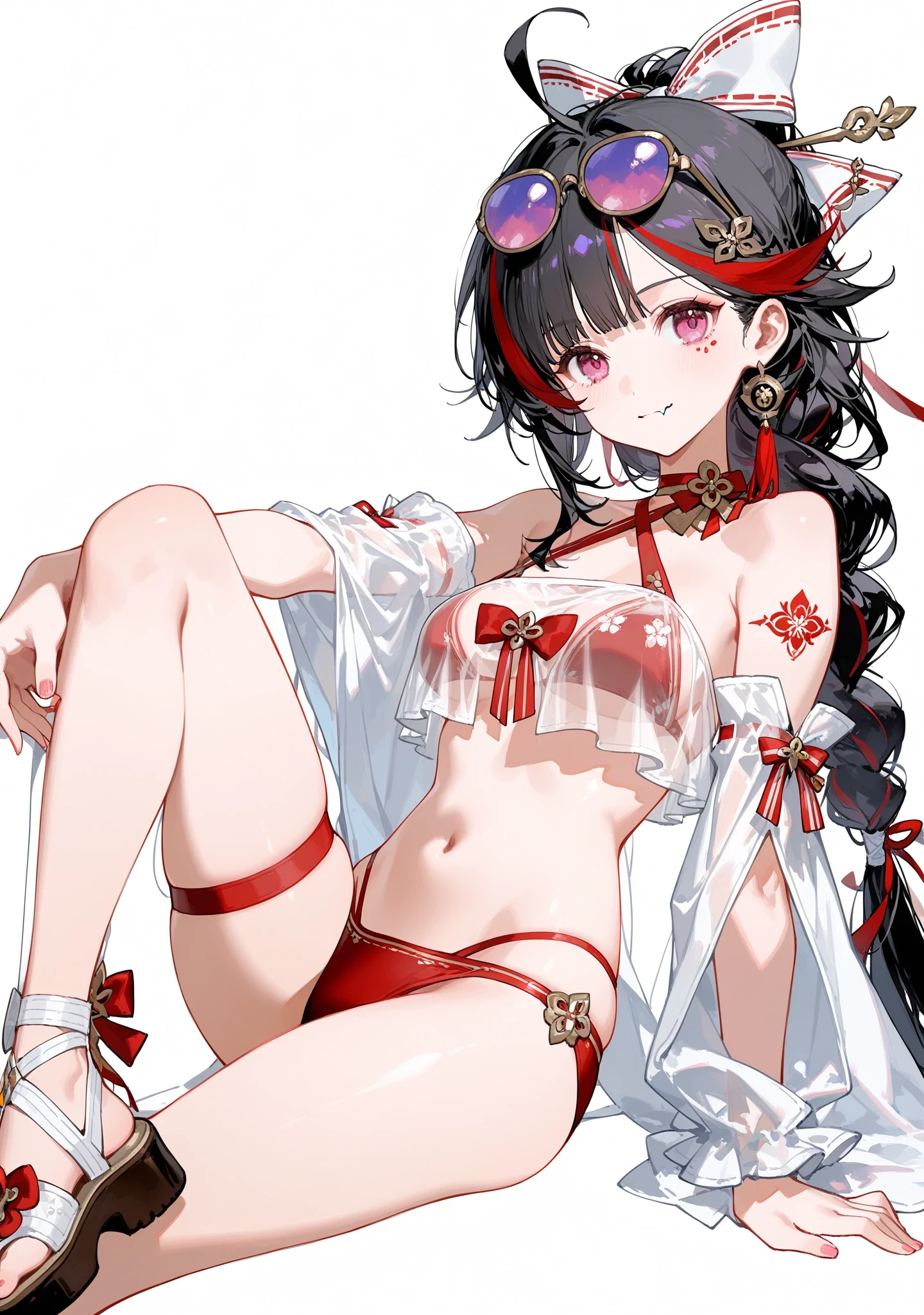 anka_swimsuit, eyewear on head,red bikini,swimsuit,red thigh strap,see-through,braided ponytail,sandals,hair ornament,navel,hair bow,nail polish,bow,ribbon