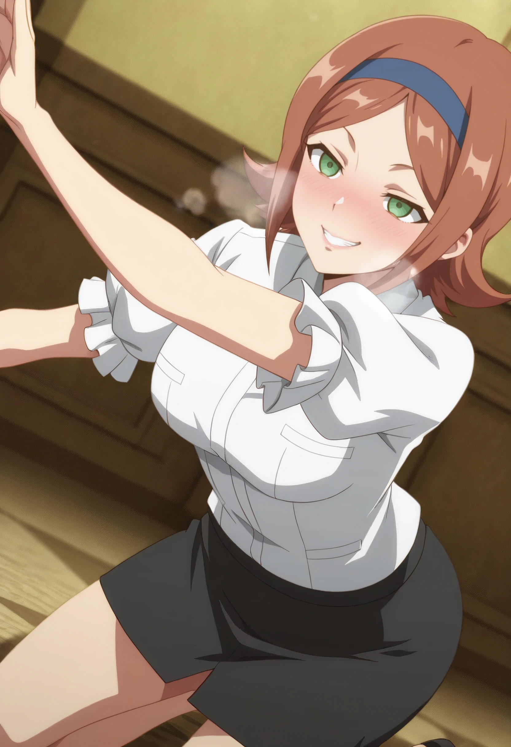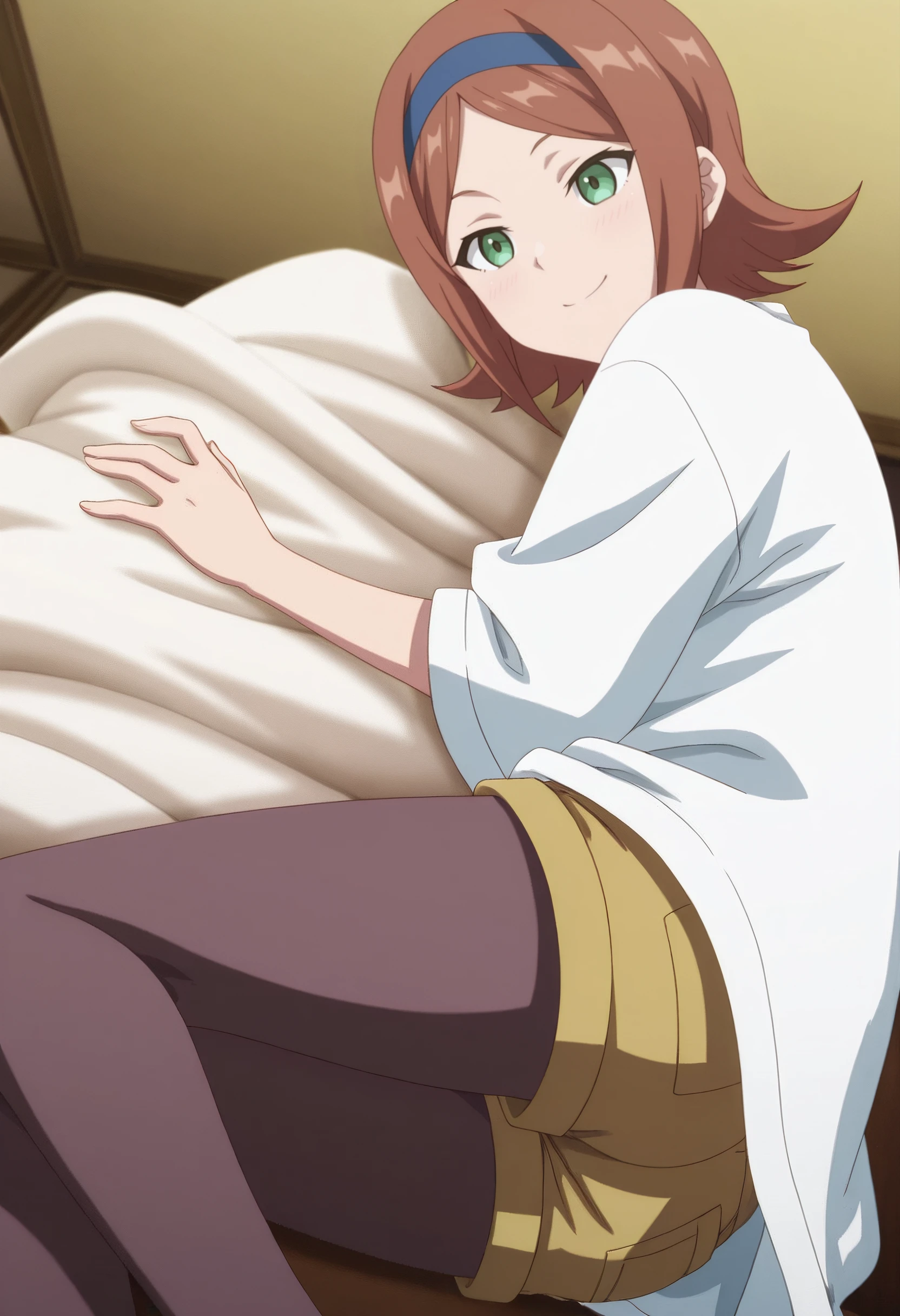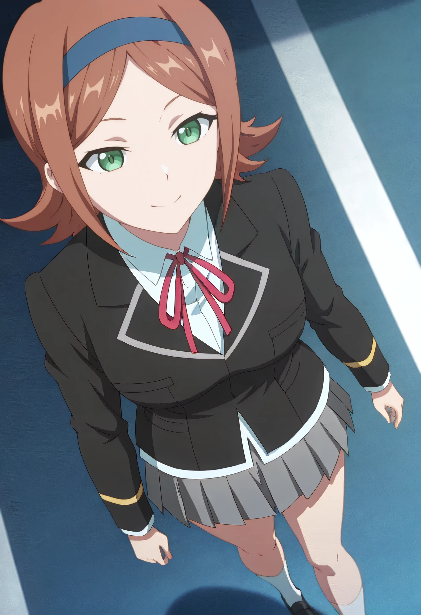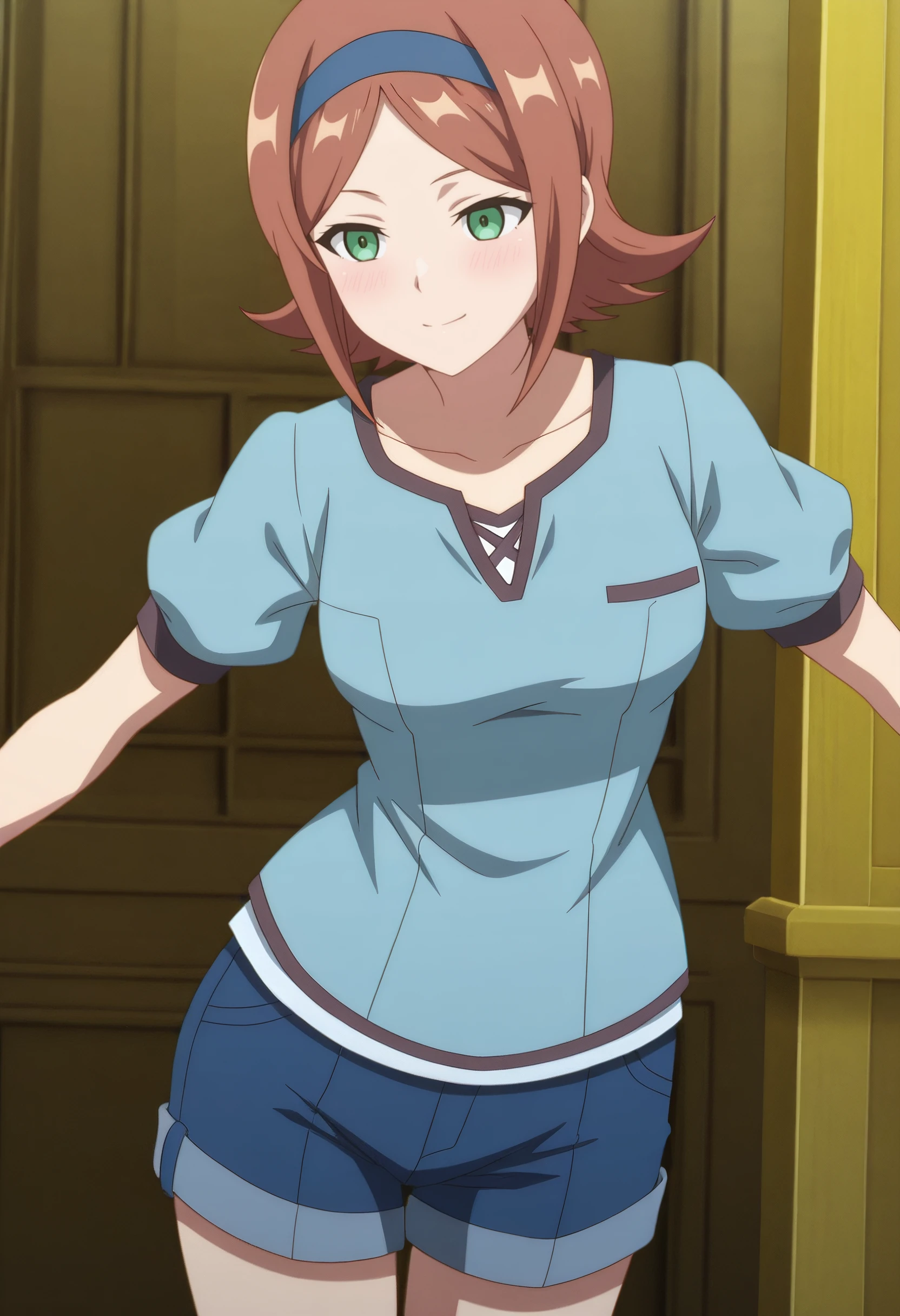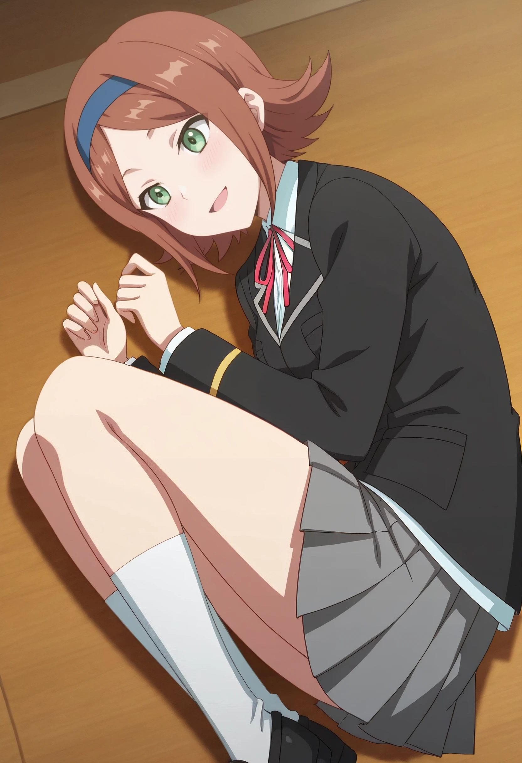 OGSNpcB, blue hairband, short hair, green eyes, brown hair, flipped hair, parted bangs,