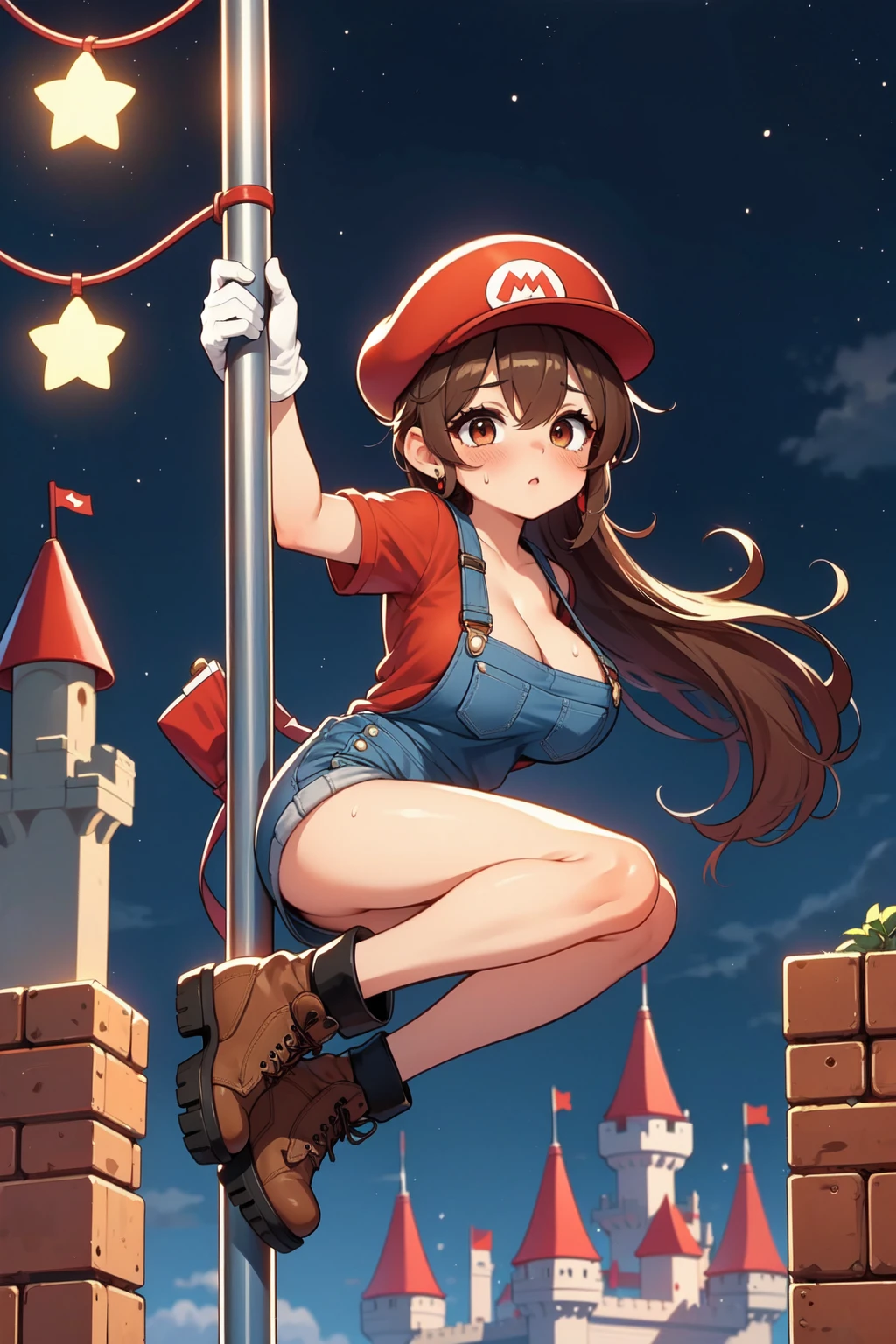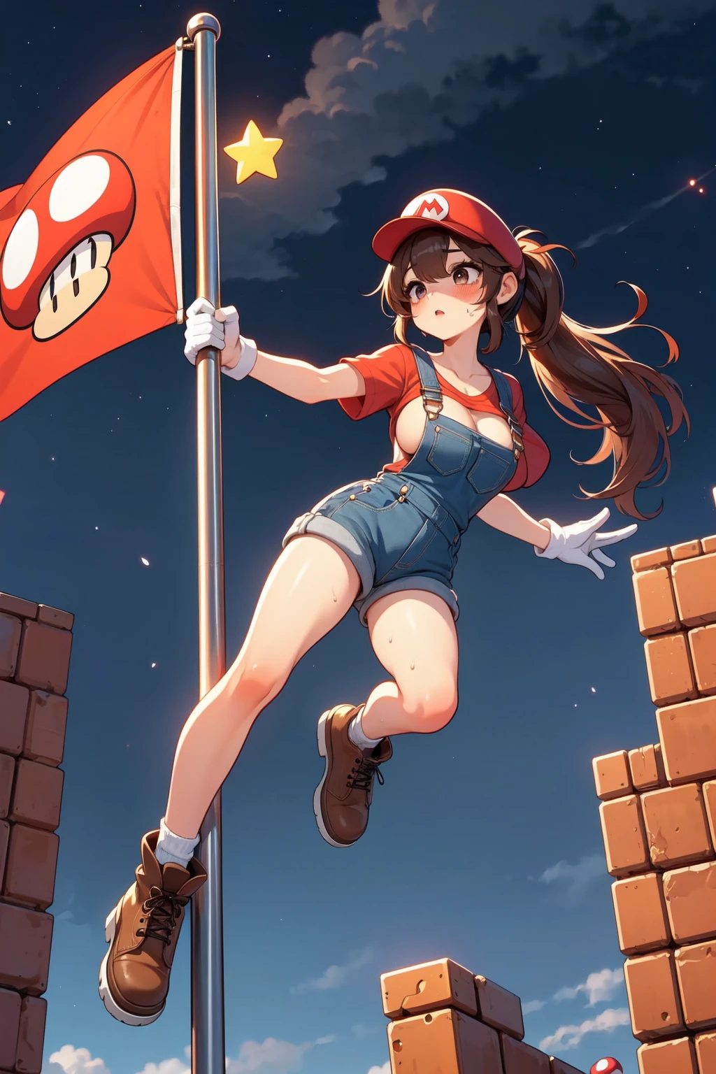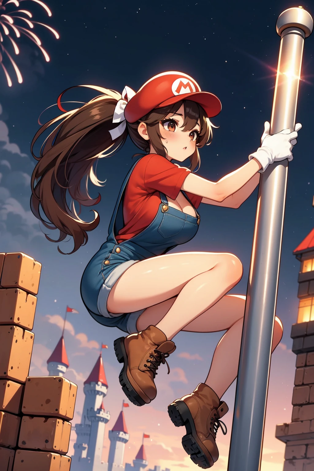 ((flagpole climbing)), ((leaning forward)), ((castle)), (mushroom logo flag), at height, mario costume, brown hair, red cap, red shirt worn under denim overalls, white gloves, brown shoes, greenery, fireworks, cloudy sky, green pipes, brown stairs blocks, yellow star \(symbol\),