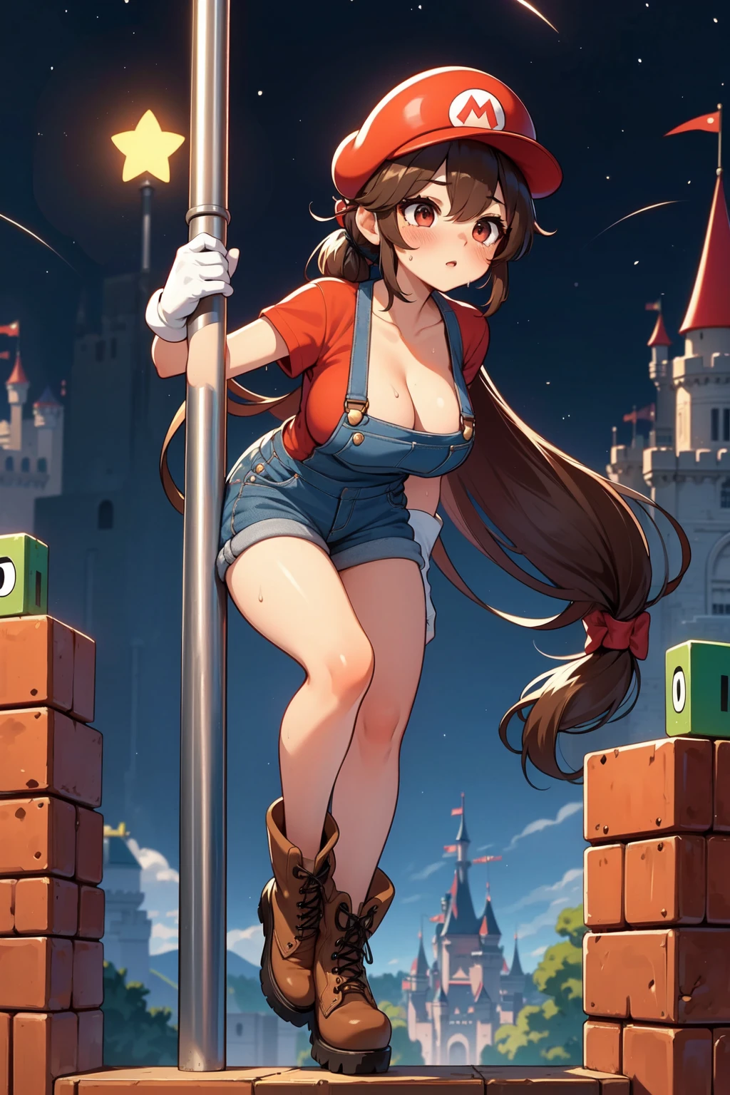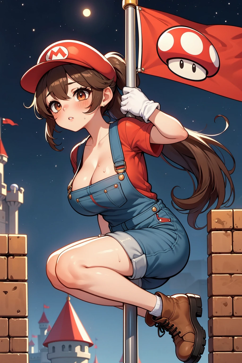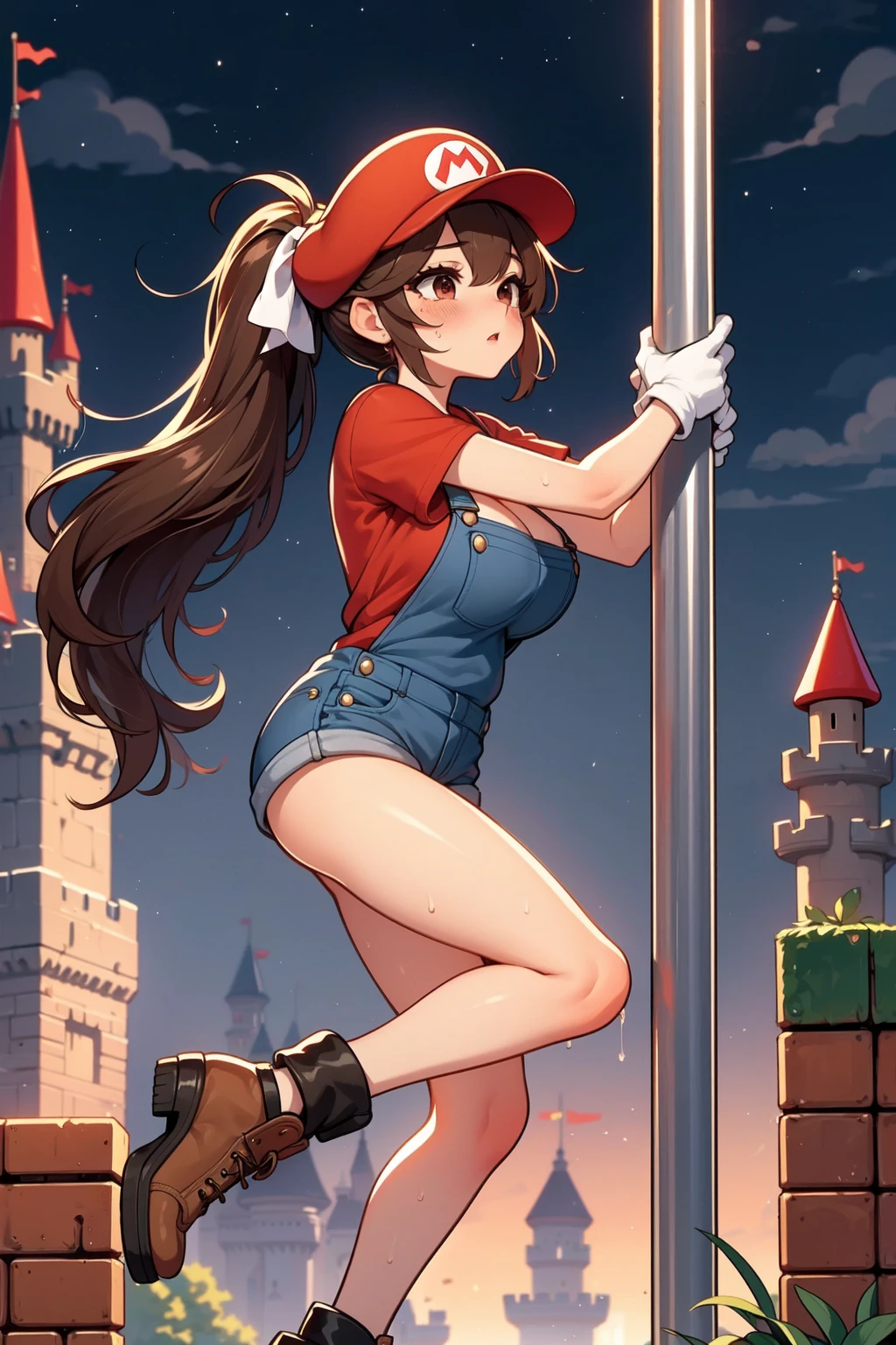 ((flagpole climbing)), ((leaning forward)), ((castle)), (mushroom logo flag), at height, mario costume, brown hair, red cap, red shirt worn under denim overalls, white gloves, brown shoes, greenery, fireworks, cloudy sky, green pipes, brown stairs blocks, yellow star \(symbol\),
