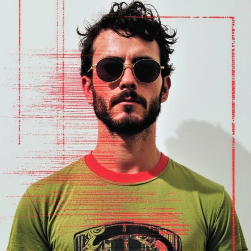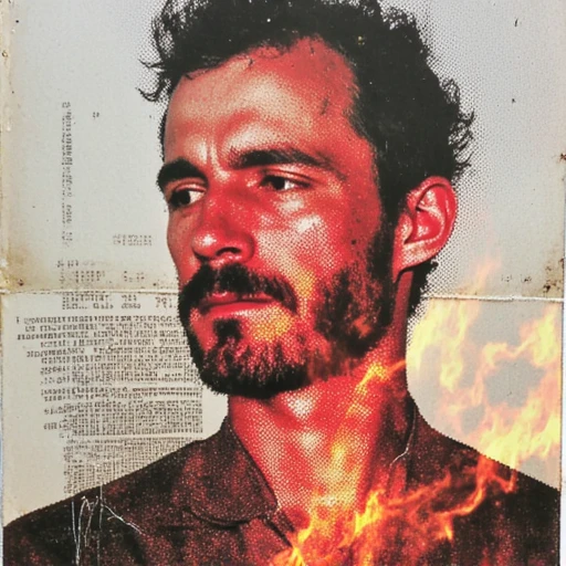 The image is mixed media artwork: combining glitch art, halftone screenprinting, and distressed photocopying in a pop art style.