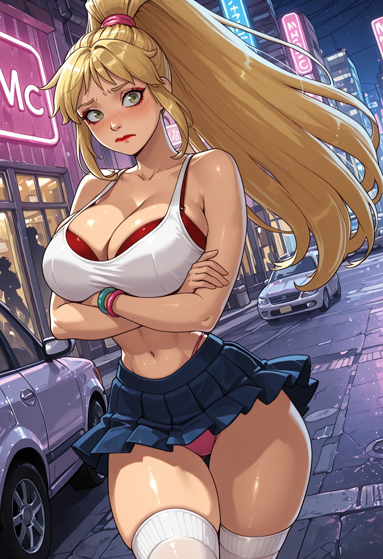 over-kneehighs, navel, white, thighhighs, bare shoulders, blue skirt, pleated skirt, miniskirt, white crop top, red bra, bracelet, pink panties,