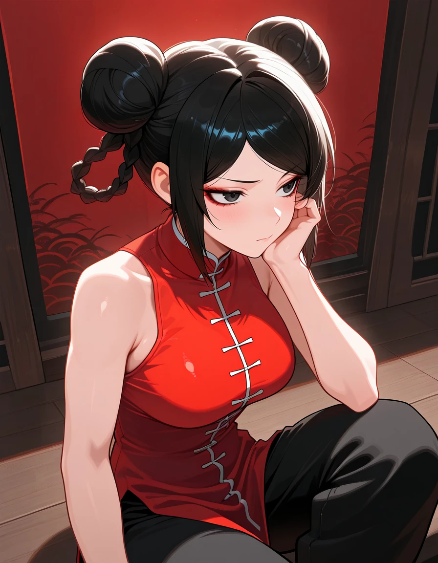 Yuszha Li, 1girl, black pants, black hair, double bun, hair bun, braid, chinese braid, bangs,eyeliner, sharp eyes,red cheongsam, chinese clothes, sleeveless, sleeveless dress, side slit,eyeshadow,