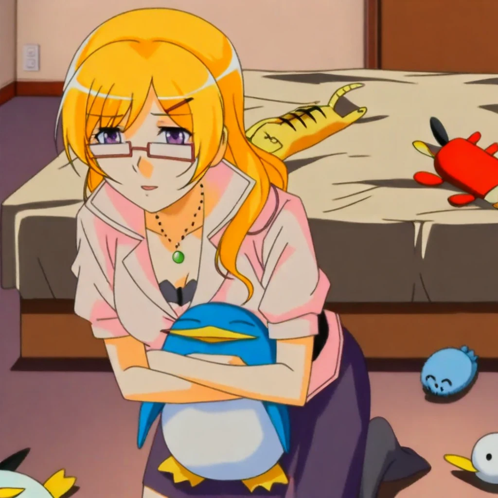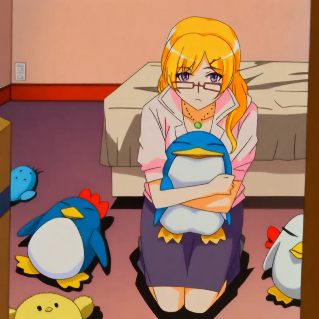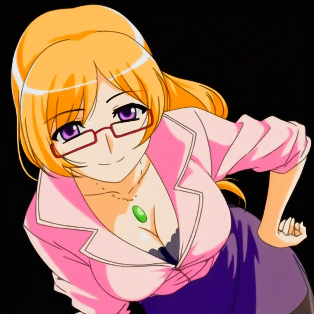 Score_9, score_8_up, score_7_up, 1girl, solo, Chiyo Sawagiri, blonde hair, long hair, purple eyes, red glasses,
