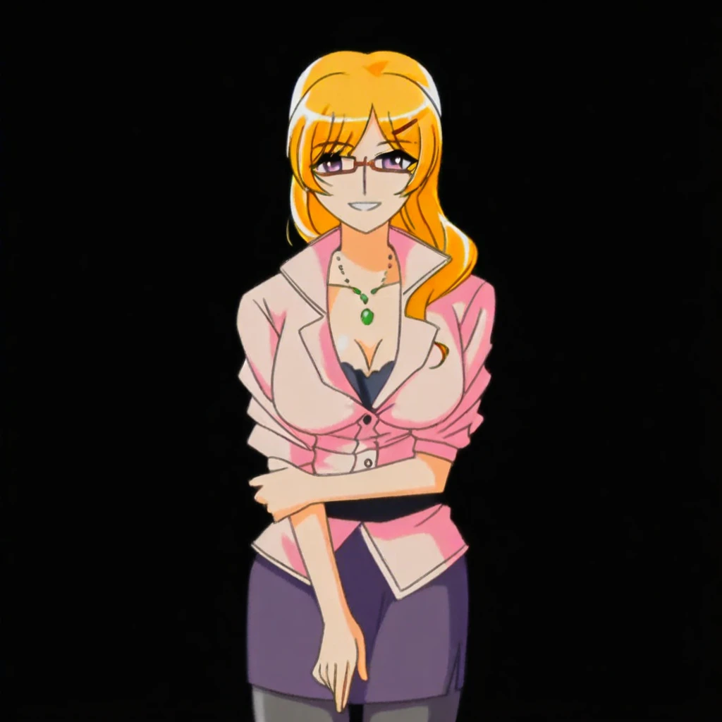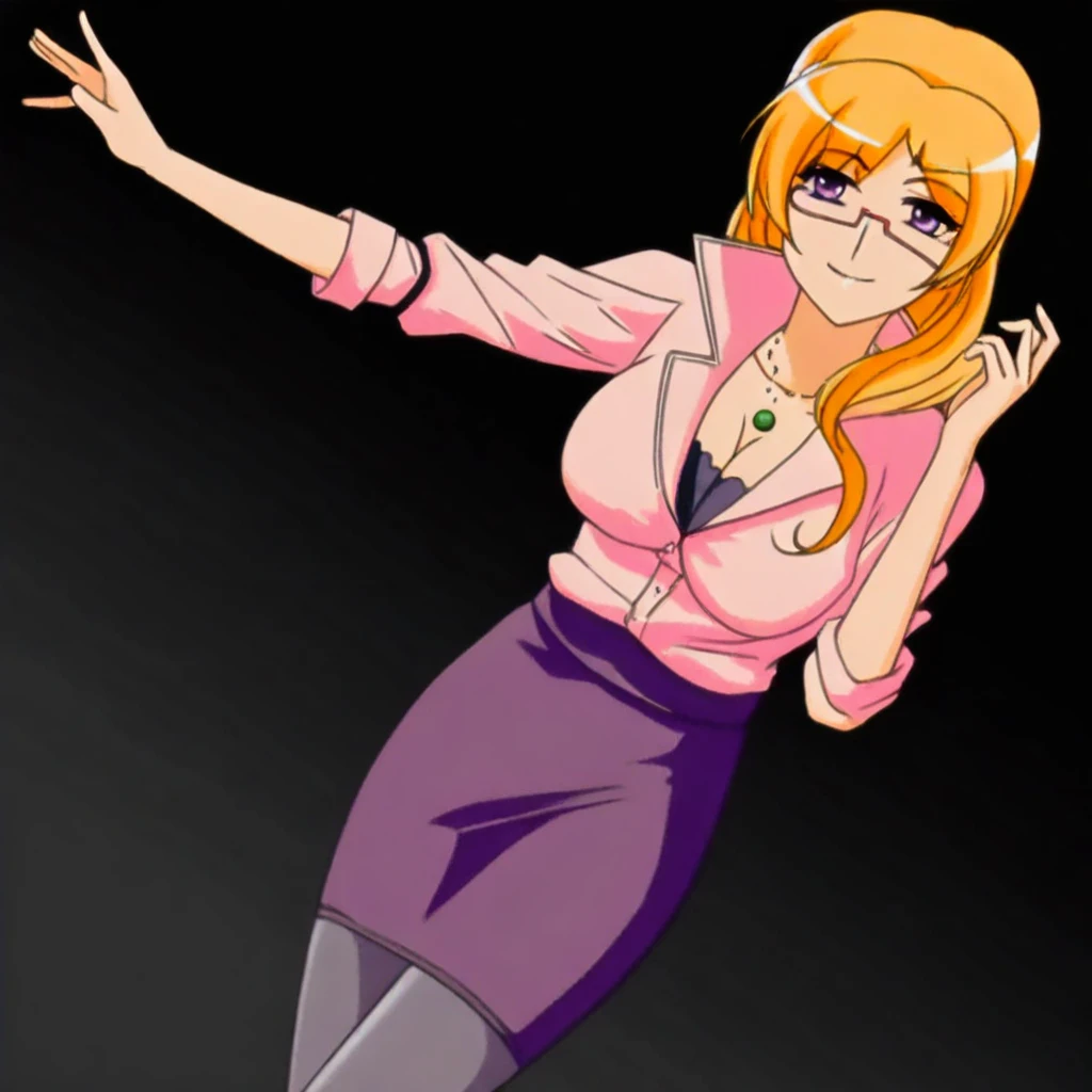 necklace, pink shirt, cleavage, purple skirt, pantyhose