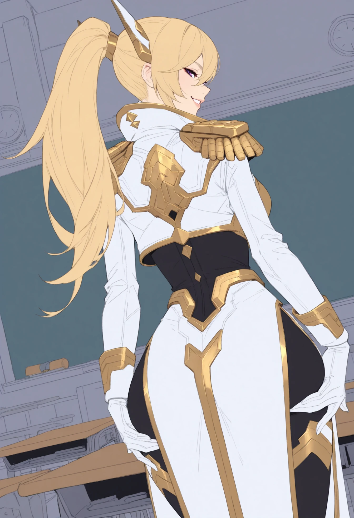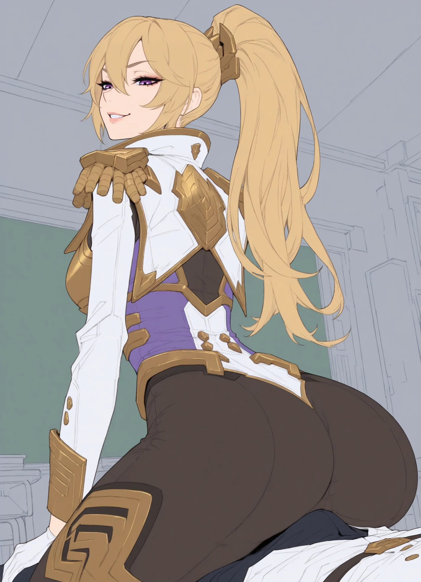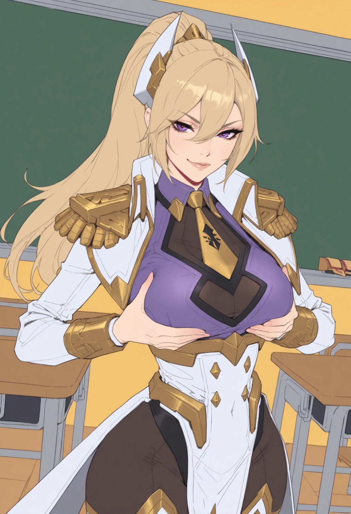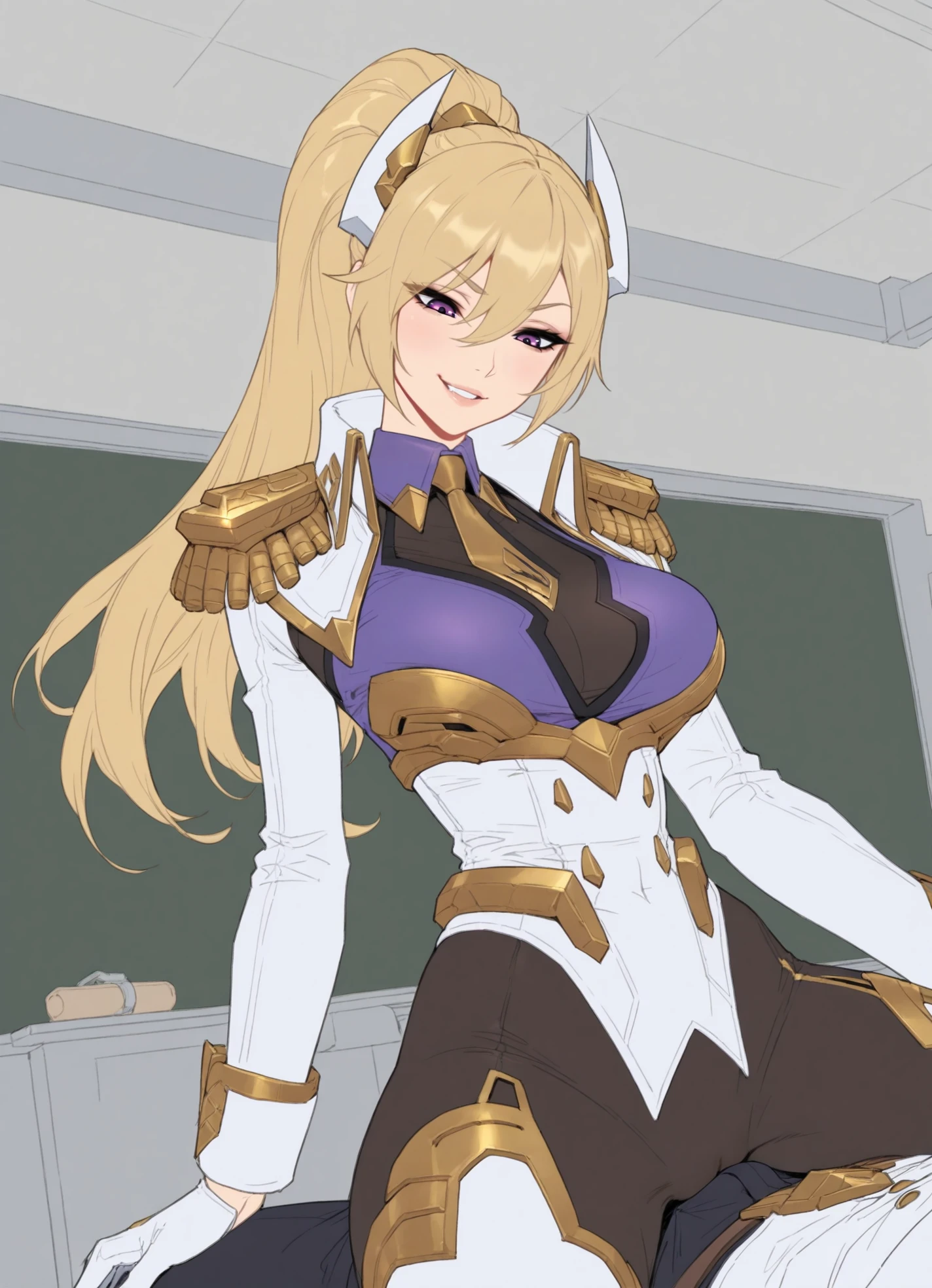 PR_A_Leona,slim body,blonde hair,ponytail,side bangs,violet eyes,white and gold armor,purple chestplate,high collar,gold trim details,epaulettes,shoulder pauldrons,long white coat,,thigh-high armored leggings,white gloves,golden trim,heels