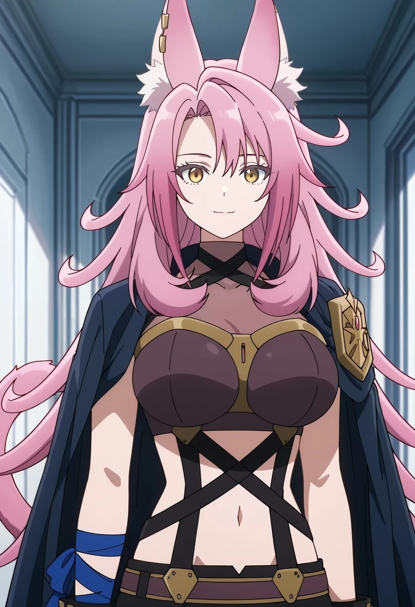 Appearance: ferrijit_ygo, 1girl, solo, pink hair, long hair, animal ears, animal ear piercing, yellow eyes, lower lip only, cat tail