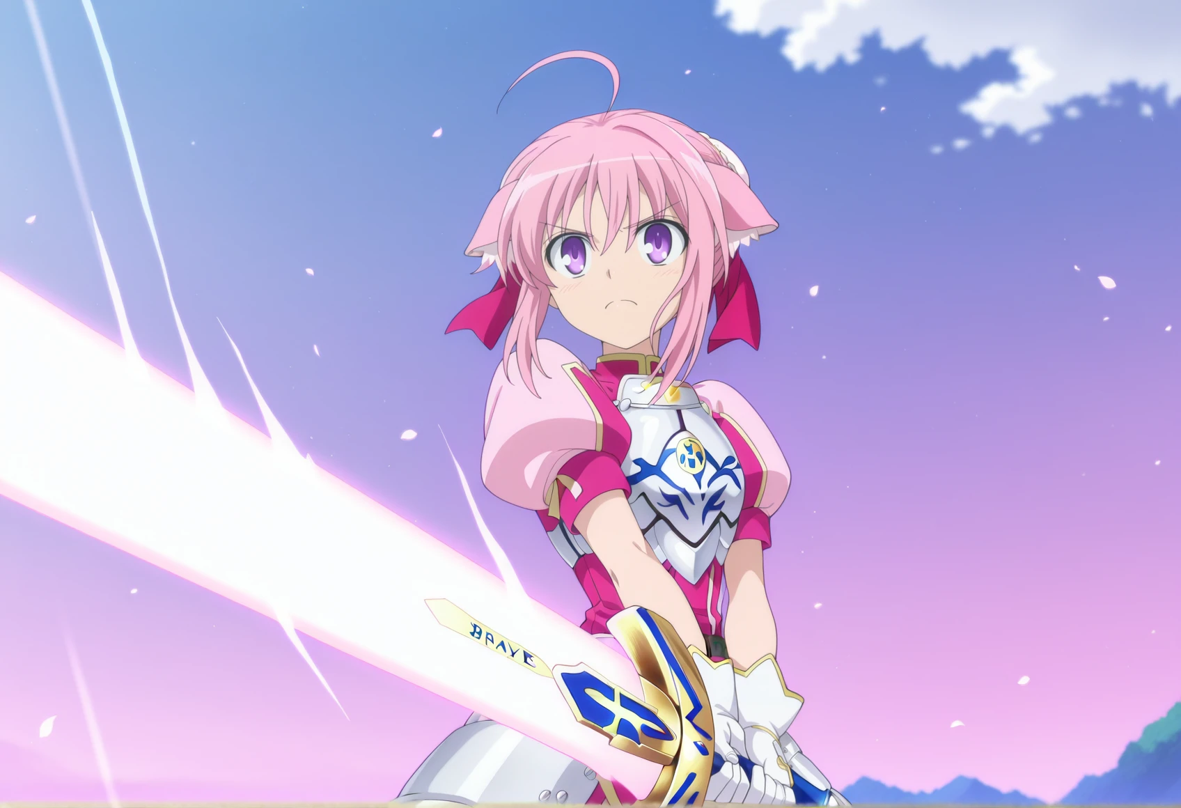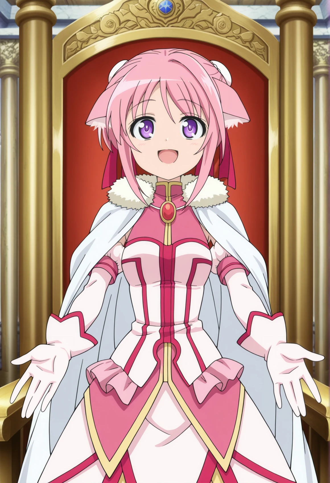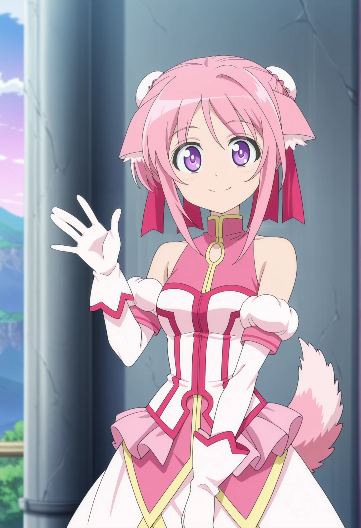 Alt: pink hair, double bun, bun cover, ribbon, dog ears, purple eyes, pink dress, puffy sleeves, gloves, armor