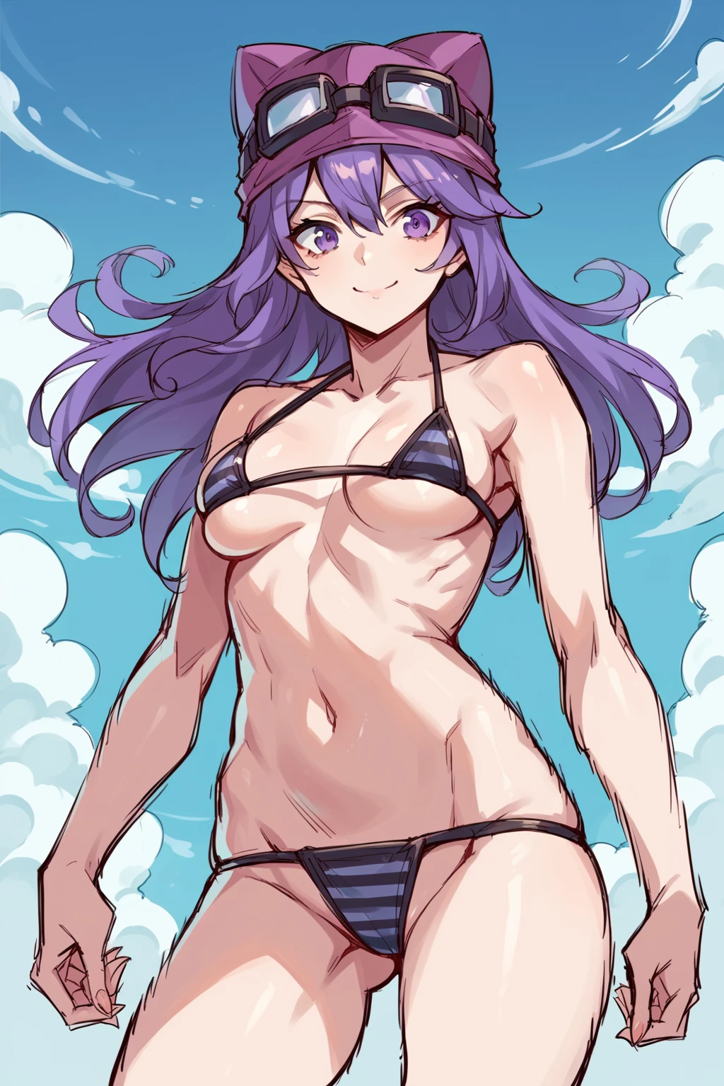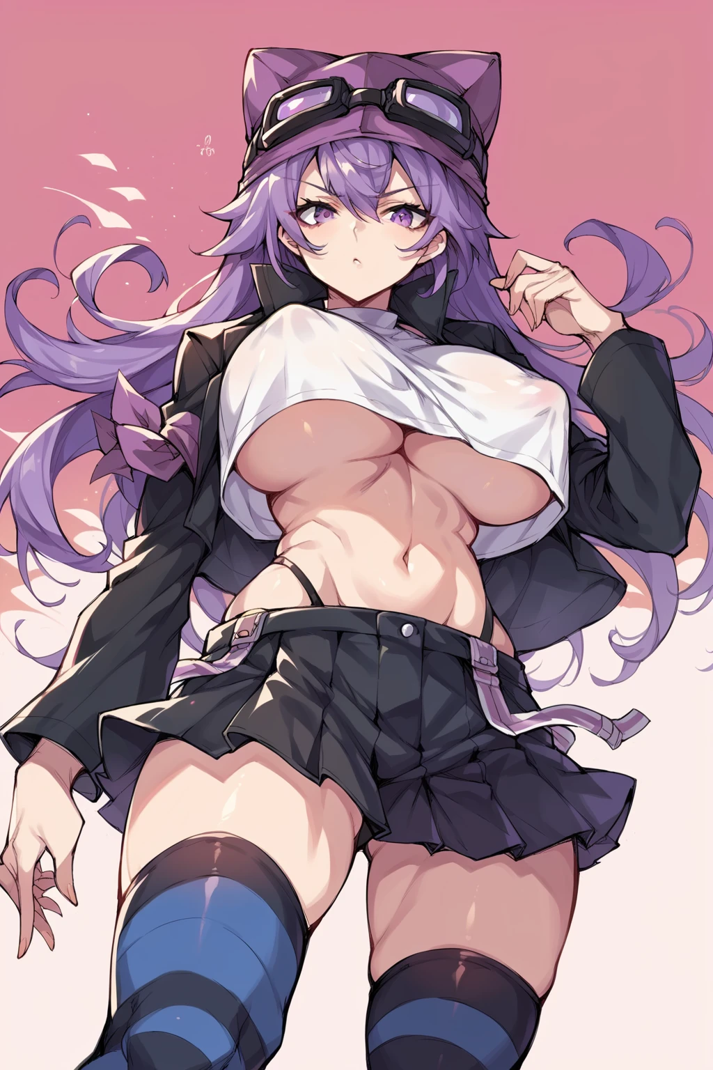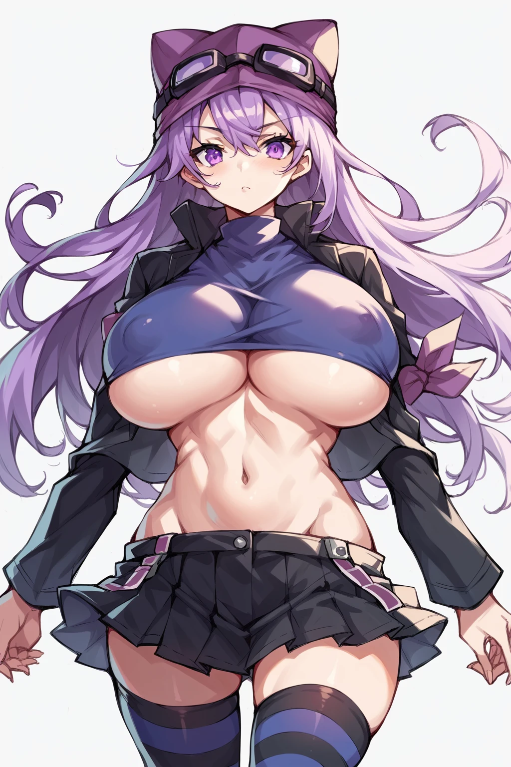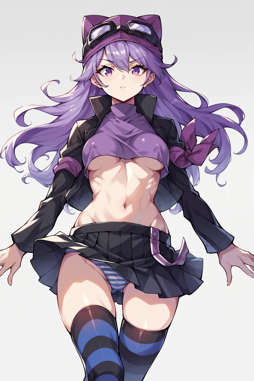 sayo, long hair, purple hair, open jacket, black jacket, striped thighhighs, black thighhighs, goggles on headwear, purple eyes, zettai ryouki, pleated skirt, black skirt