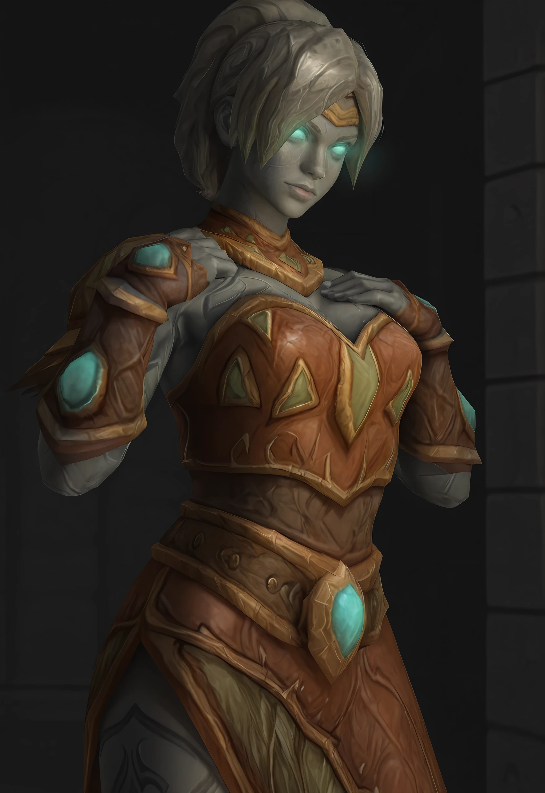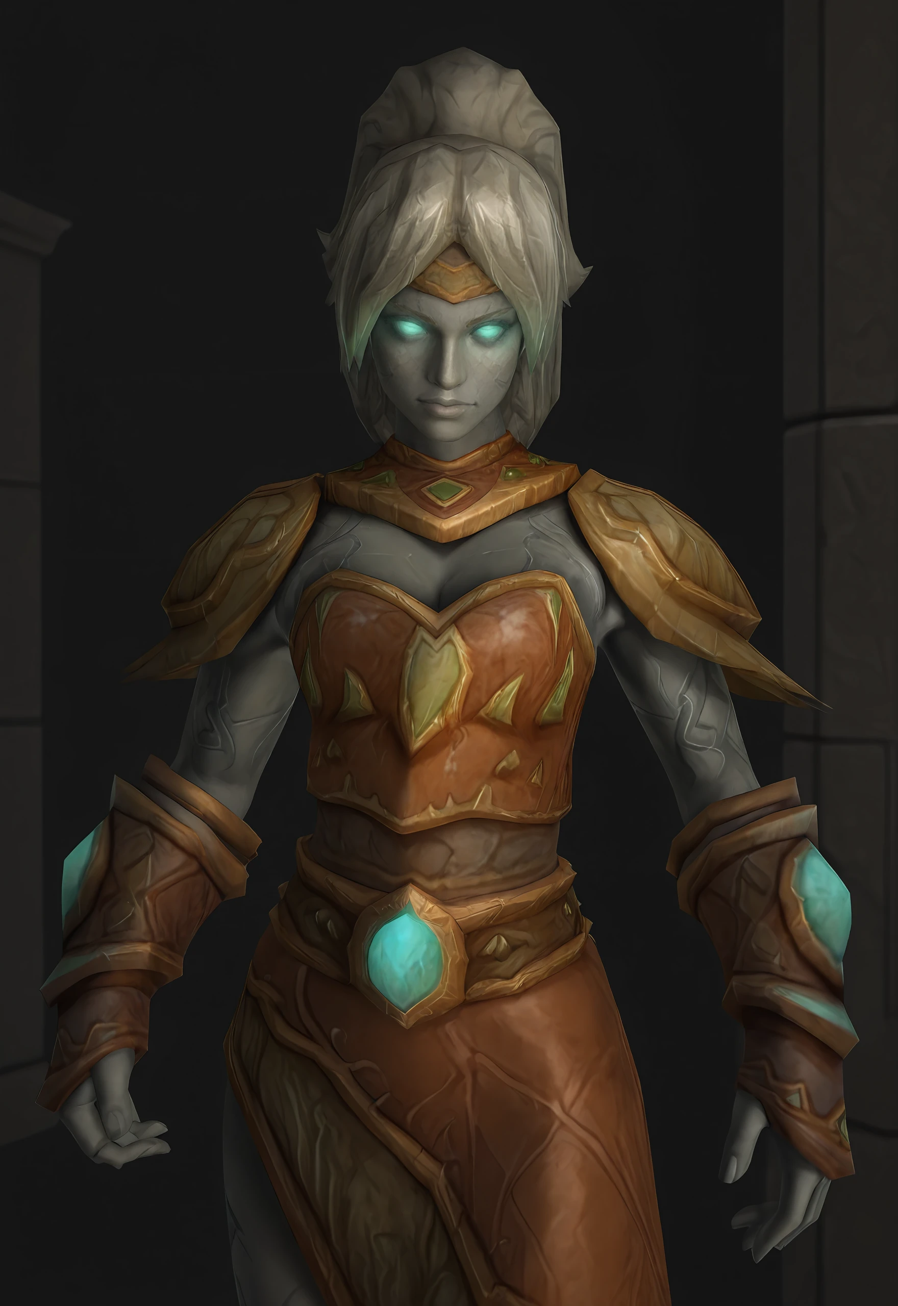 freyawow, structured skin, grey skin, blue eyes, glowing eyes, no pupils