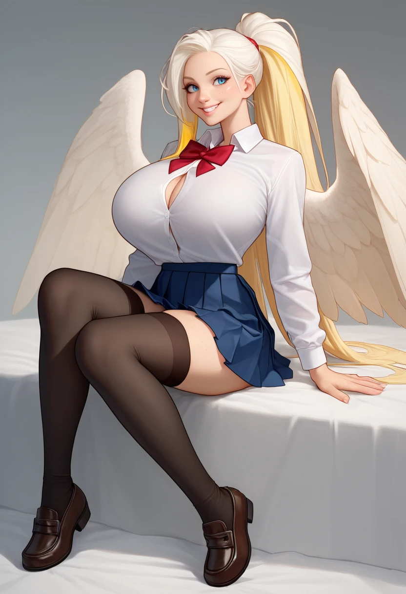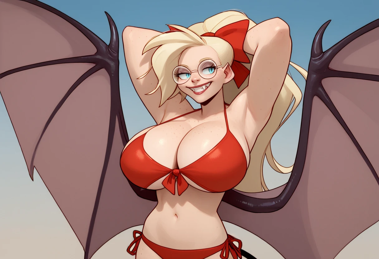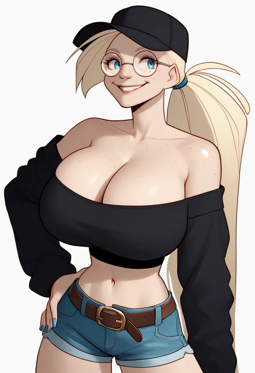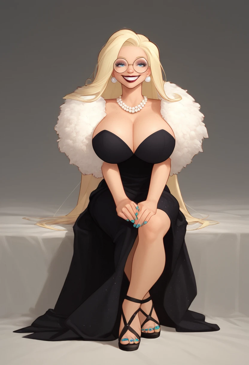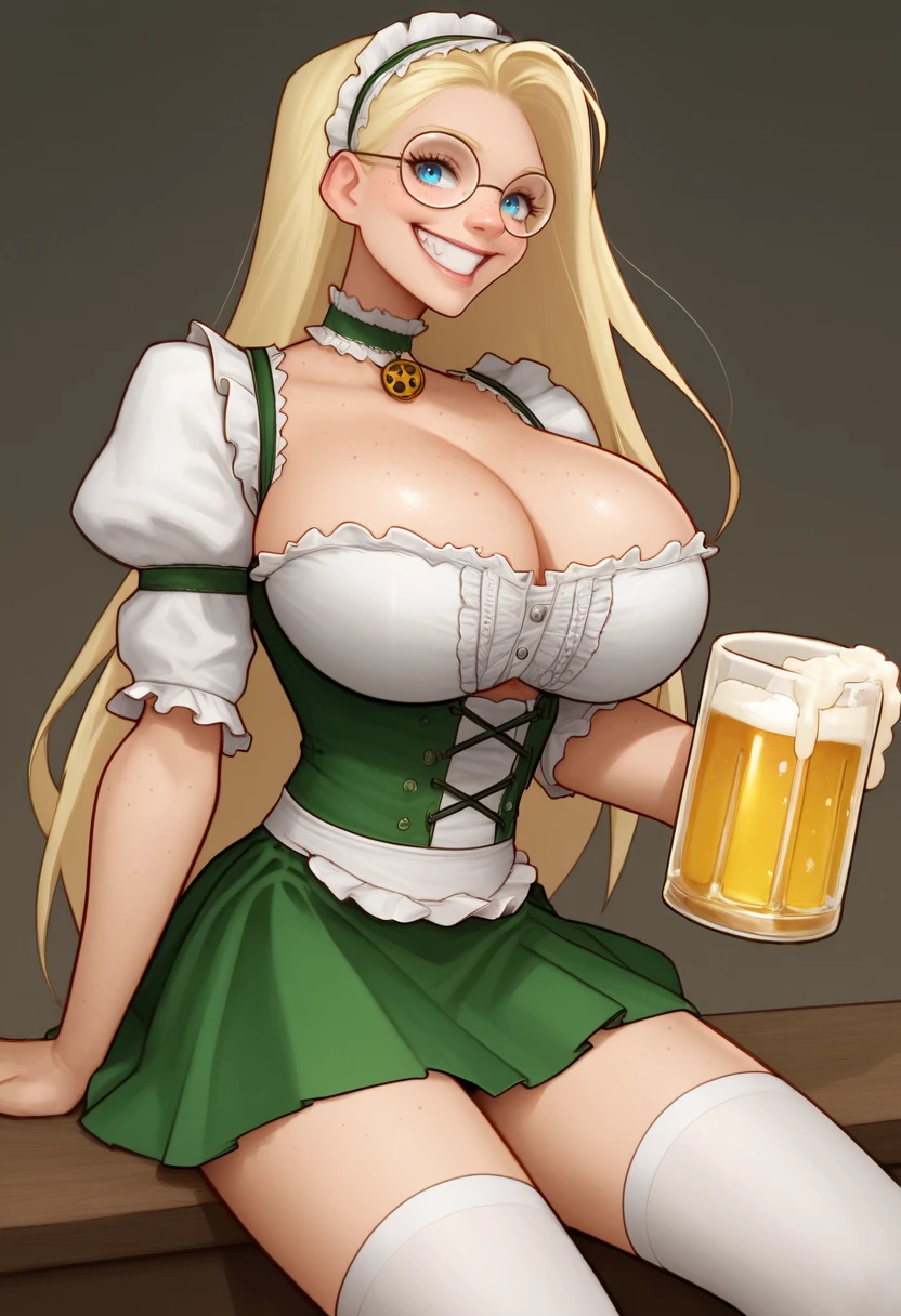 1girl, atsali, very tall, blonde hair, long hair, blue eyes, glasses, round eyewear, huge breasts,