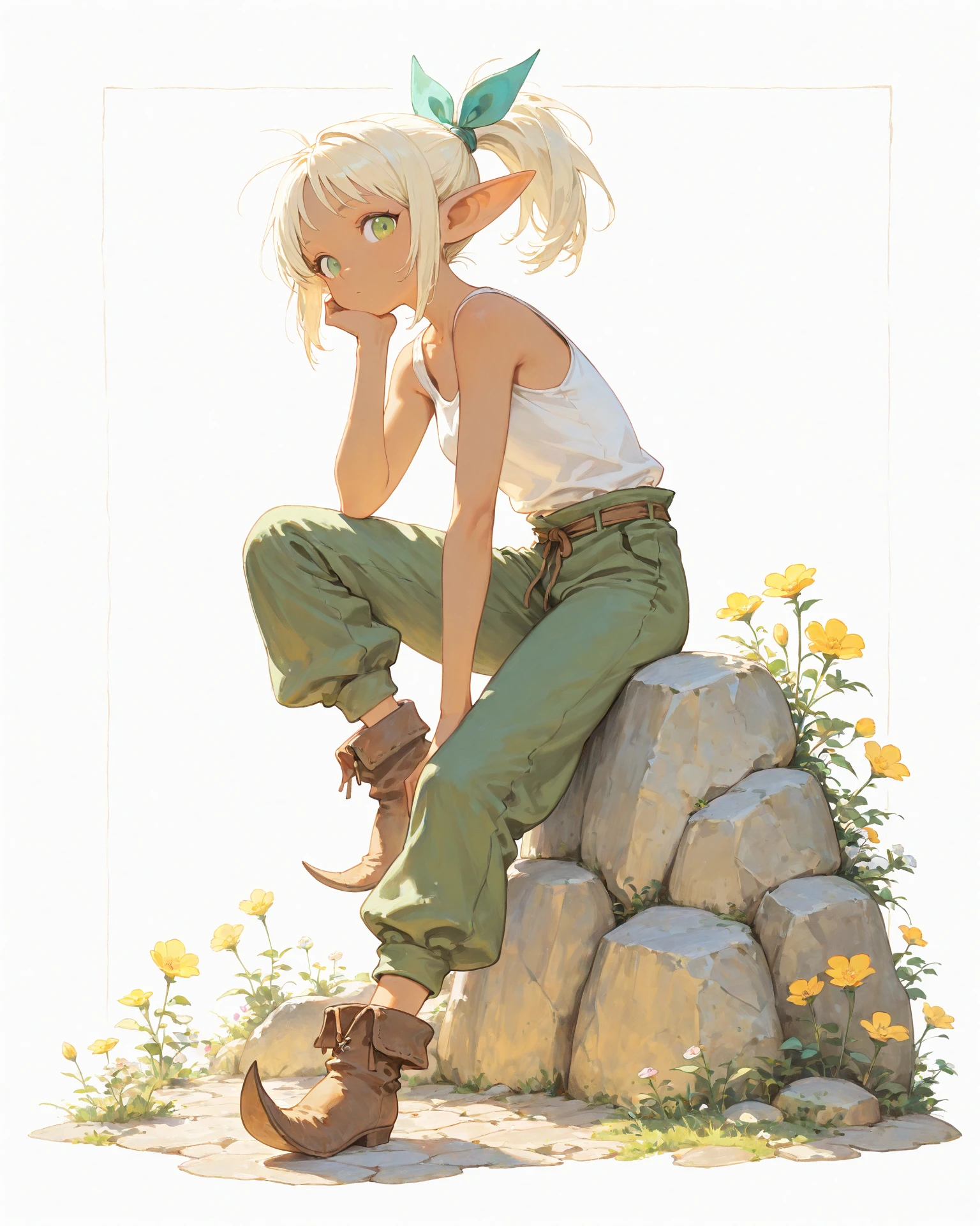 1girl, pointy ears, on rock, plant, flower, border, outside border, beige background1girl, pointy ears, outdoors, night, dappled moonlight, rock, dark backgroundtraditional media, painterlyHave fun <3