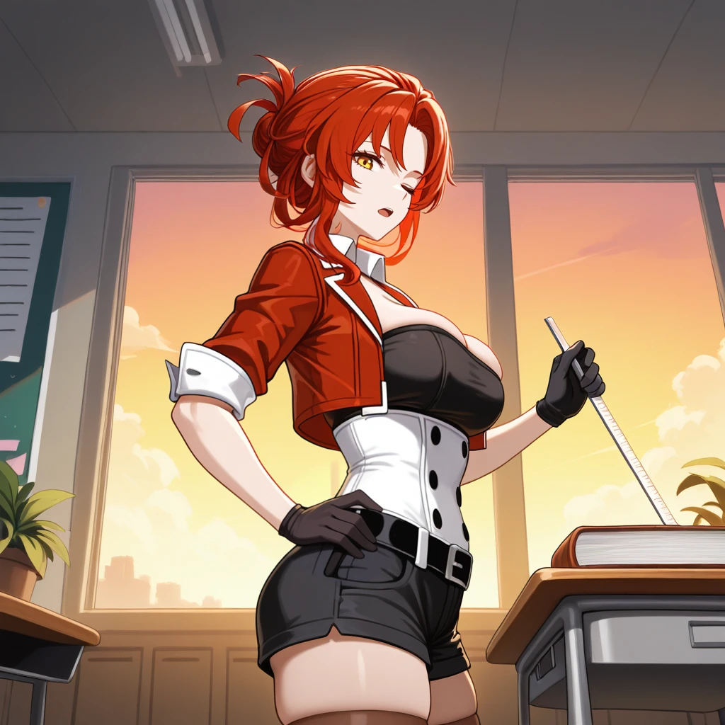 sleeves rolled up, cropped jacket, red jacket, belt, brown shorts, black top, white corset, brown footwear, thigh boots, thighhighs, gloves, cleavage,