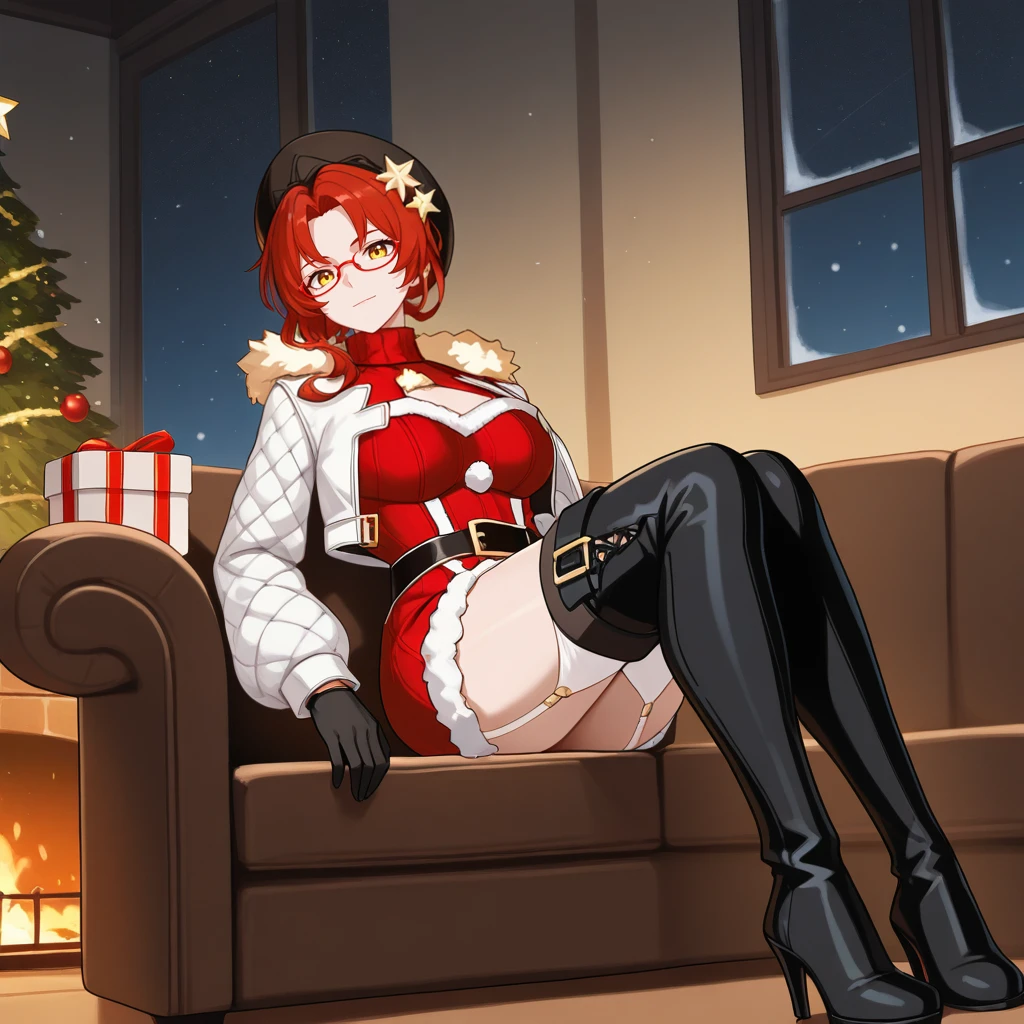 HimekoHi3, Fol001, Hmk_Chr, red hair, yellow eyes, murata himeko, alternate black footwear, high heel boots, thigh boots, halter dress, cleavage cutout, red dress, garter straps, white thighhighs, christmas outfit, fur trim, alternate cropped jacket, white jacket, alt long sleeves, white sleeves, fur-trimmed jacket, black headwear, glasses, alt black belt, turtleneck, beret, alt black gloves,