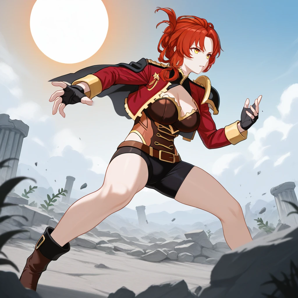 HimekoHi3,  Fol001, Hmk_Tri, red hair, yellow eyes, murata himeko, multicolored leotard, brown leotard, black leotard, bike shorts, alt black shorts, brown belt, alt cropped jacket, alt red sleeves, alt red jacket, fingerless gloves, long sleeves, shoulder armor, single pauldron, cleavage, detached collar, gold trim, black capelet, ankle boots, brown footwear