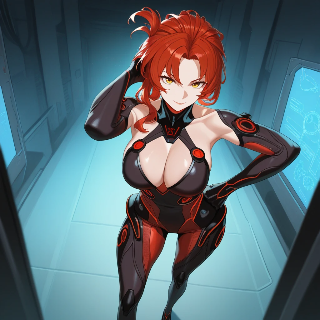 HimekoHi3, Fol002, Hmk_Scf, red hair, yellow eyes, murata himeko, plug suit, neon trim, bodysuit, multicolored bodysuit, black gloves, cleavage, detached collar, halterneck, elbow gloves,