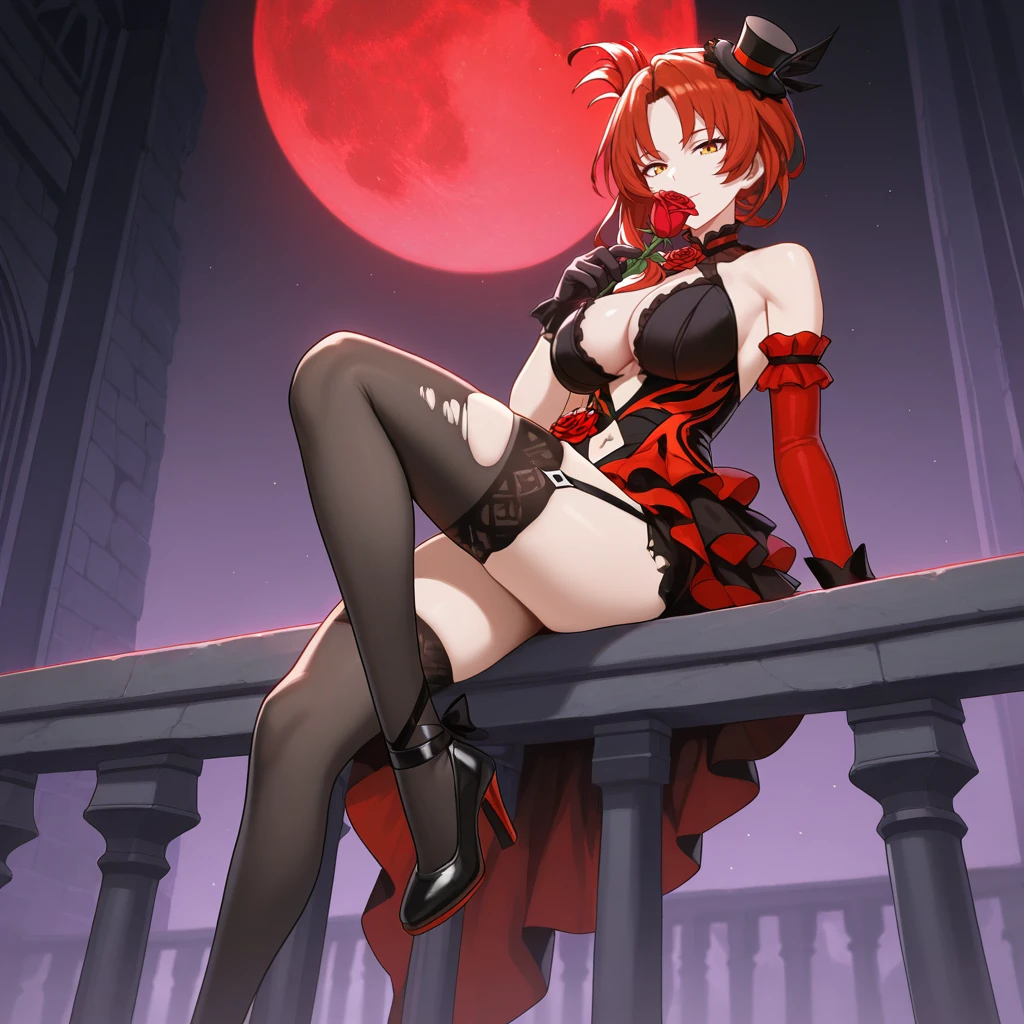 HimekoHi3, Fol002, Hmk_Blr, red hair, yellow eyes, murata himeko, mini top hat, alt black headwear, red rose, two-tone dress, frilled dress, black dress, alt red dress, torn clothes, bare shoulders, center opening, navel cutout, cleavage cutout, alt halterneck, asymmetrical sleeves, red sleeves, single sleeve, alt elbow gloves, alternate black gloves, black underwear, garter strap, black thighhighs, torn thighhighs,