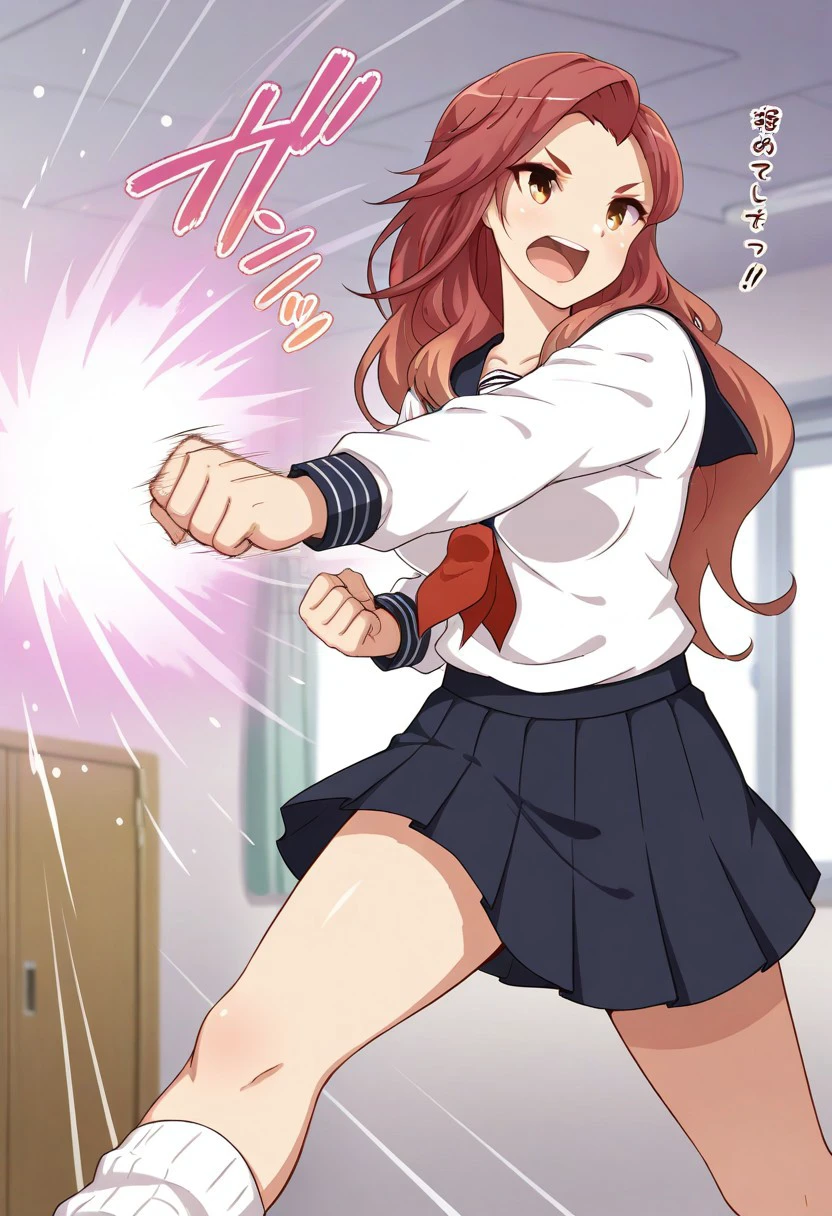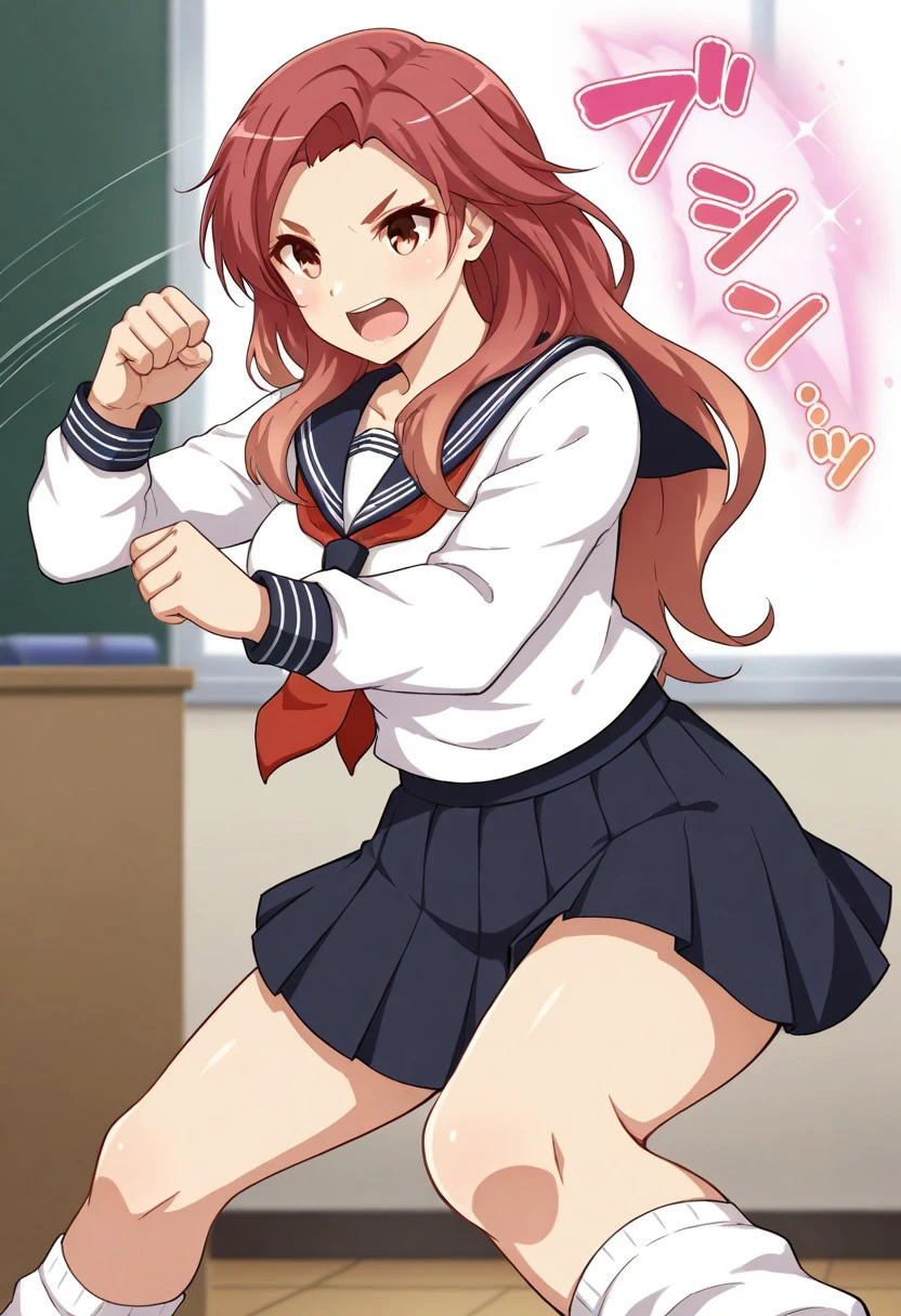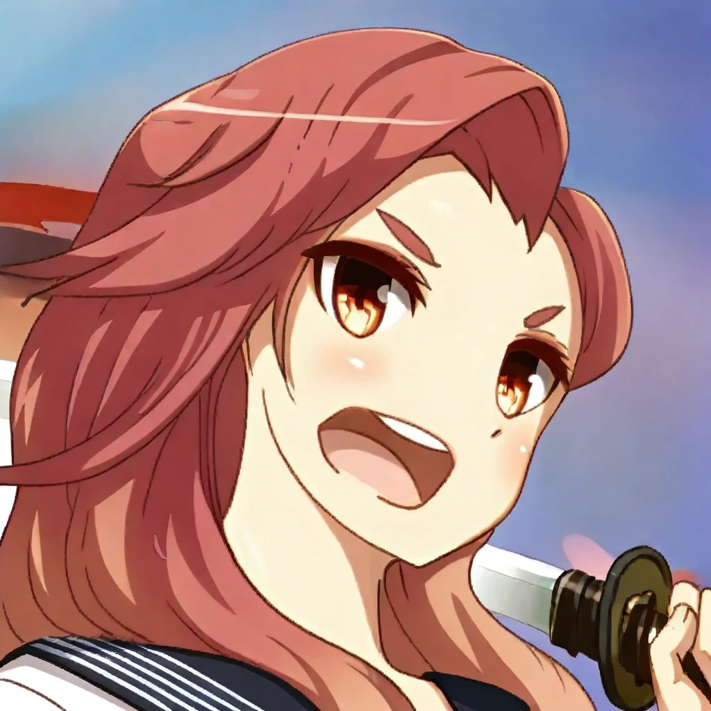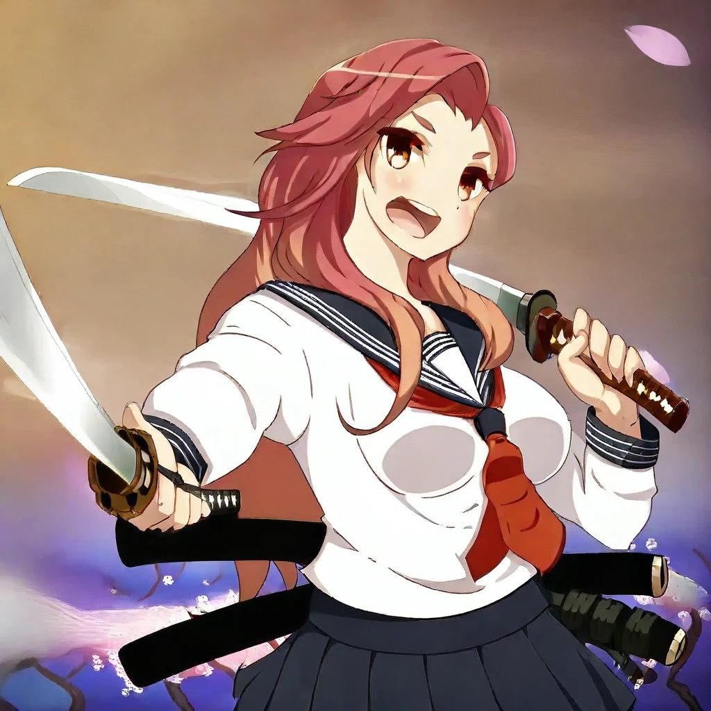 Musashi_koi-koi, school uniform, long sleeve, weapon, sword, serafuku, neckerchief, long hair, skirt, katana, brown eyes, sheath, pleated skirt,