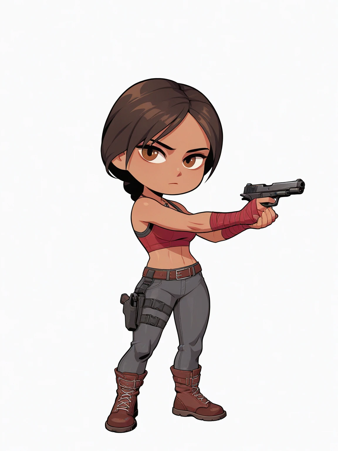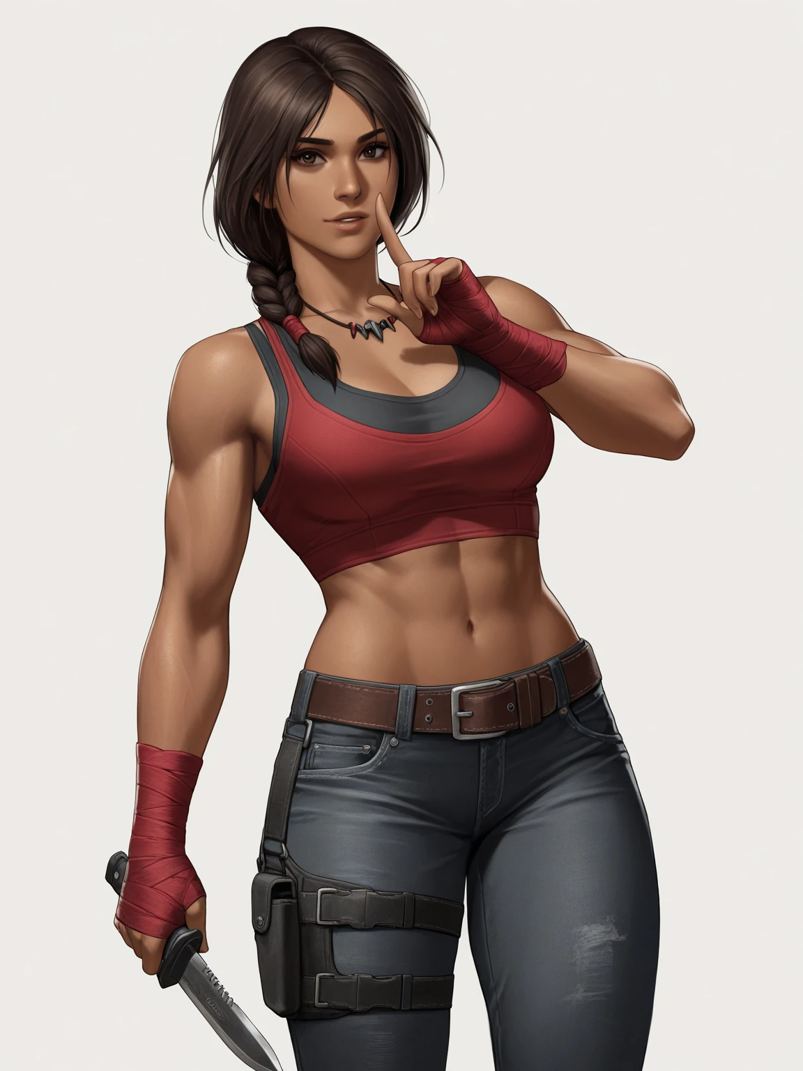 r6caveiraelite, necklace, crop top, sports bra, midriff, bandaged hands, belt, pants, thigh holster, denim