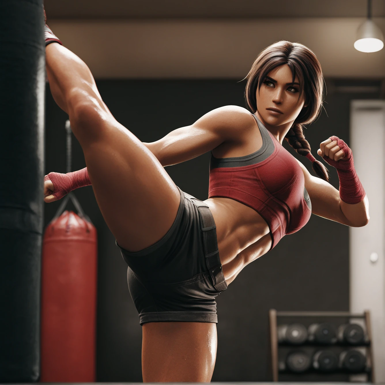 1girl, black hair, braid, brown eyes, dar-skinned female, toned
