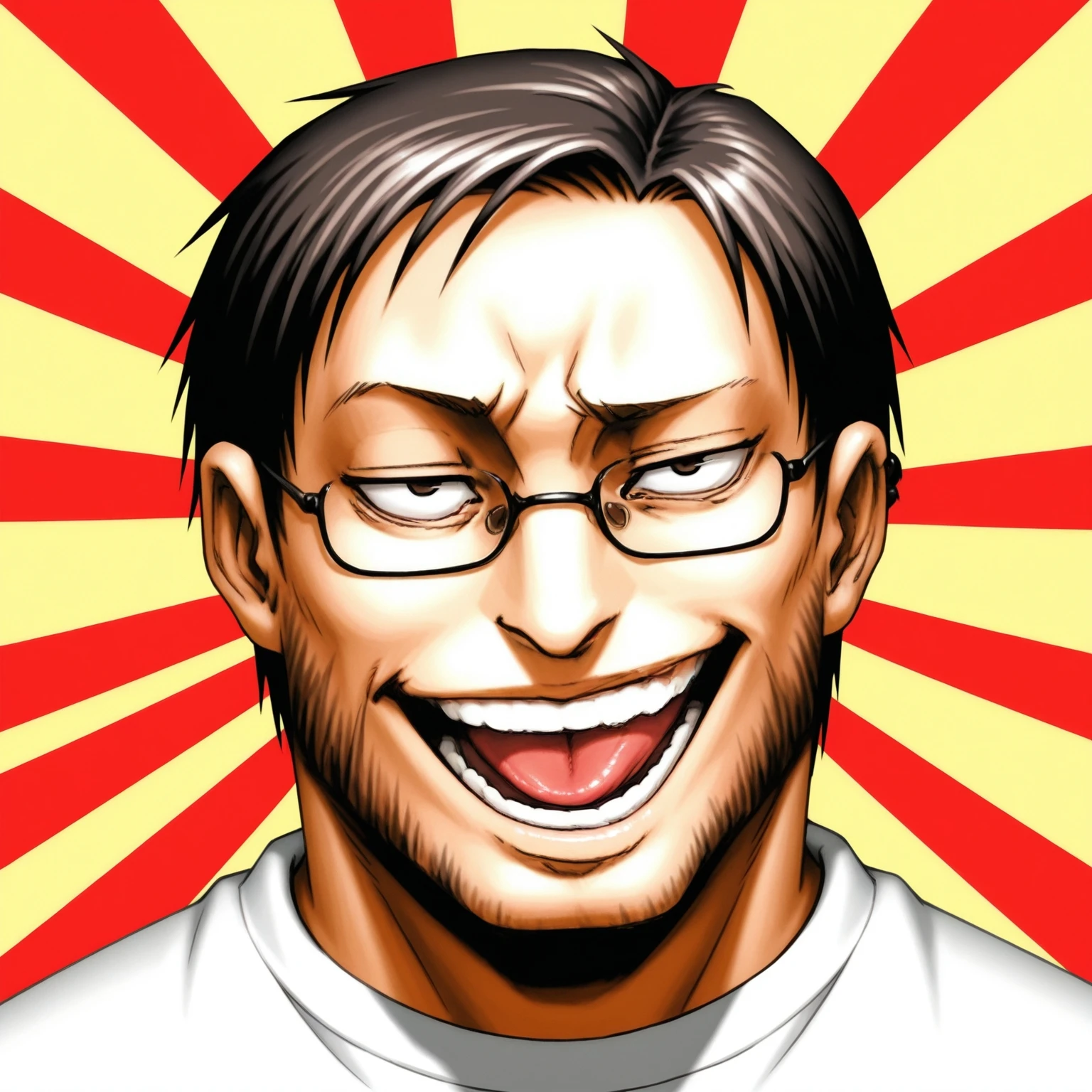 :d,grin,open mouth,sanpaku,tongue,(half closed eyes,raised eyebrow:0.8)