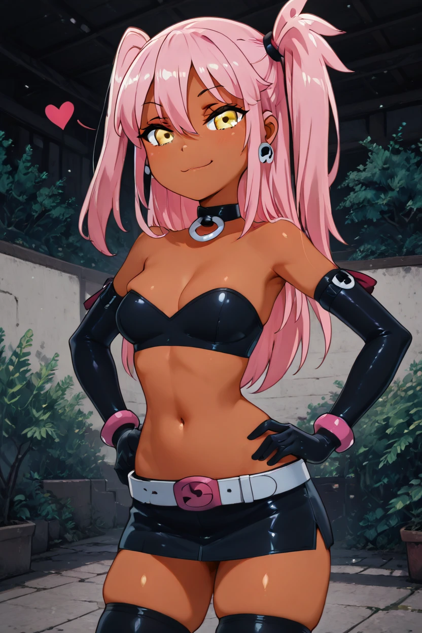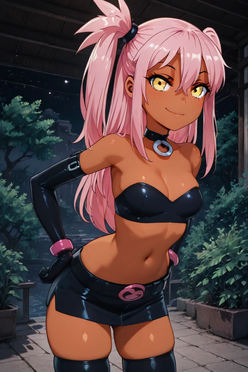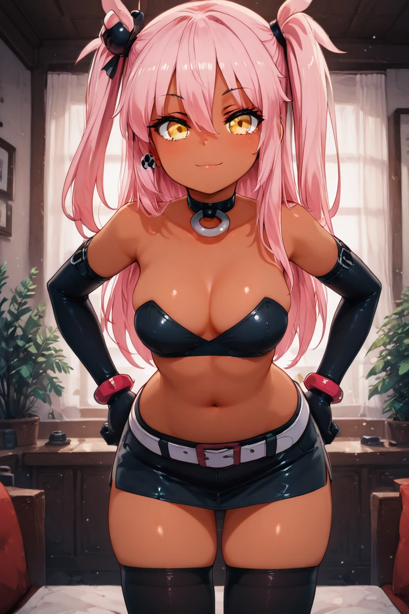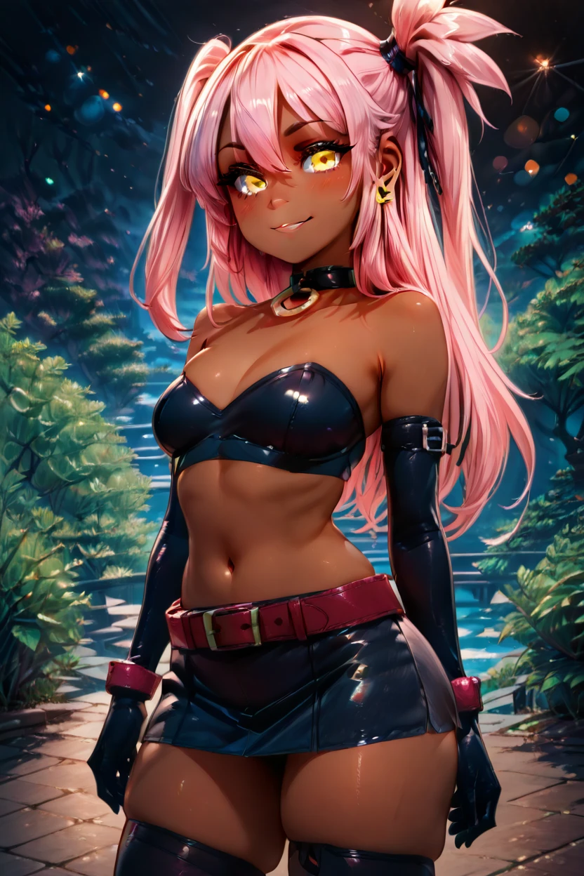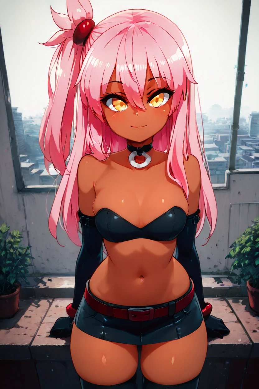 zzKuroEtnaCitron, hair between eyes, yellow eyes, long hair, one side up, pink hair, dark skin, choker, elbow gloves, black gloves, navel, black skirt, big belt, thighhighs, skindentation