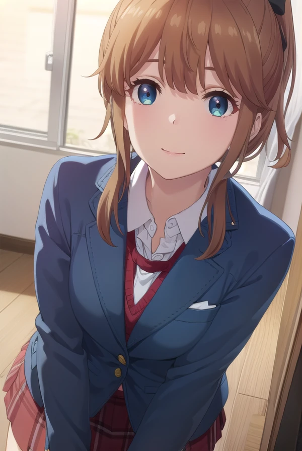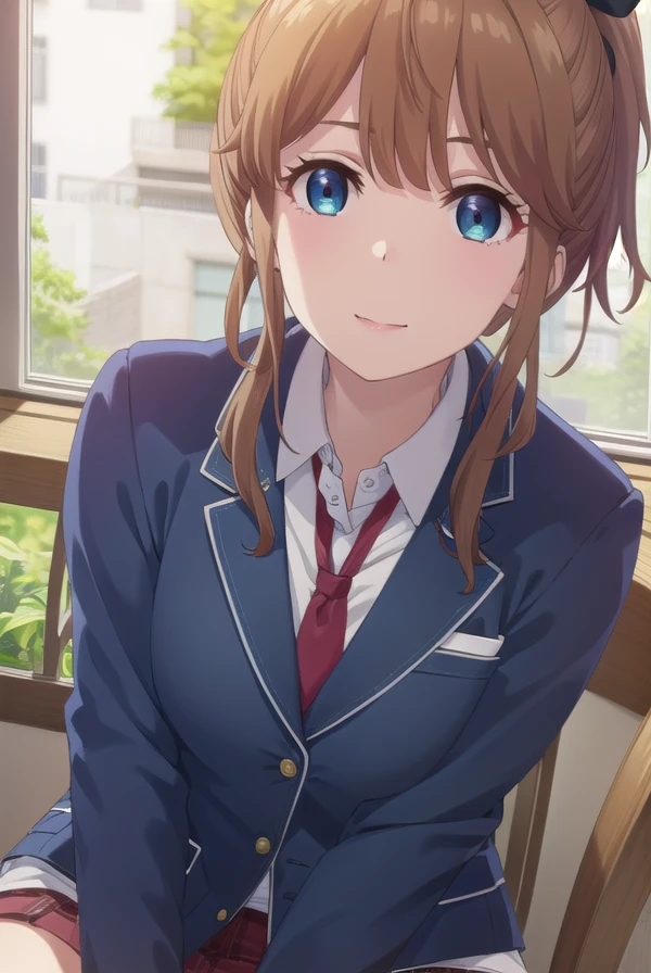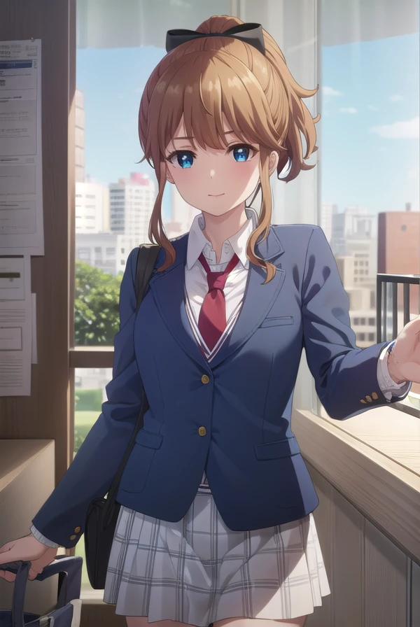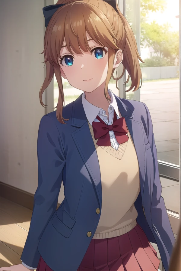akatsuki minami, blue eyes, brown hair, ponytail, hair bow, sidelocks, black bow,
