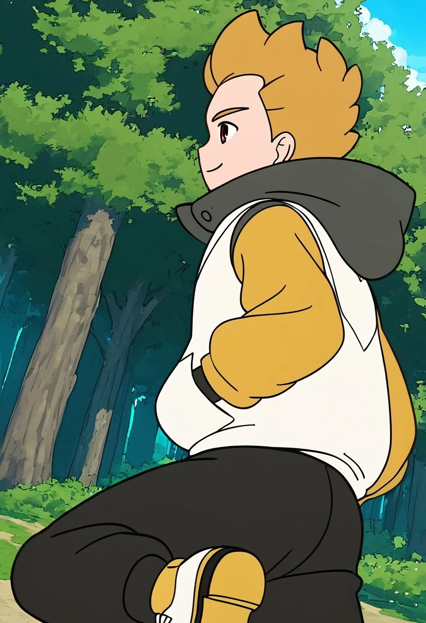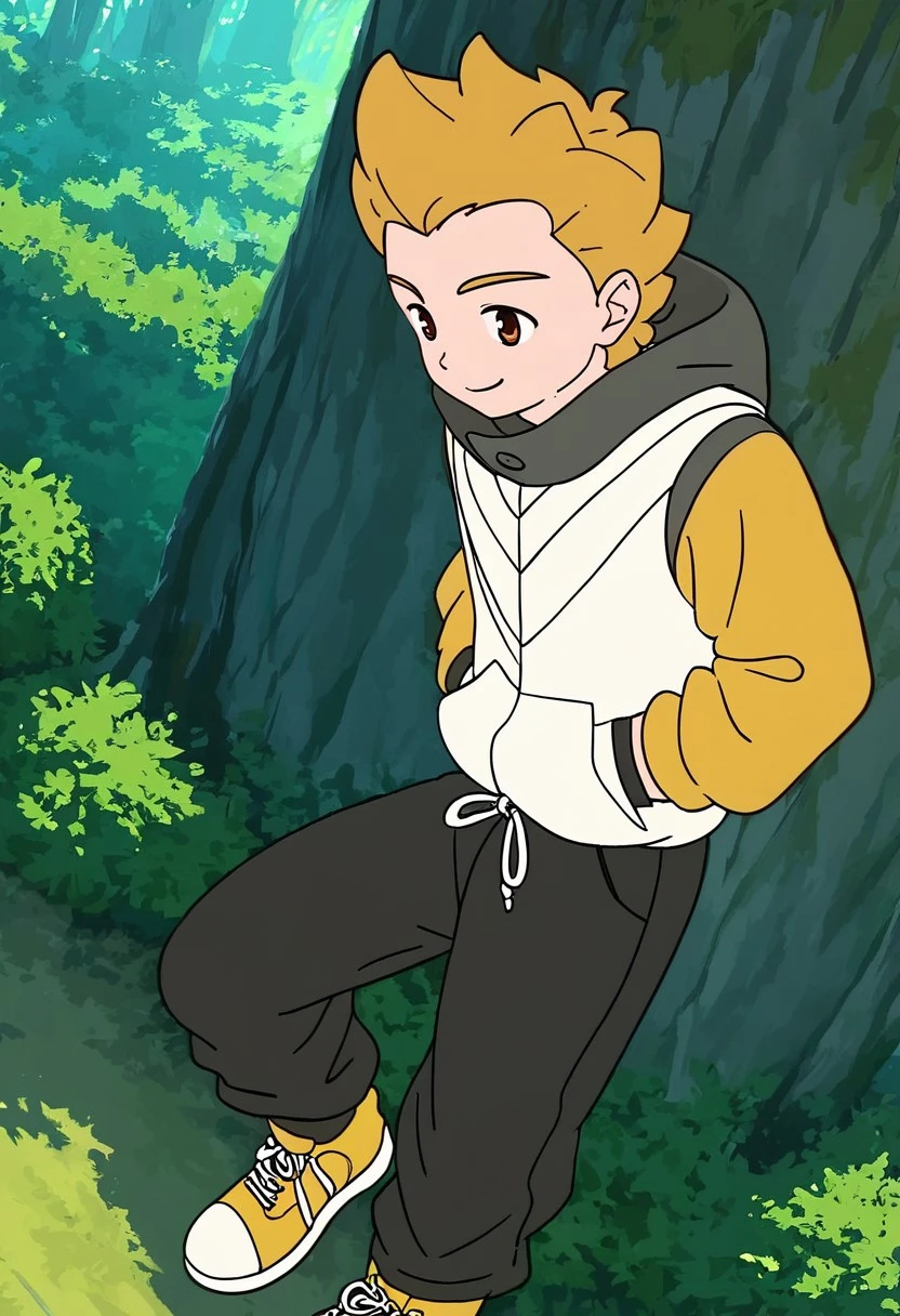 Yi, human form, solo, 1boy, blonde hair, brown eyes, yellow sweater, white vest, black hood, black and yellow gloves, black pants, yellow shoes
