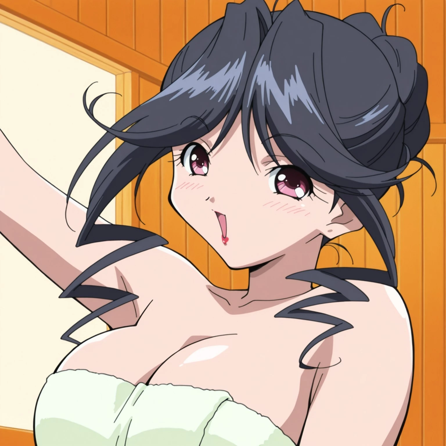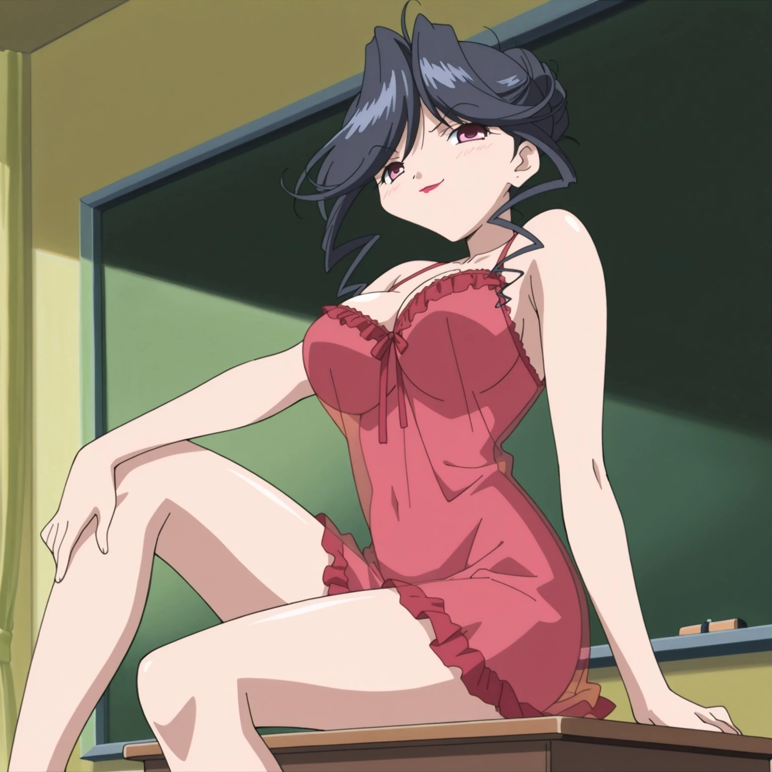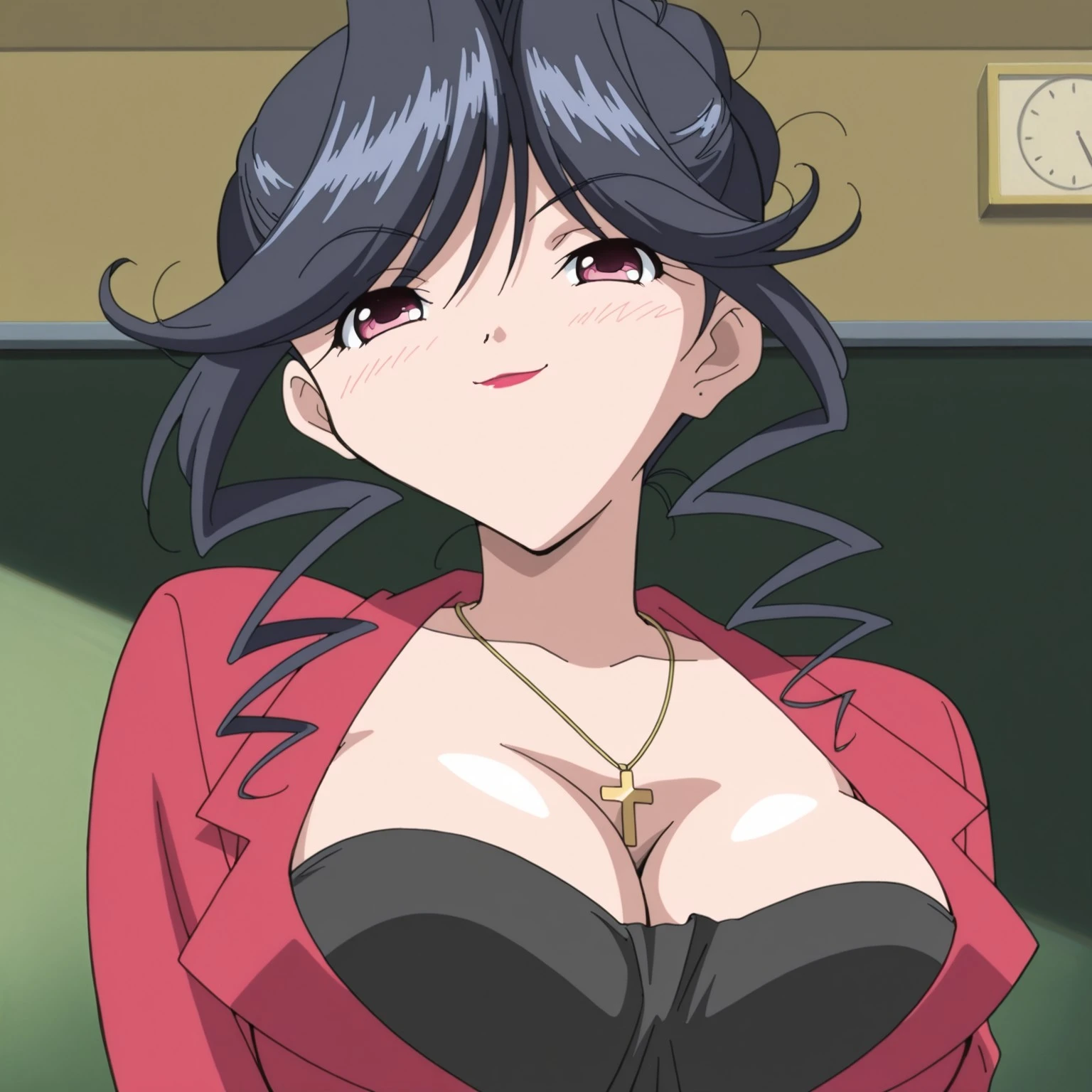 mitsukaydears, 1990s (style), mature slim female, black hair, pink eyes, red lipstick, gold cross necklace, big breasts, red business suit, black tubetop under suit, cleavage, pencil skirt, gold waist chain, pink thighhighs, red highheels