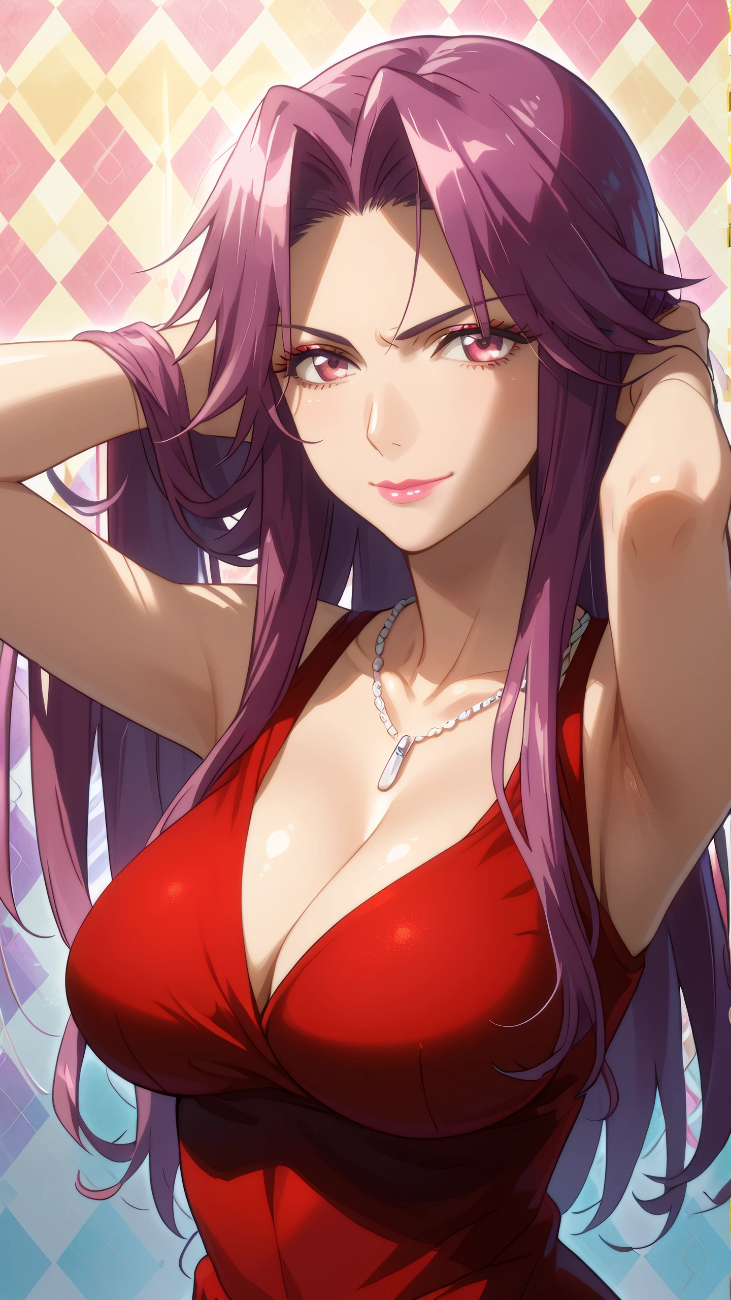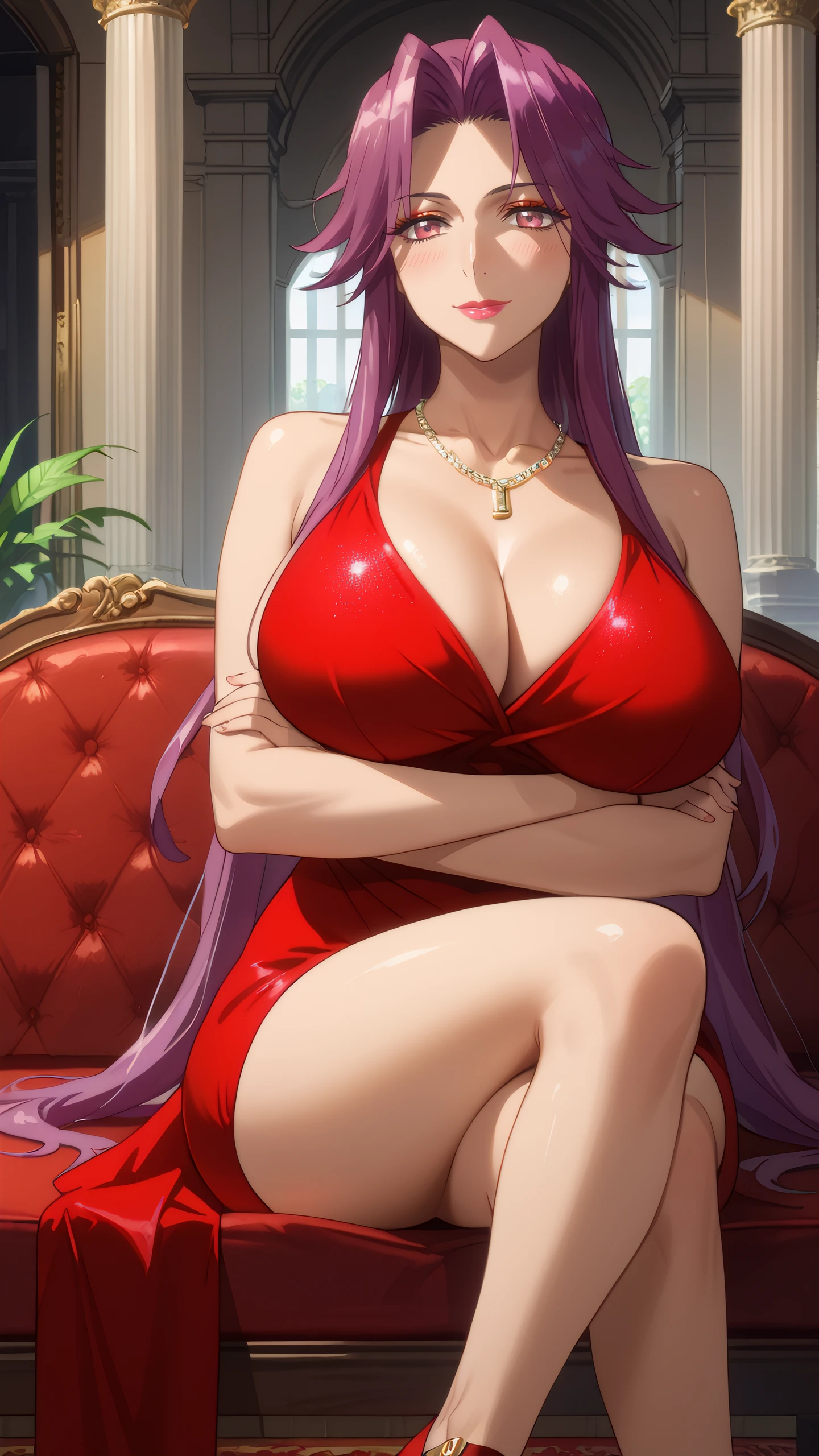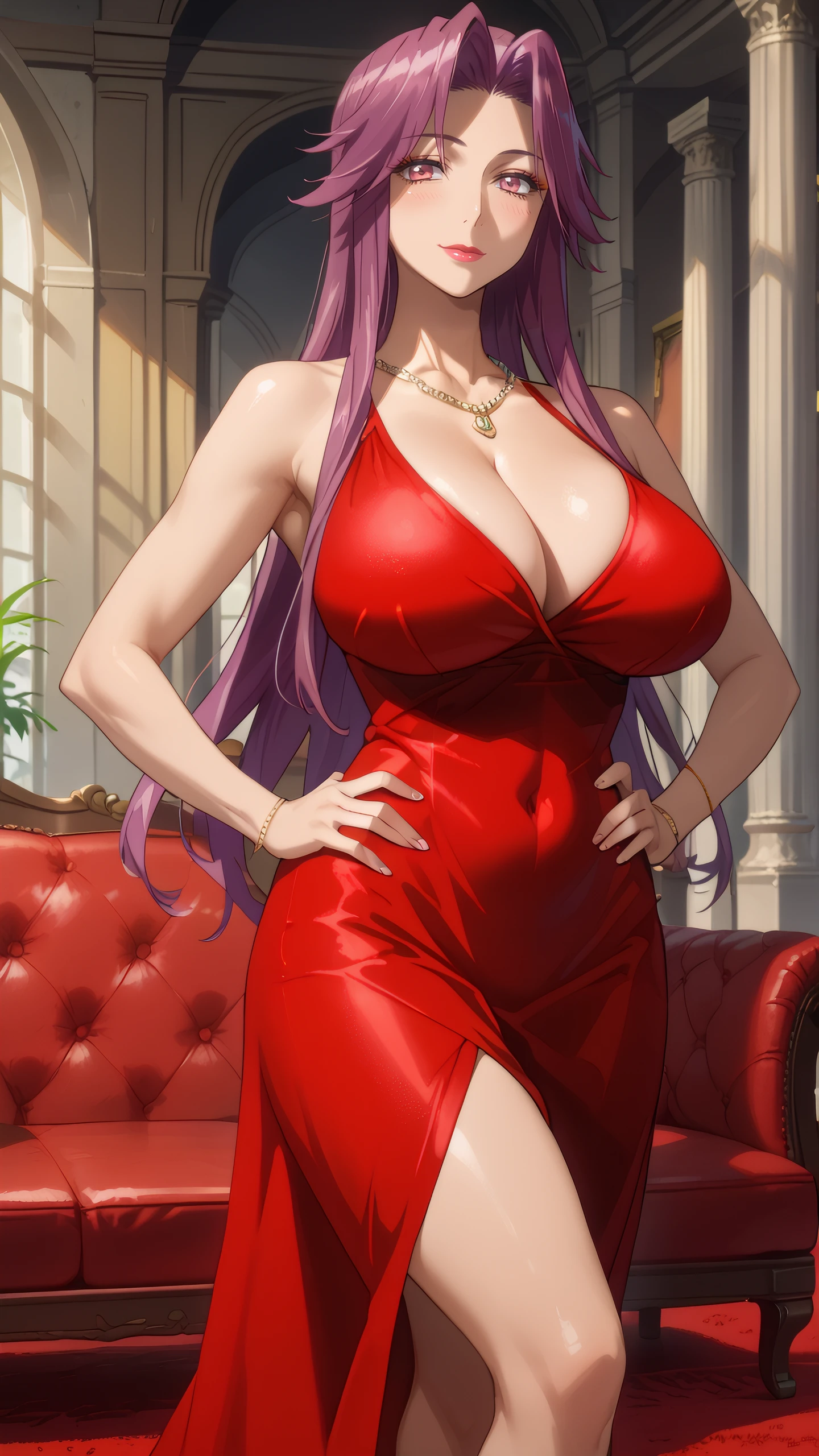 yuriko_takagi, pink eyes, purple hair, long hair, jewelry, necklace, lipstick, makeup, red dress,bare shoulders, Description