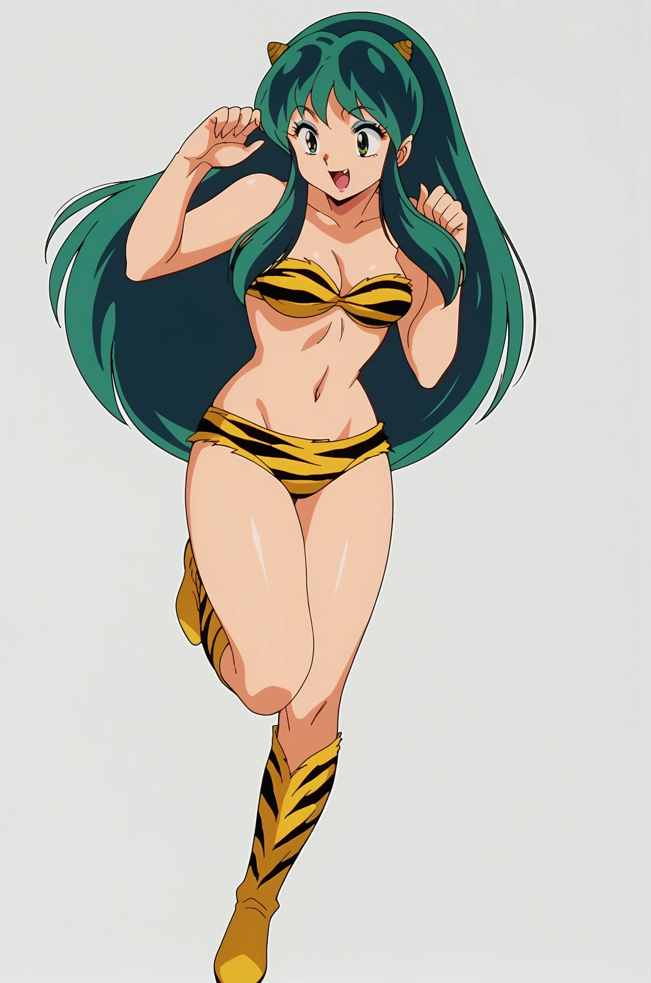 navel, swimsuit, bikini, boots, strapless, knee boots, animal print, oni horns, oni, tiger print, strapless bikini