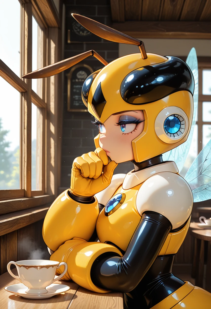 honeywoman, helmet, antennae, blue eyes, eyeshadow, ????????, skirt, yellow gloves, white boots, insect wings