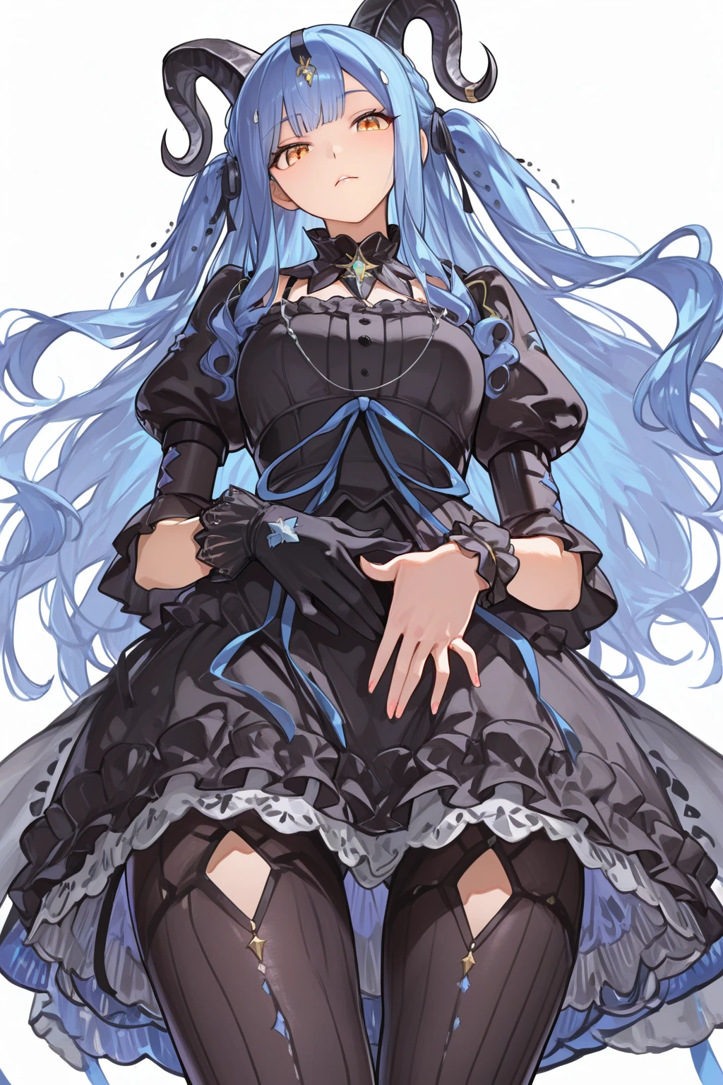 black_dress, puffy_short_sleeves, short_sleeves, black_gloves,single glove, black_pantyhose, white background, demon tail, tail ring,