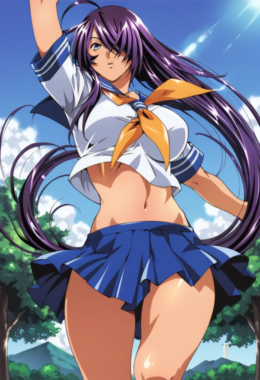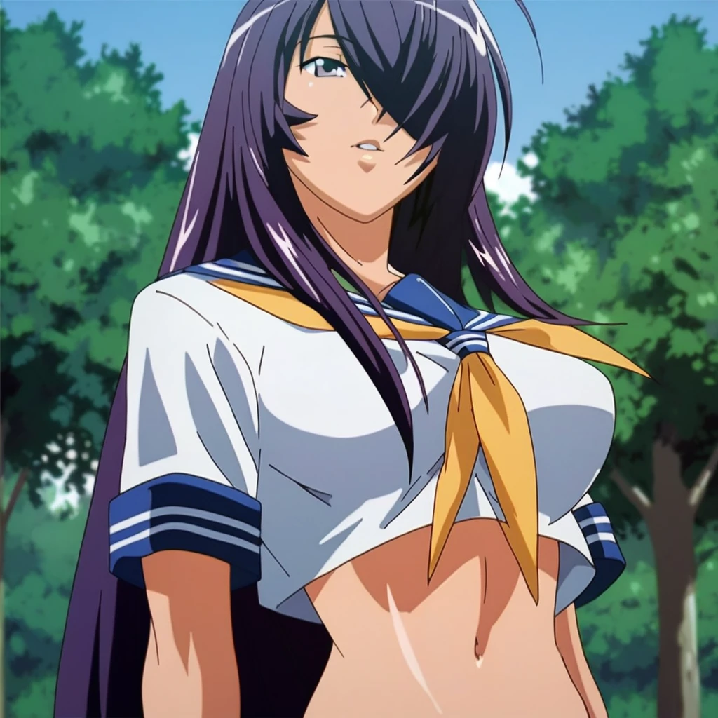 Trigger: kanu, large breasts, hair over one eye, very long hair, school uniform, skirt, navel, purple hair
