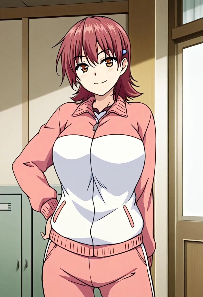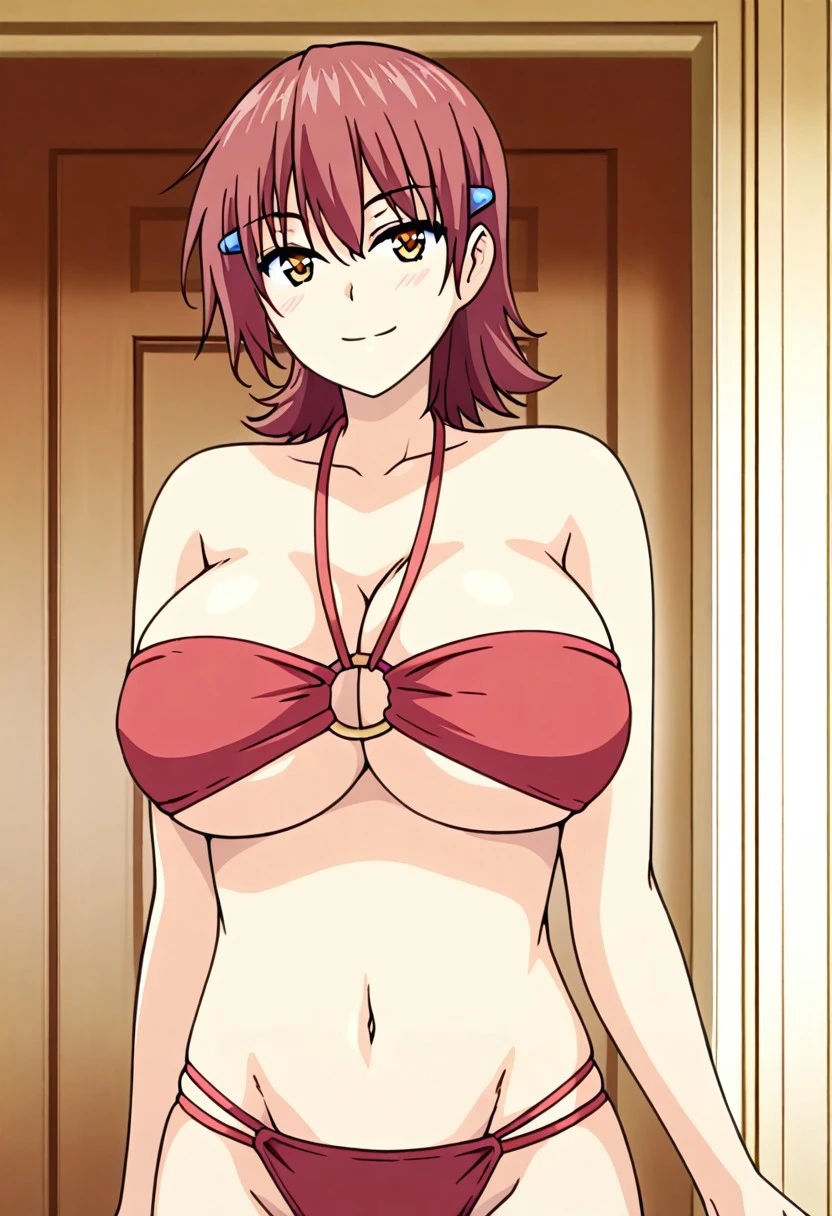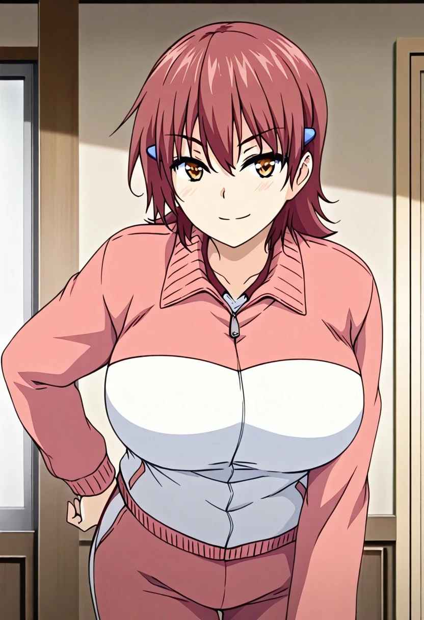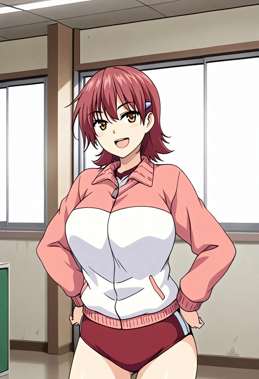 saki hoshino ikkyuu nyuukon anime style, red hair, short hair, hairclip, brown eyes, large breasts,