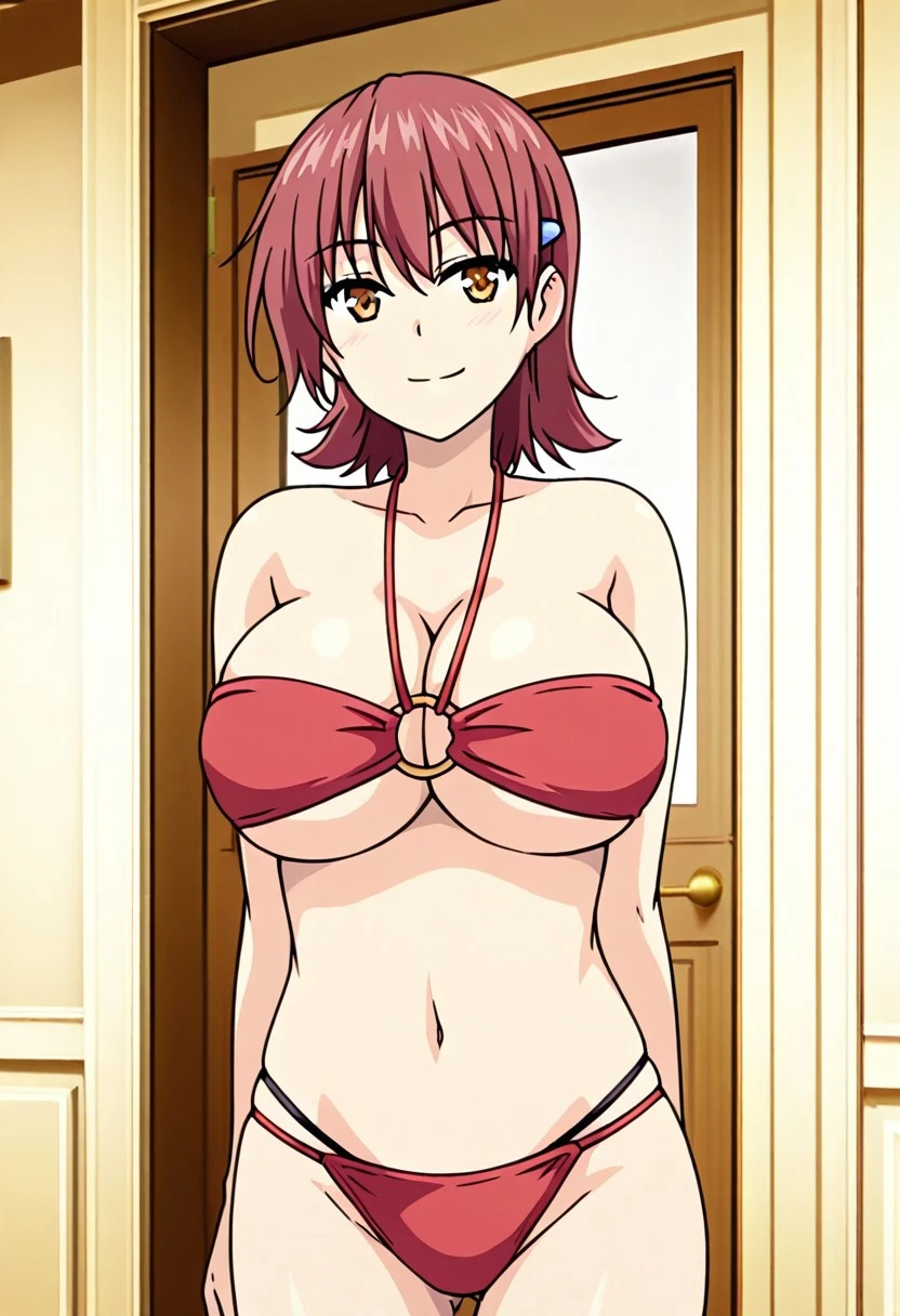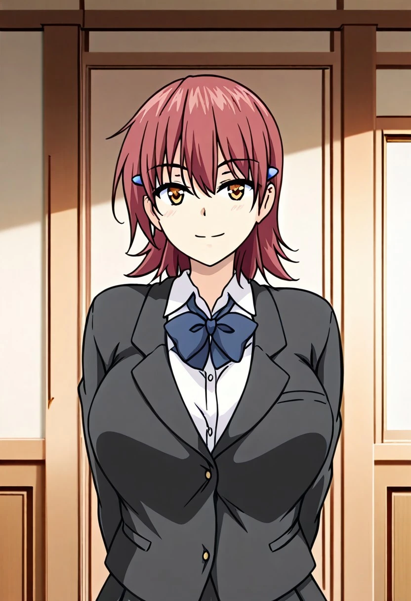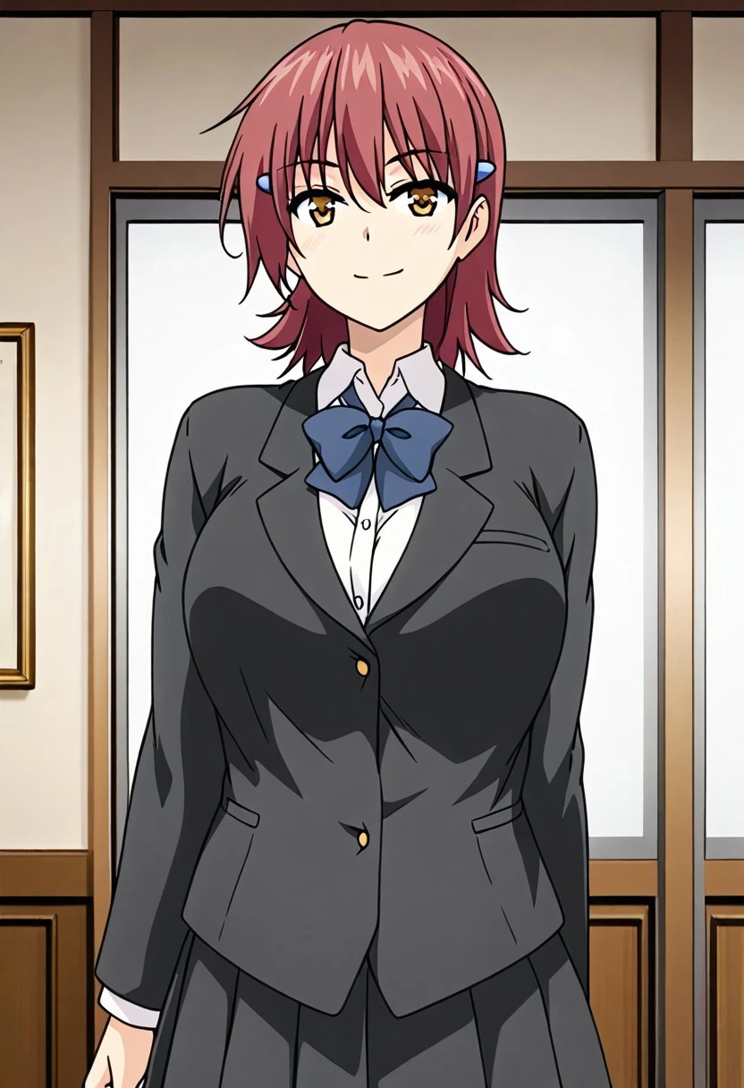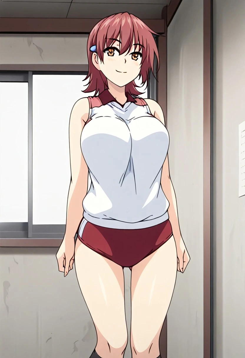 saki hoshino ikkyuu nyuukon anime style, red hair, short hair, hairclip, brown eyes, large breasts,