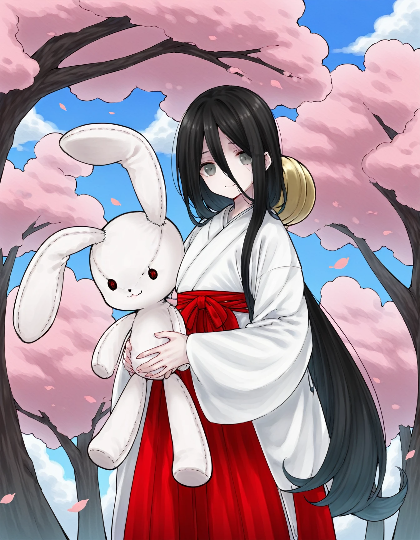 使用可能なプロンプト例: white skin, holding stuffed toy, stuffed rabbit, miko, kimono, hakama, japanese clothes, zouri, tabi, hakama skirt, red hakama, white kimono,