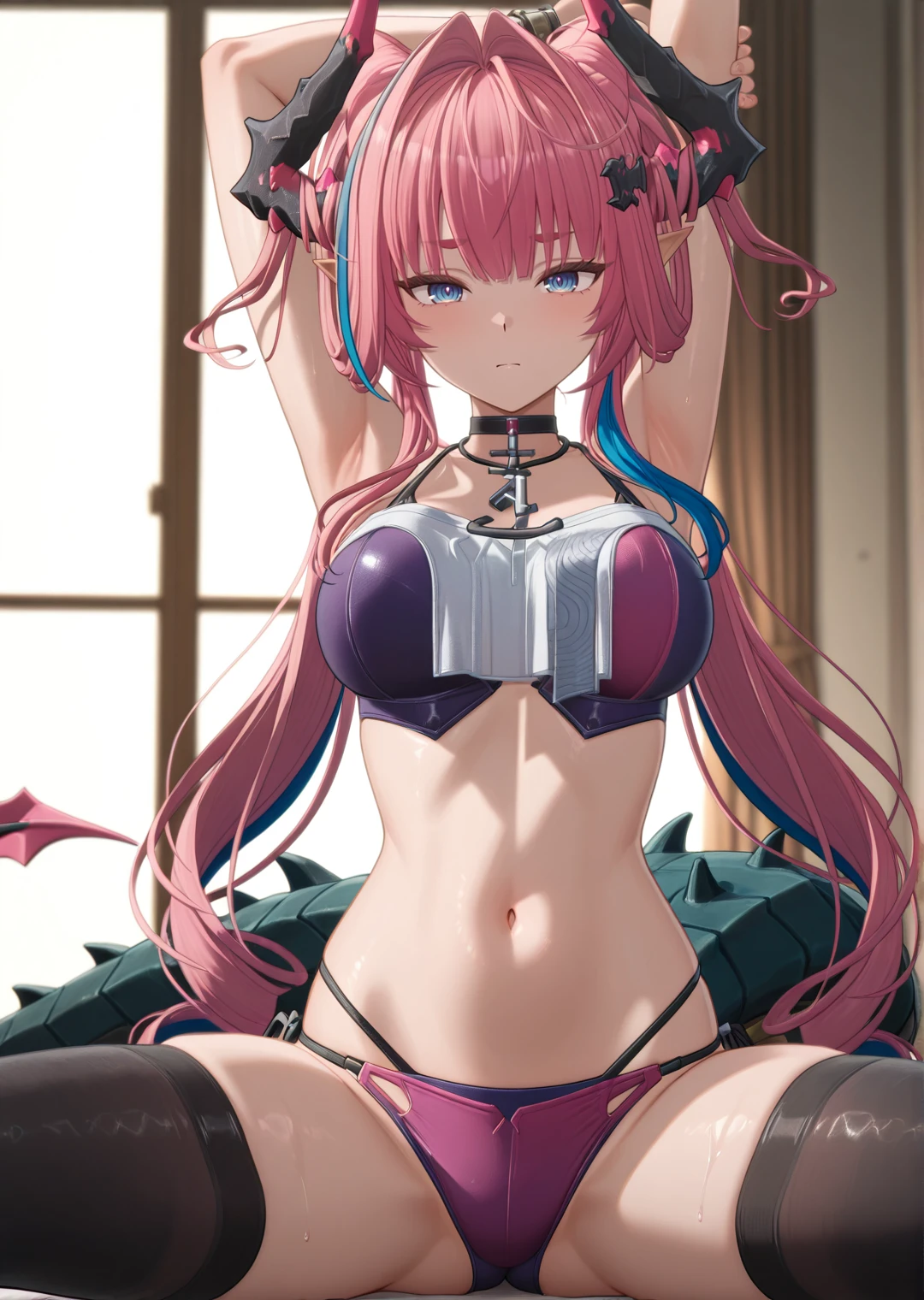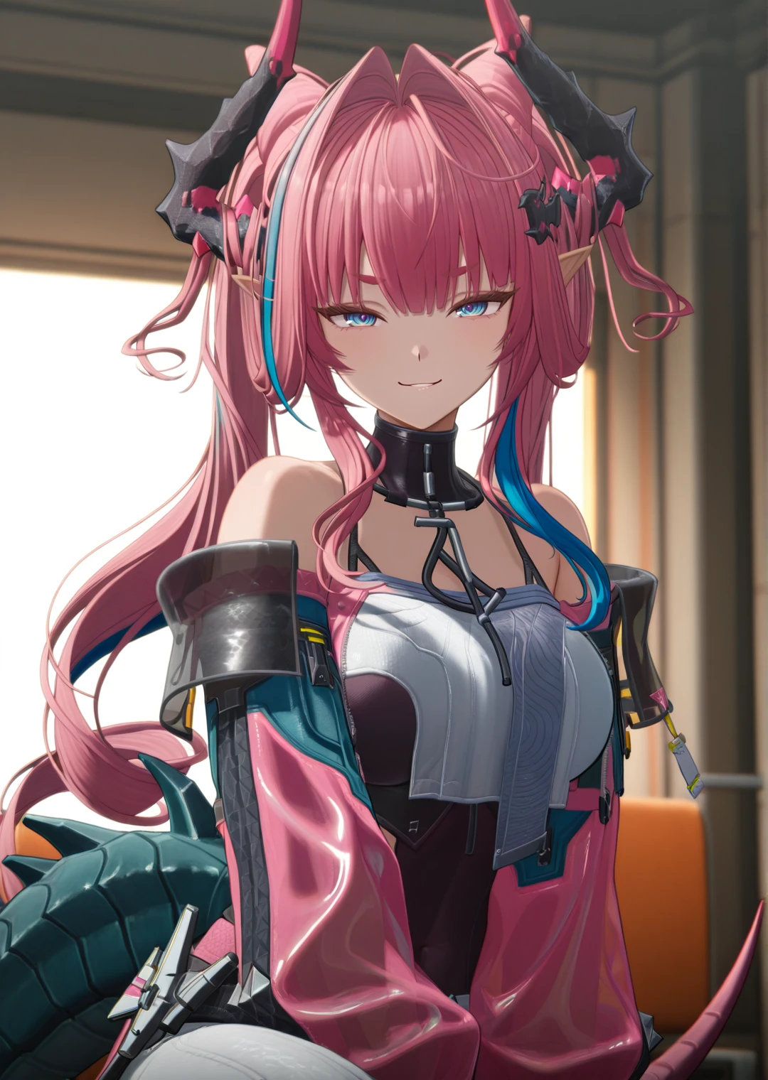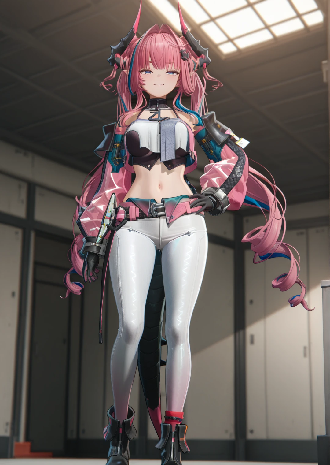midriff, black gloves, black footwear, crop top, shoulders, belt, ankle boots, white pants, pink jacket, multicolored hair, blue hair, very long hair, red socks, tail