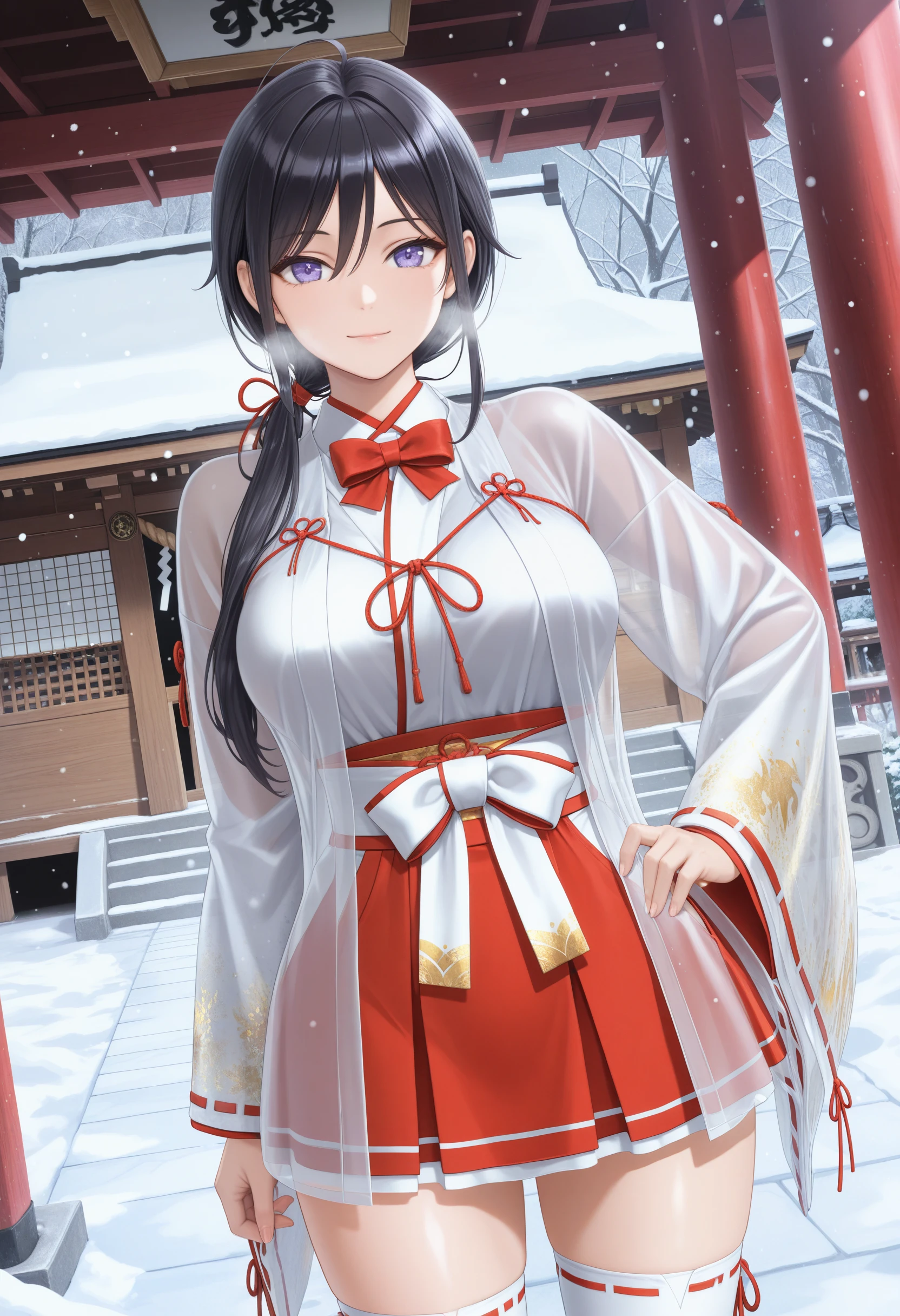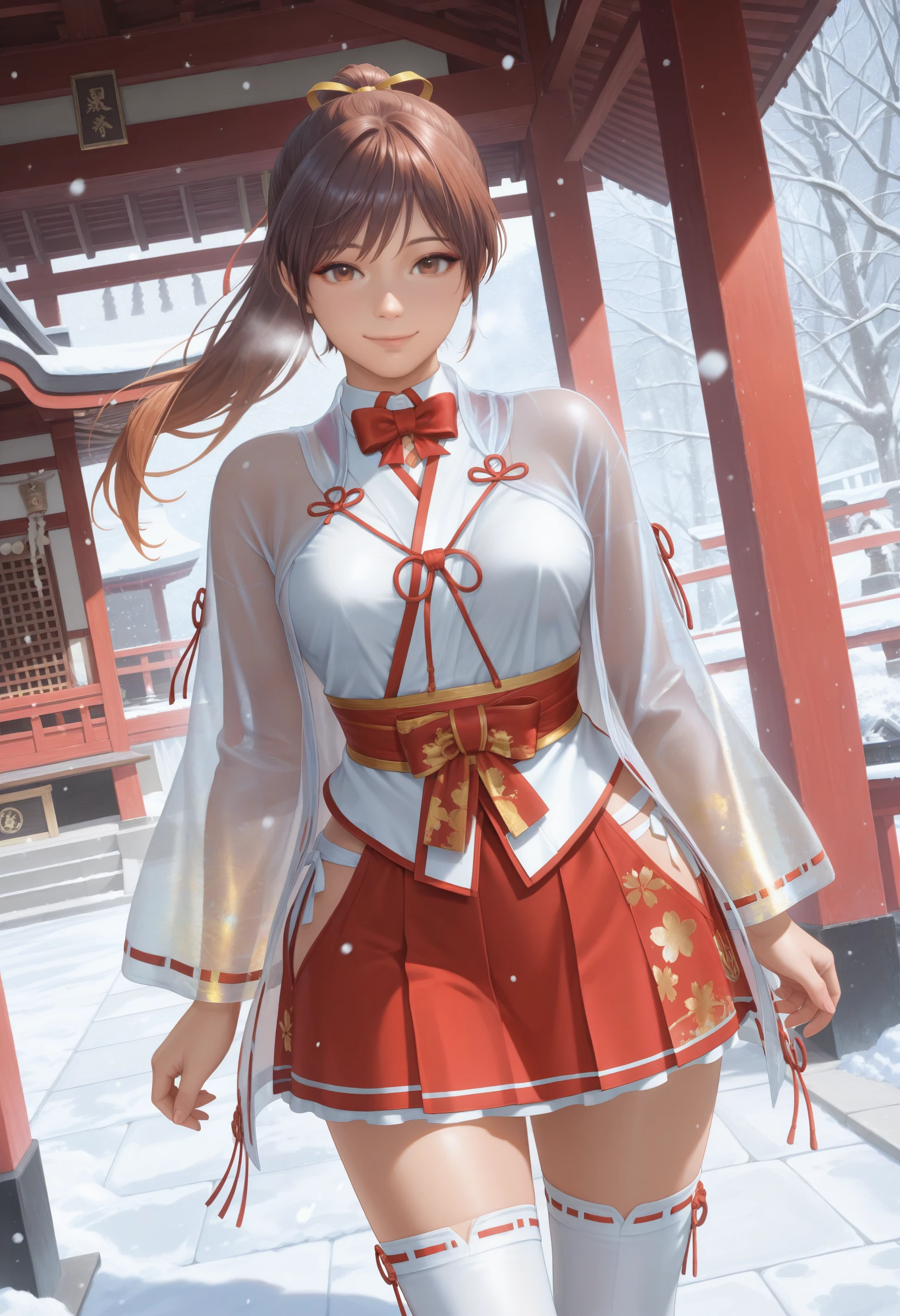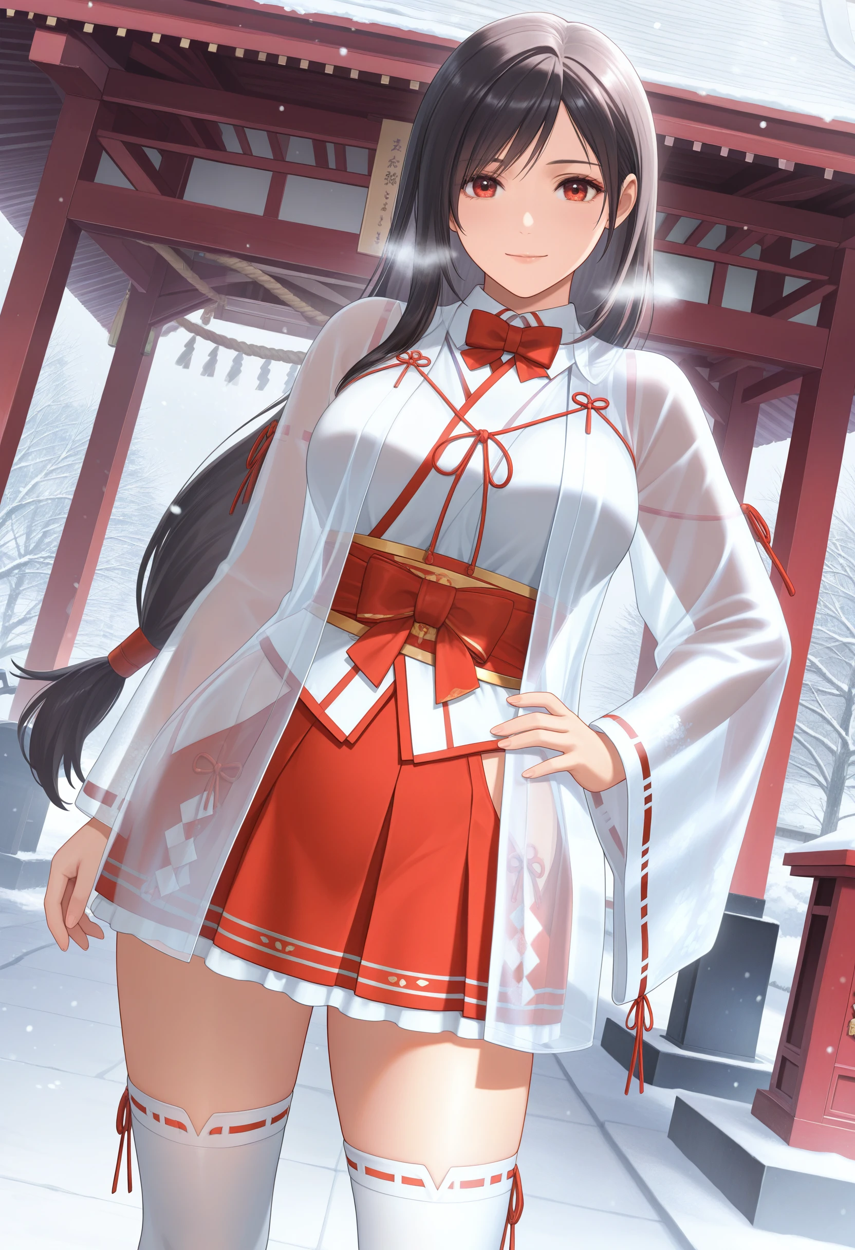 ZuiunnoChihaya,red bowtie,miko,see-through jacket over white kimono, chihaya (clothing) ,ribbon-trimmed long sleeves,sheer fabric,soft gold patterns wide sleeves, red hakama miniskirt,ribbon-trimmed thighhighs,zouri