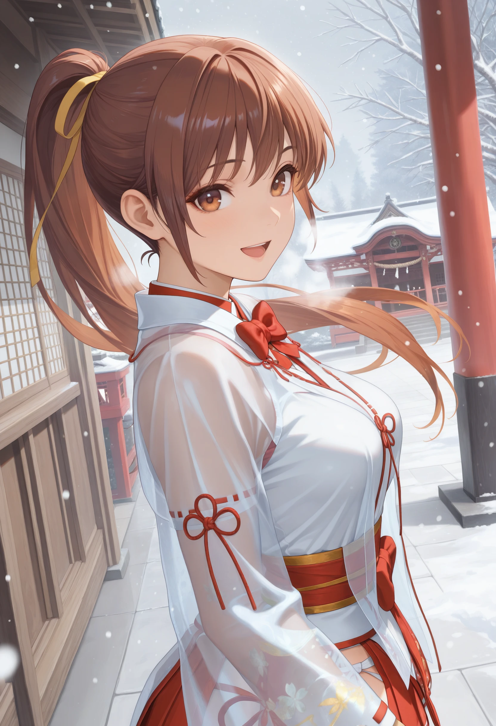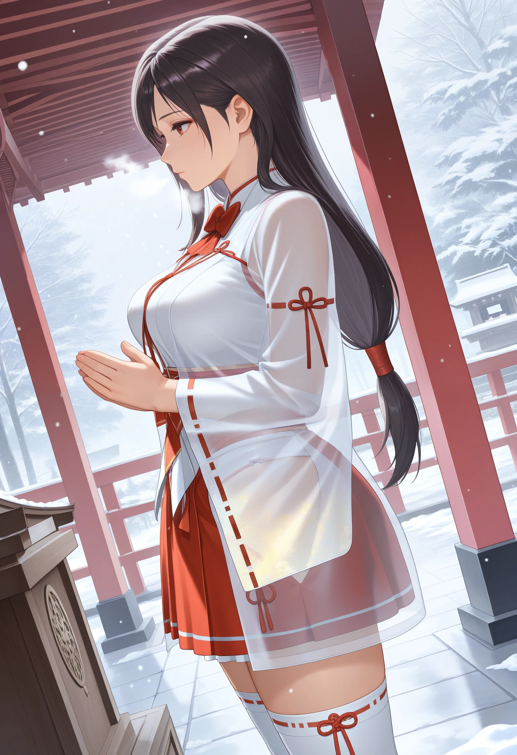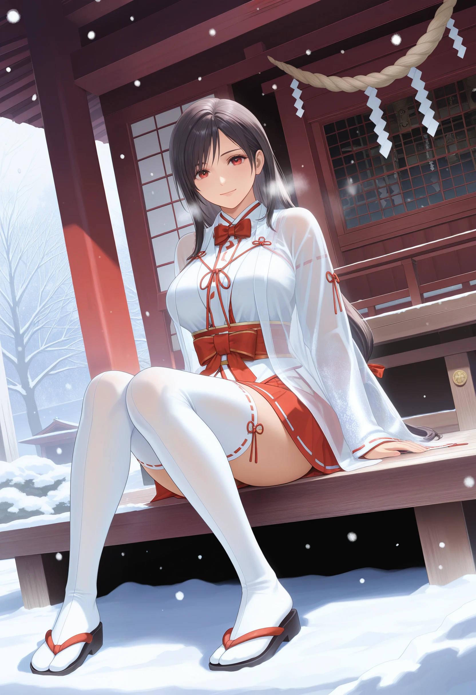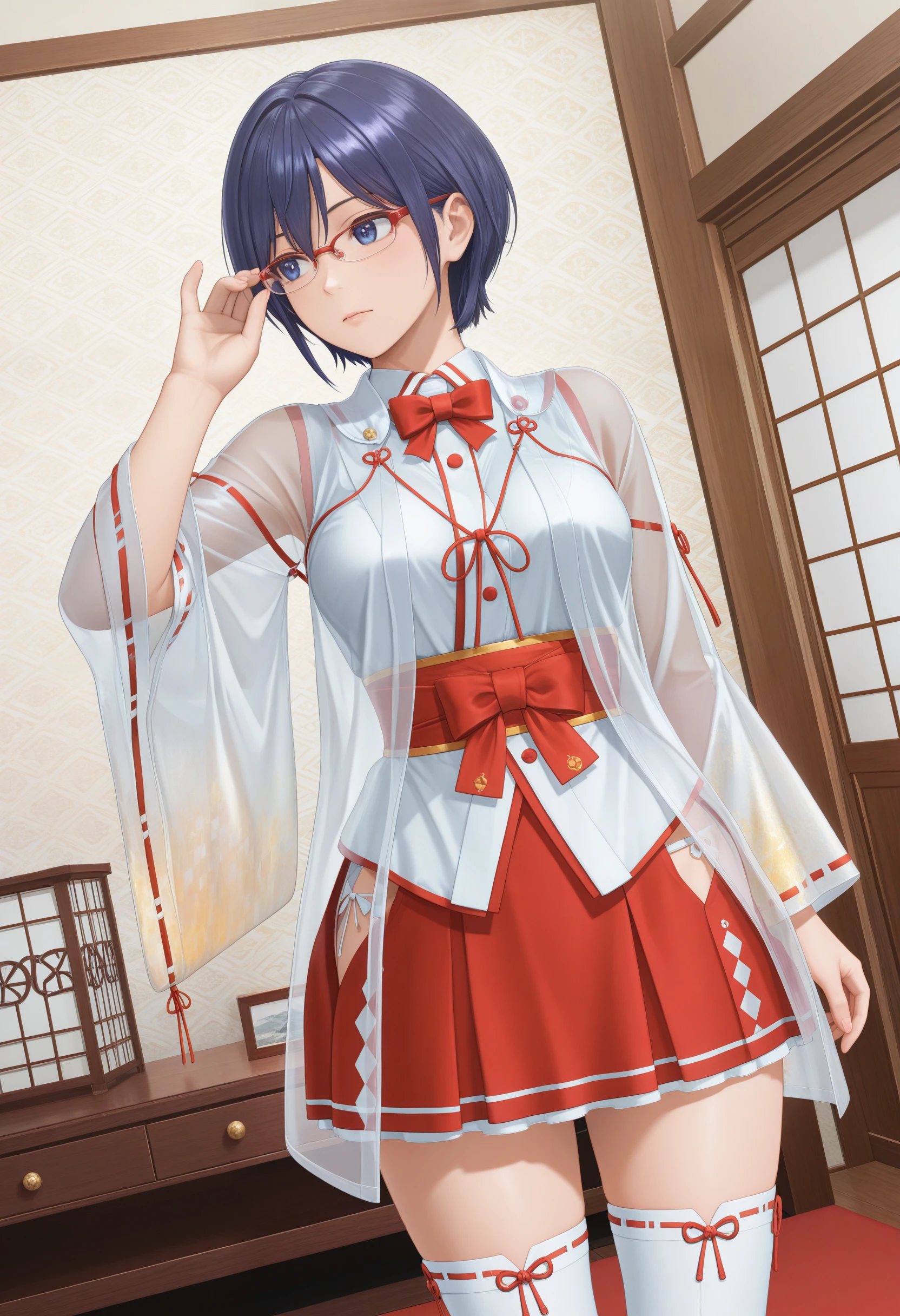 ZuiunnoChihaya,red bowtie,miko,see-through jacket over white kimono, chihaya (clothing) ,ribbon-trimmed long sleeves,sheer fabric,soft gold patterns wide sleeves, red hakama miniskirt,ribbon-trimmed thighhighs,zouri