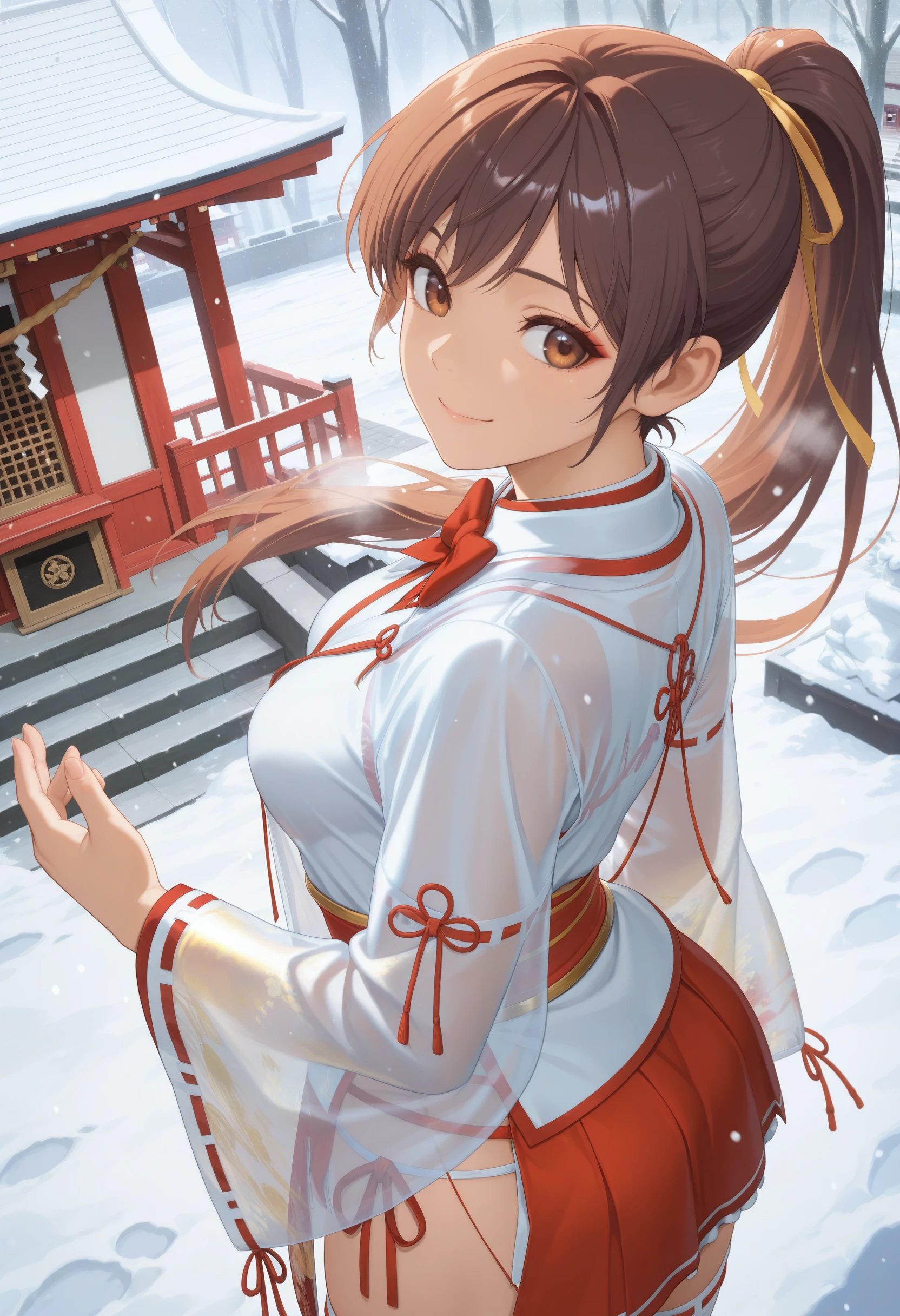 基本プロンプト:"ZuiunnoChihaya,red bowtie,miko,see-through jacket over white kimono, chihaya_(clothing) ,ribbon-trimmed long sleeves,sheer fabric,soft gold patterns wide sleeves, red hakama miniskirt,ribbon-trimmed thighhighs,zouri"