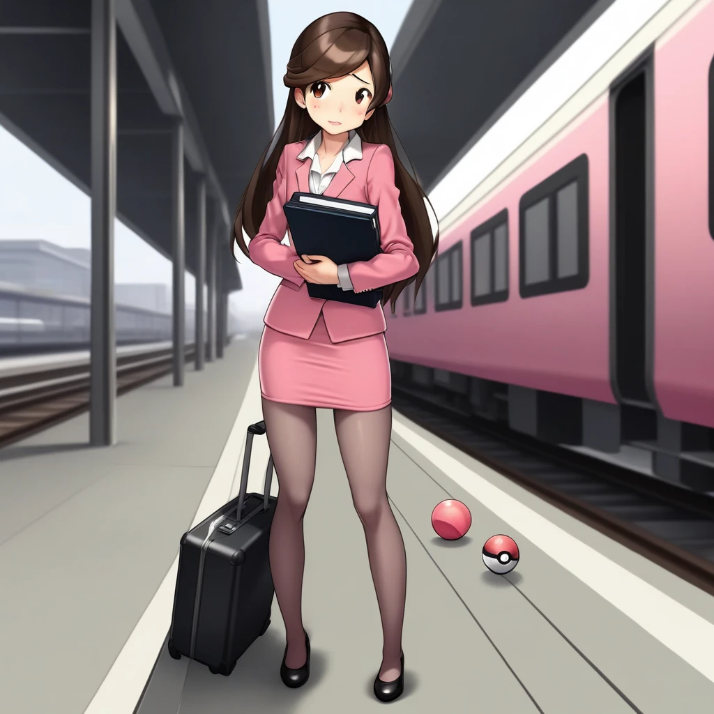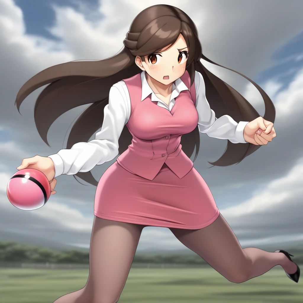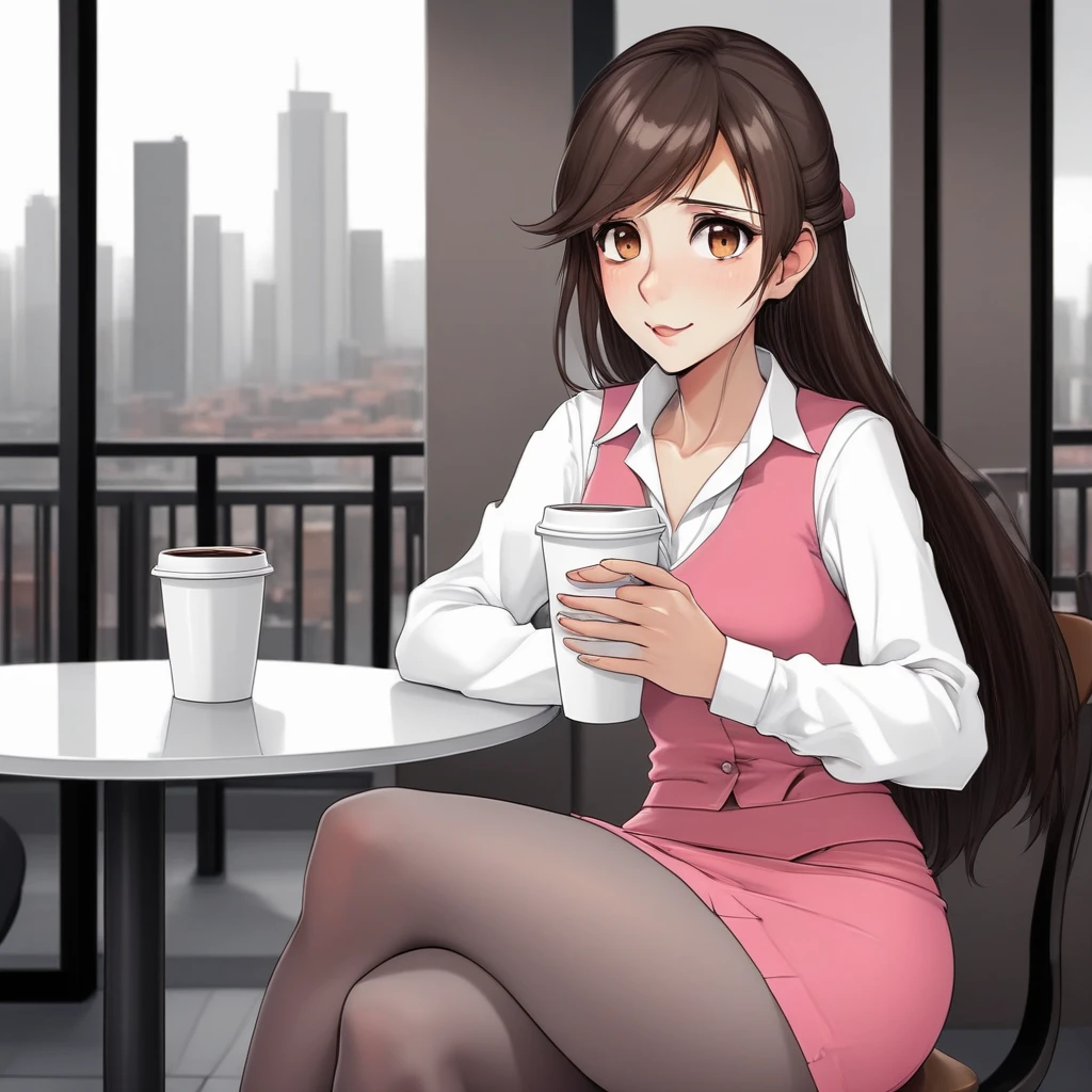 white collar, pink dress, pantyhose, high heels,