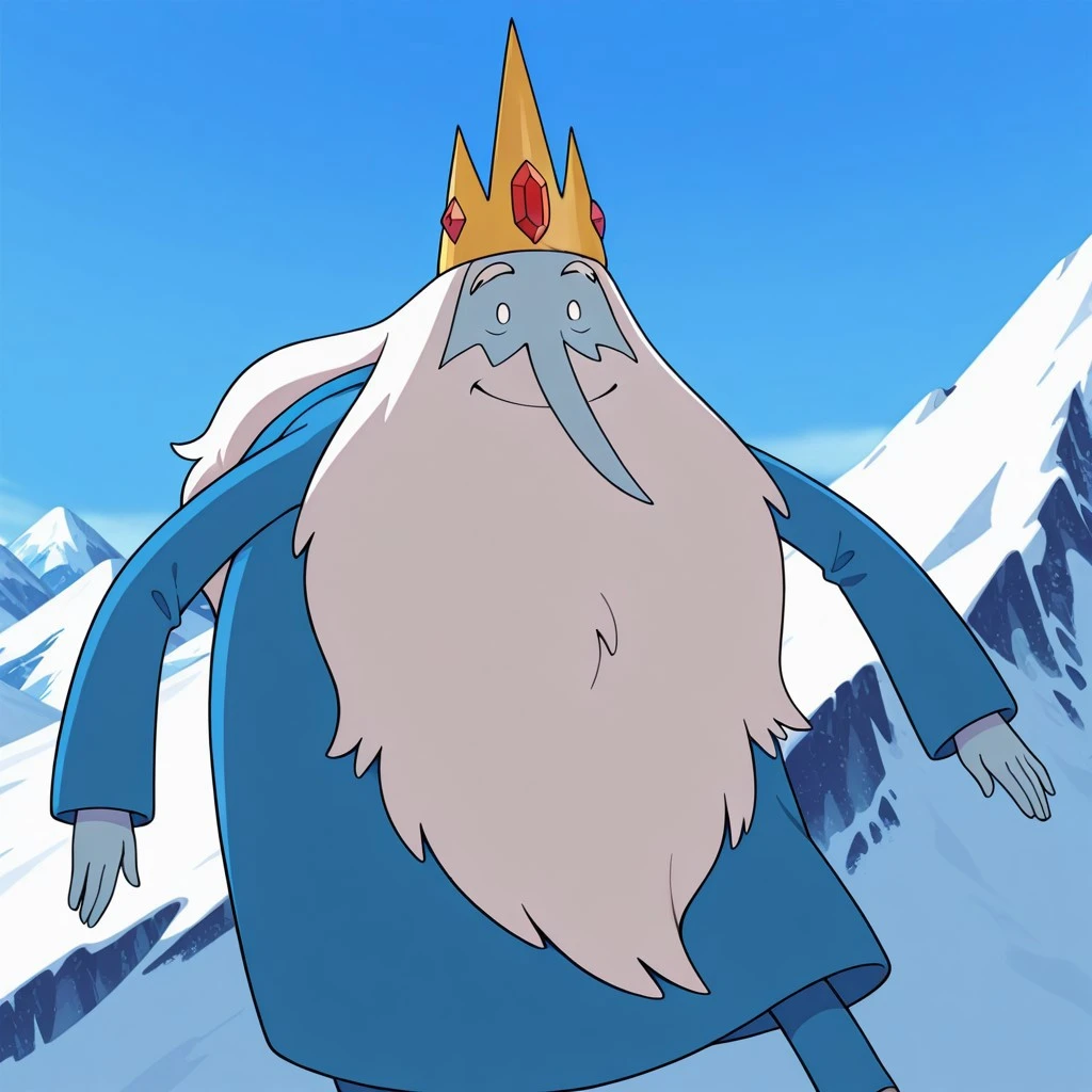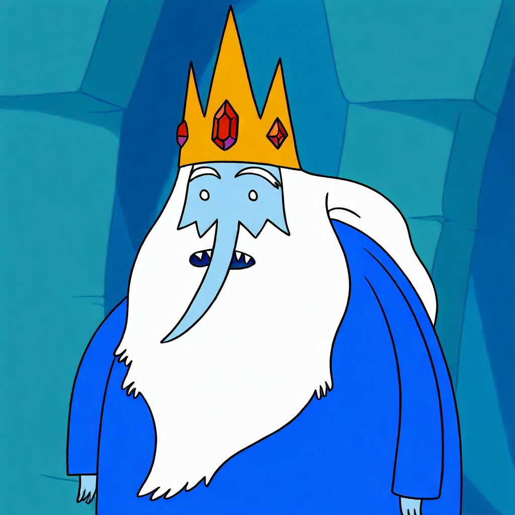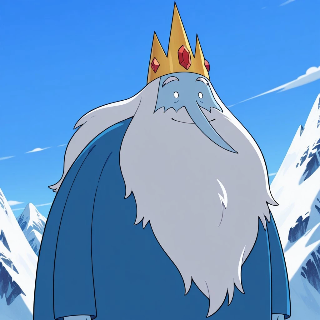 IceKing, 1 boy, White eyes, dot pupils, Crown, white beard, long beard, blue skin, blue tunic,