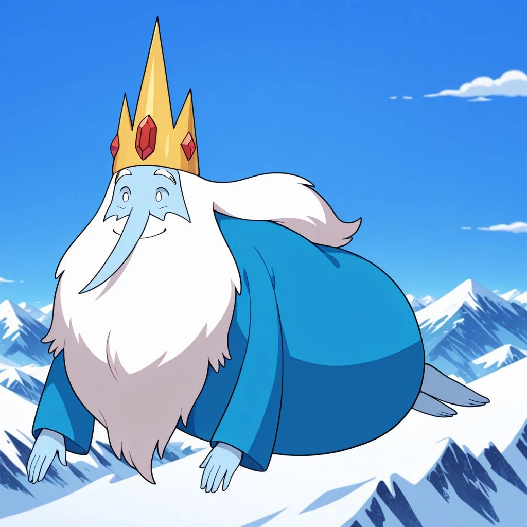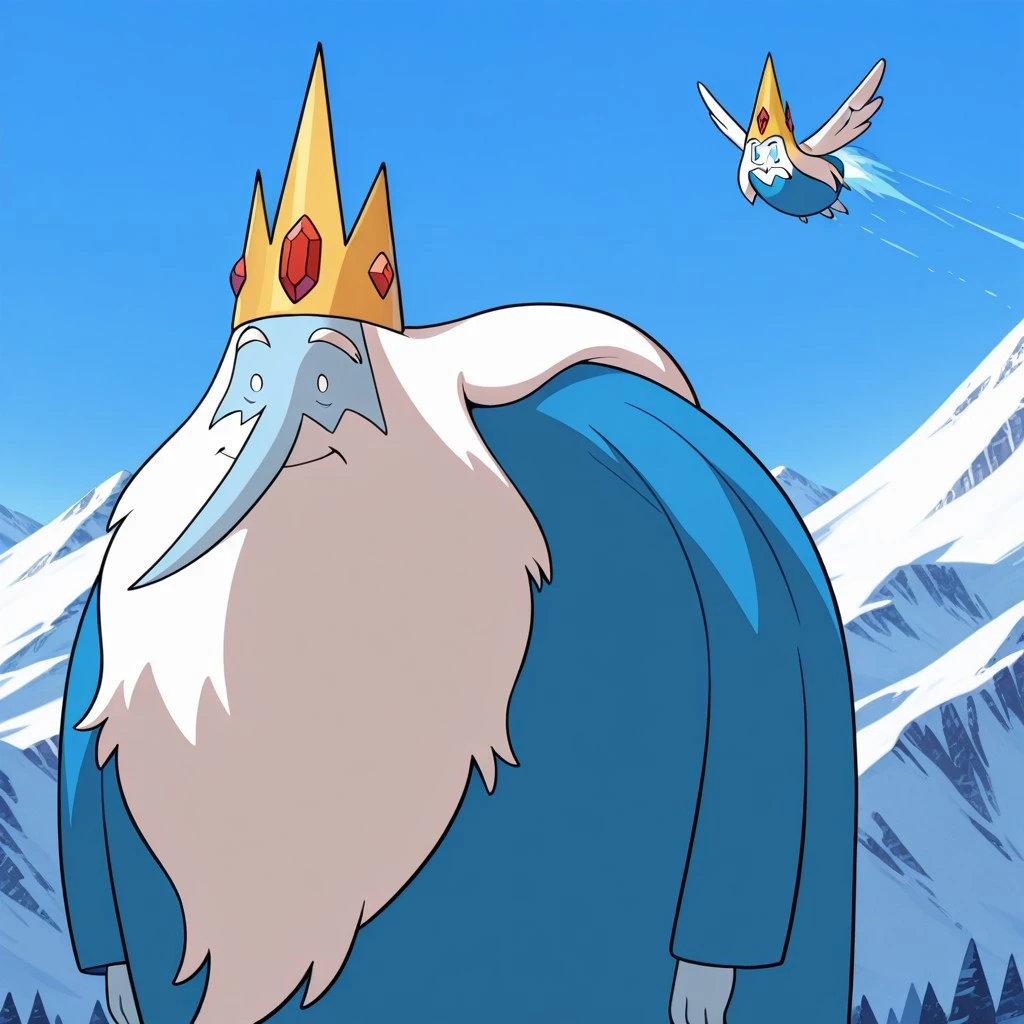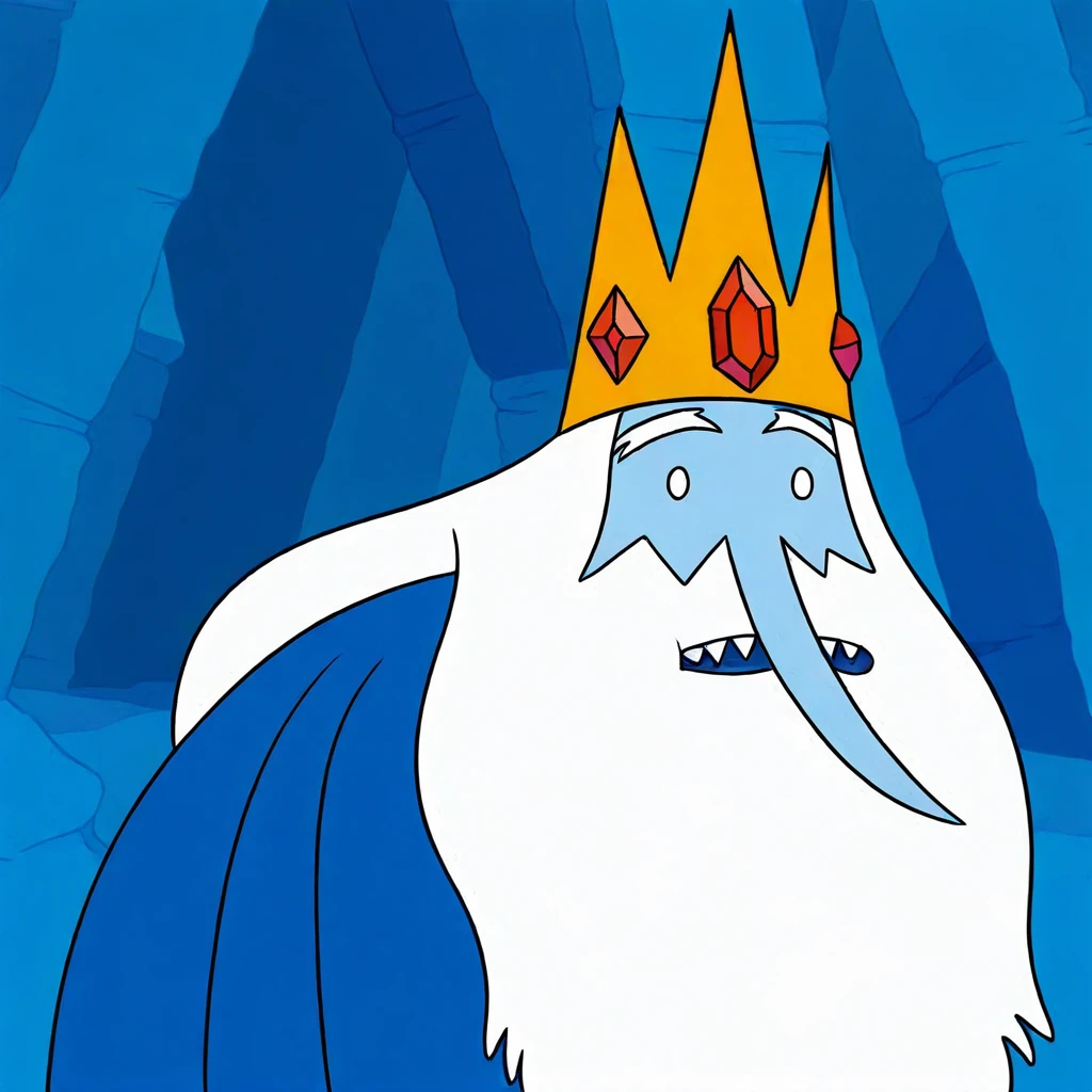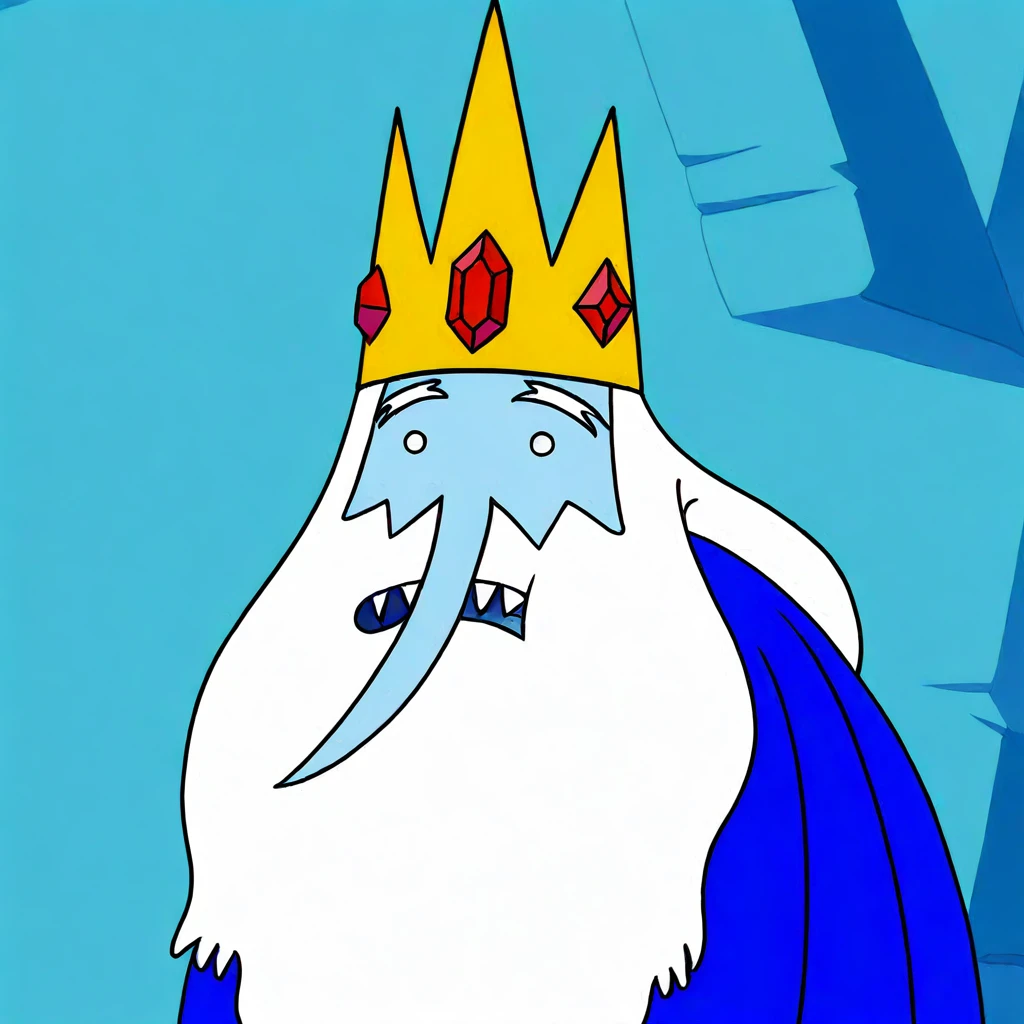 IceKing, 1 boy, White eyes, dot pupils, Crown, white beard, long beard, blue skin, blue tunic,